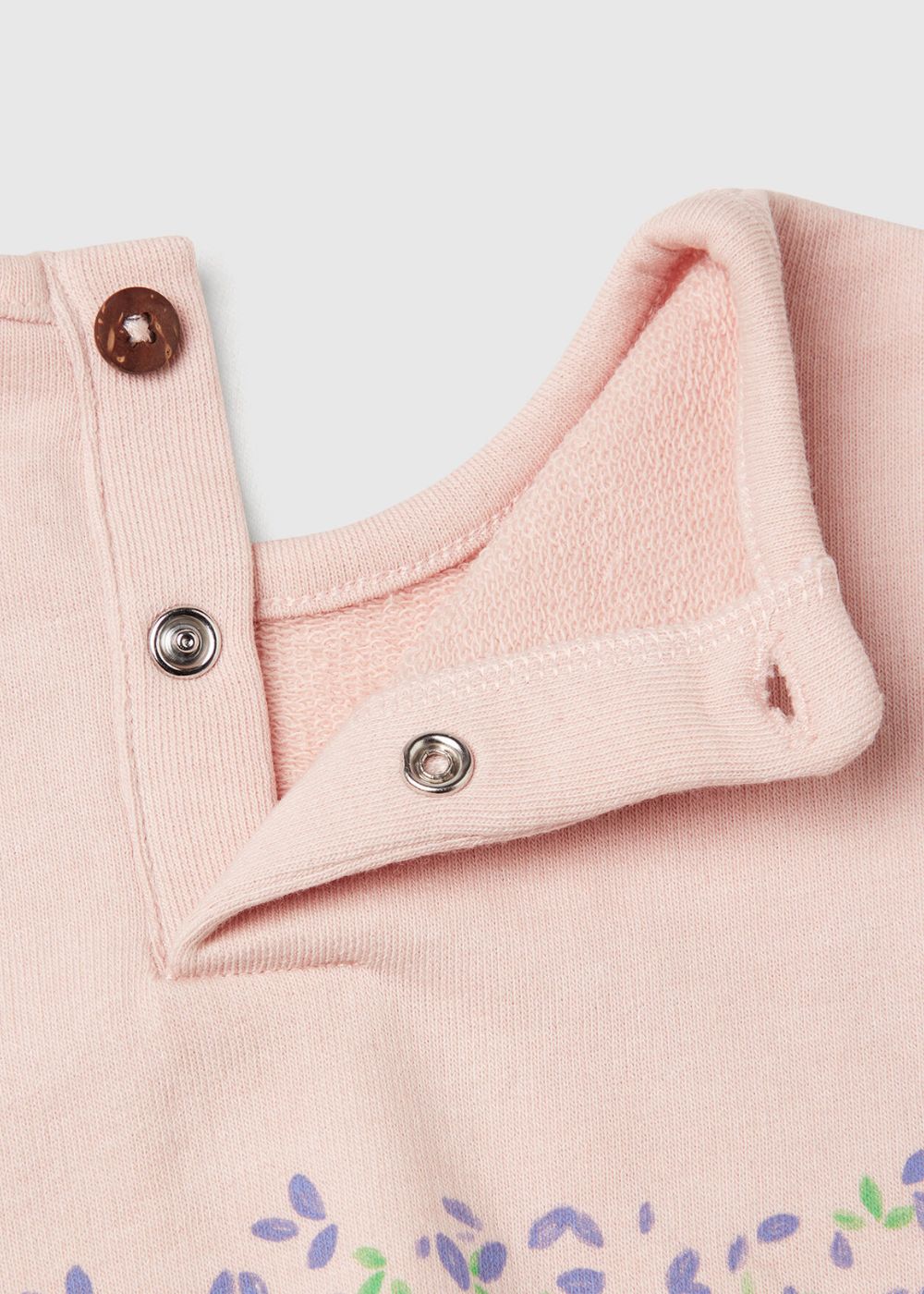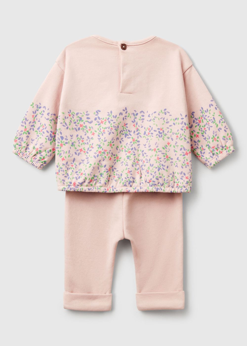 Matching sweatshirt and sweatpants set in soft cotton blend. Long sleeve crew neck top with front and back floral print. Practical opening with back buttons, one visible button and one hidden snap button. Leggings in solid color with elastic waist.