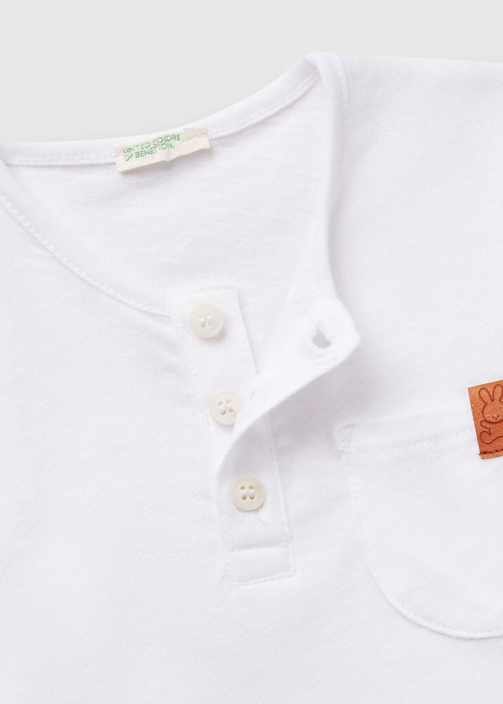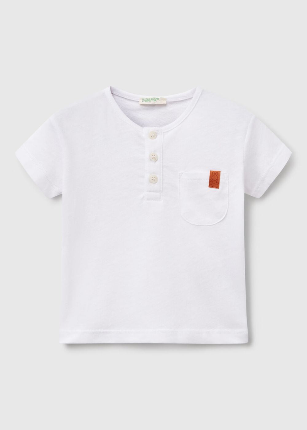 Short sleeve t-shirt in soft cotton and linen blend fabric. Round neck with partial button opening, breast pocket. Comfortable and pleasant on the skin.