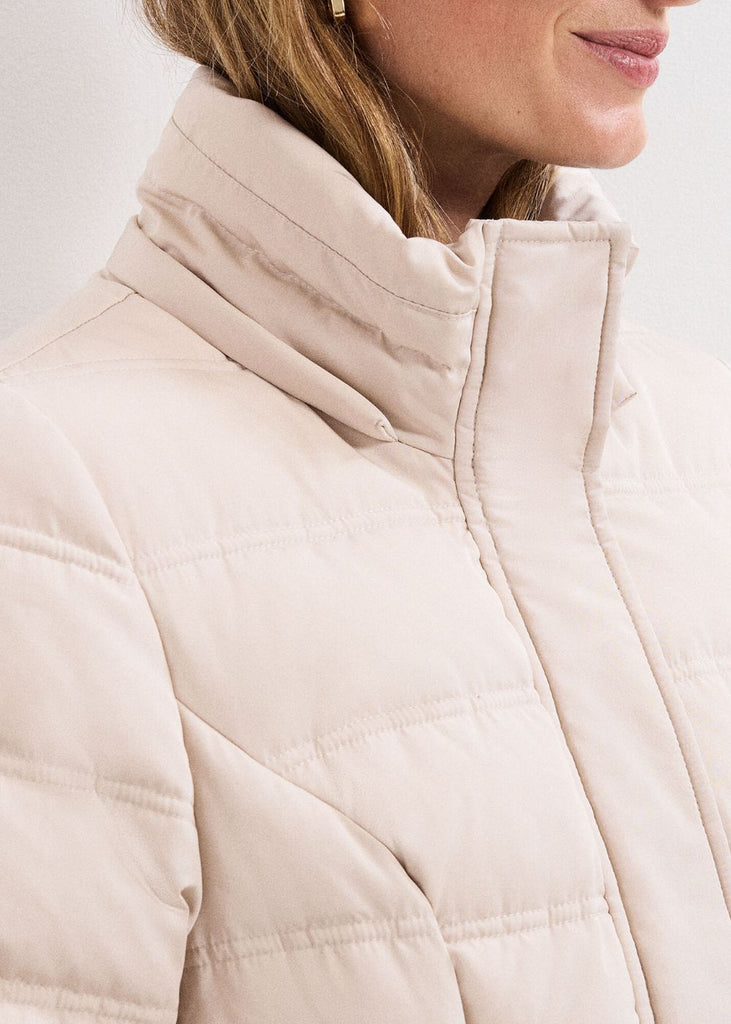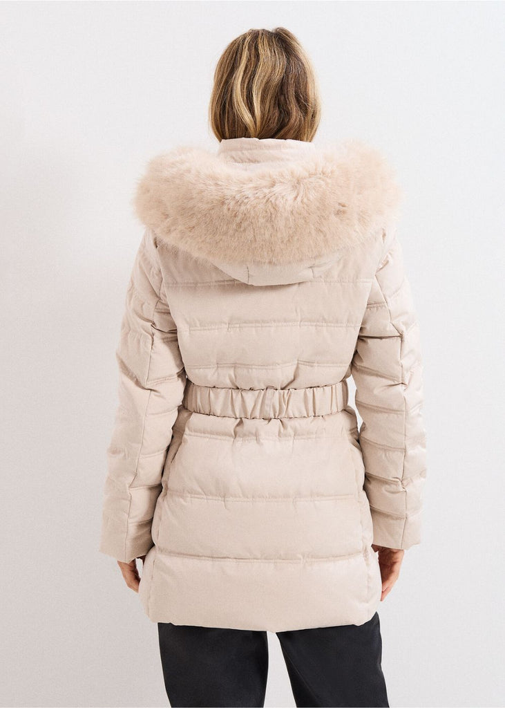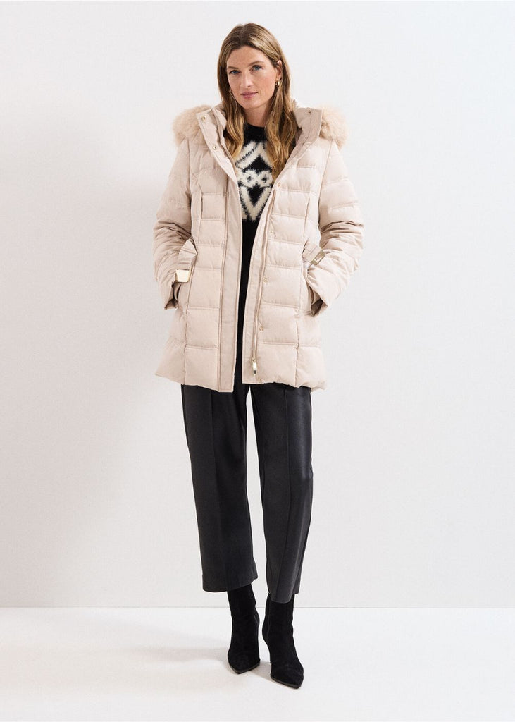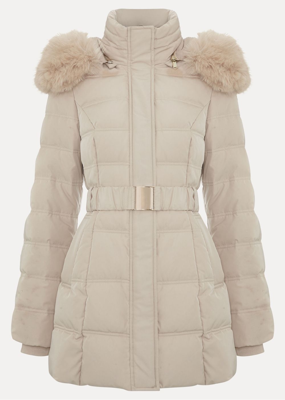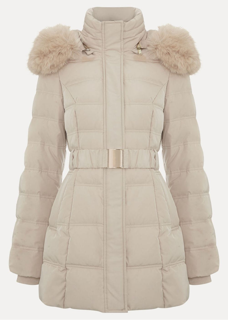 A true AW wardrobe staple, the Dixie cream puffer coat is practical, without compromising on style. With a detachable faux fur hood and ruched elastic belt for creating shape, it’s our way of elevating a classic puffer coat. Made from a showerproof material with ribbed cuffs and both zip and button fastening for insulation, this coat is an essential for the colder months.