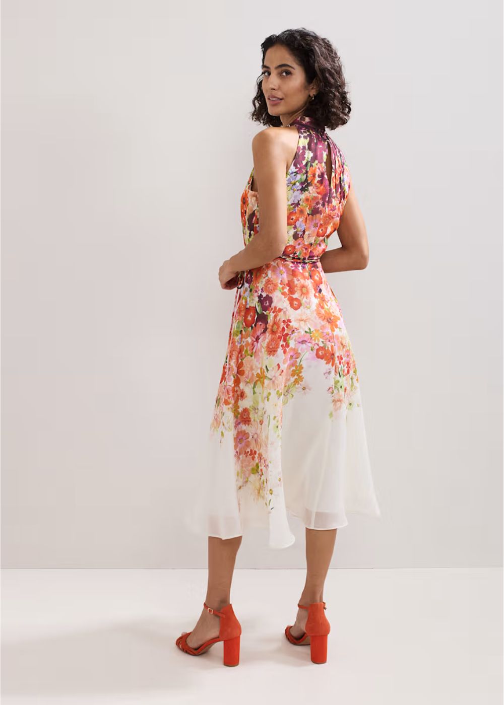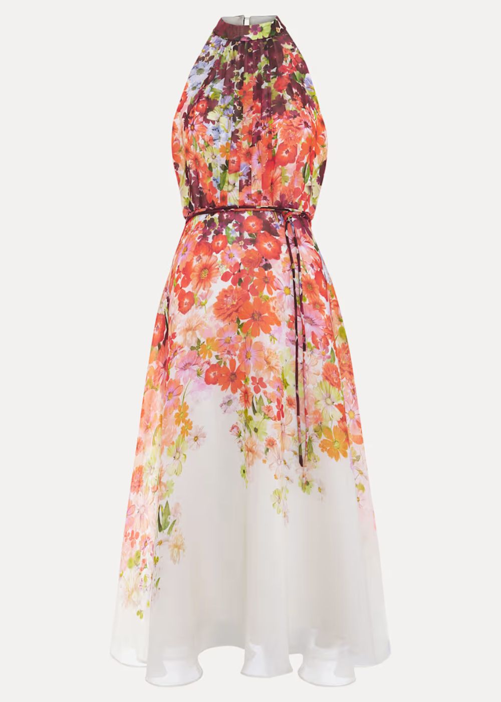 When a timeless silhouette meets a modern floral print, you get this striking halterneck dress. Featuring ombre shades of vibrant berry that highlight the natural movement of the skirt. Add elegance by styling with classic heels and a simple clutch.