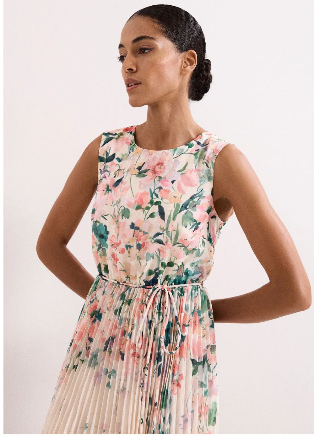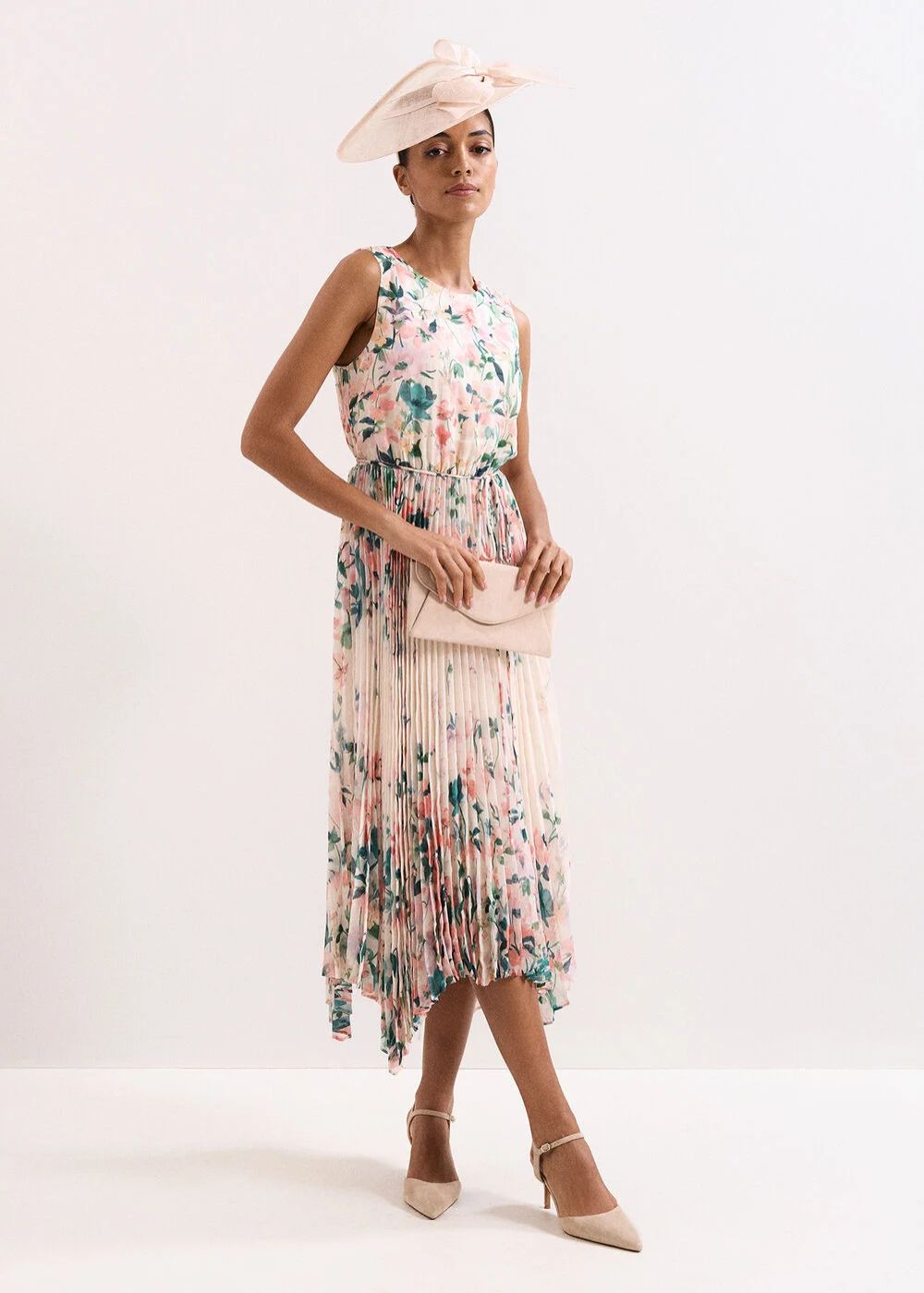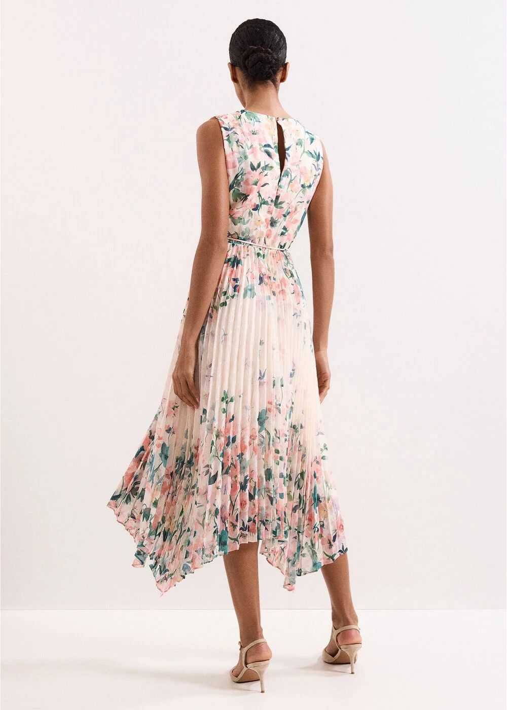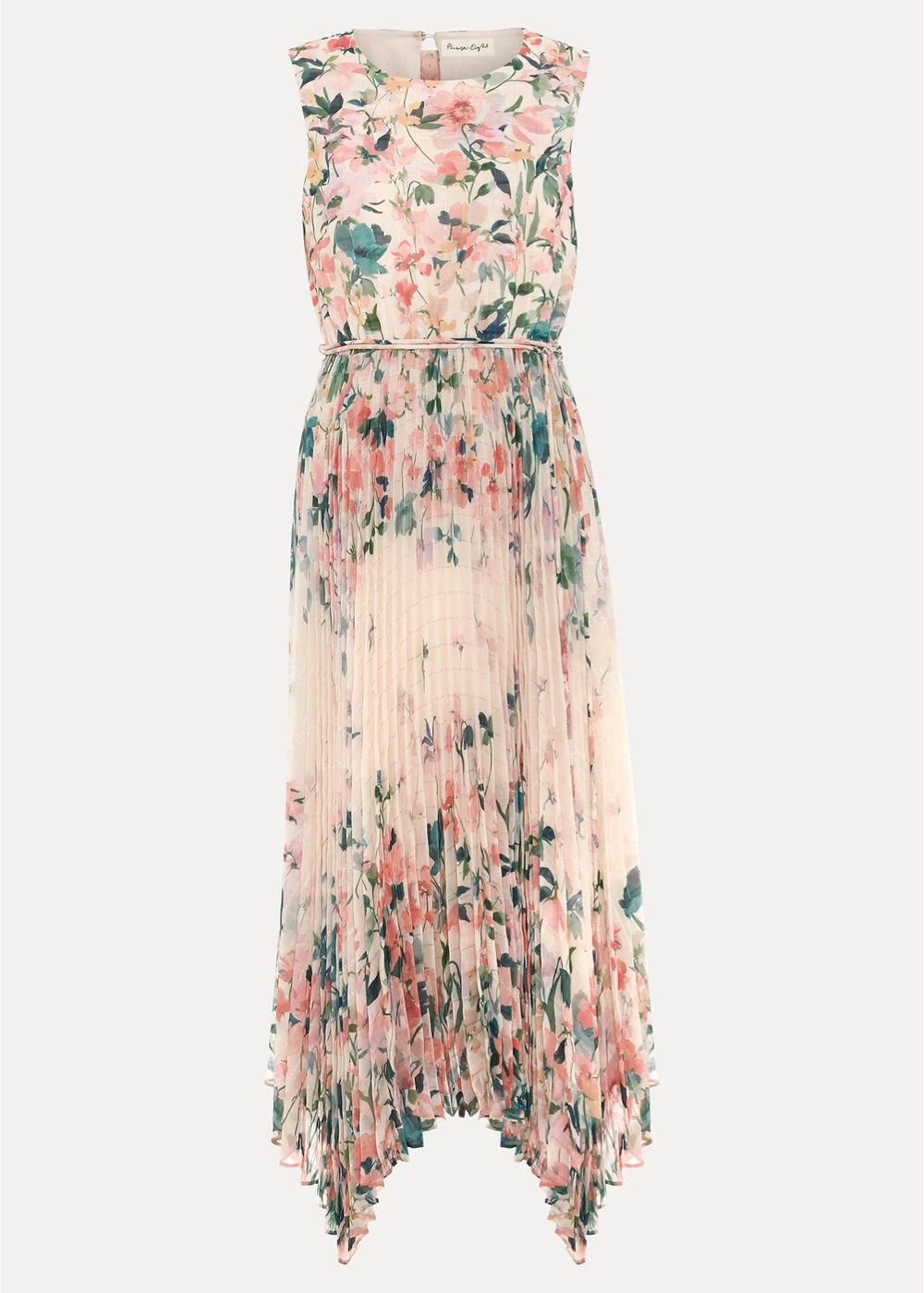 Stunning spring florals decorate the elegant Georgiana dress. Designed in a feminine floral print that was designed in-house by our print designers, further elevated design details include the fully pleated midi skirt and asymmetric hem that creates beautiful fluid movement. In a fresh pastel palette, style with matching accessories for an event look you’ll wear now and forever.