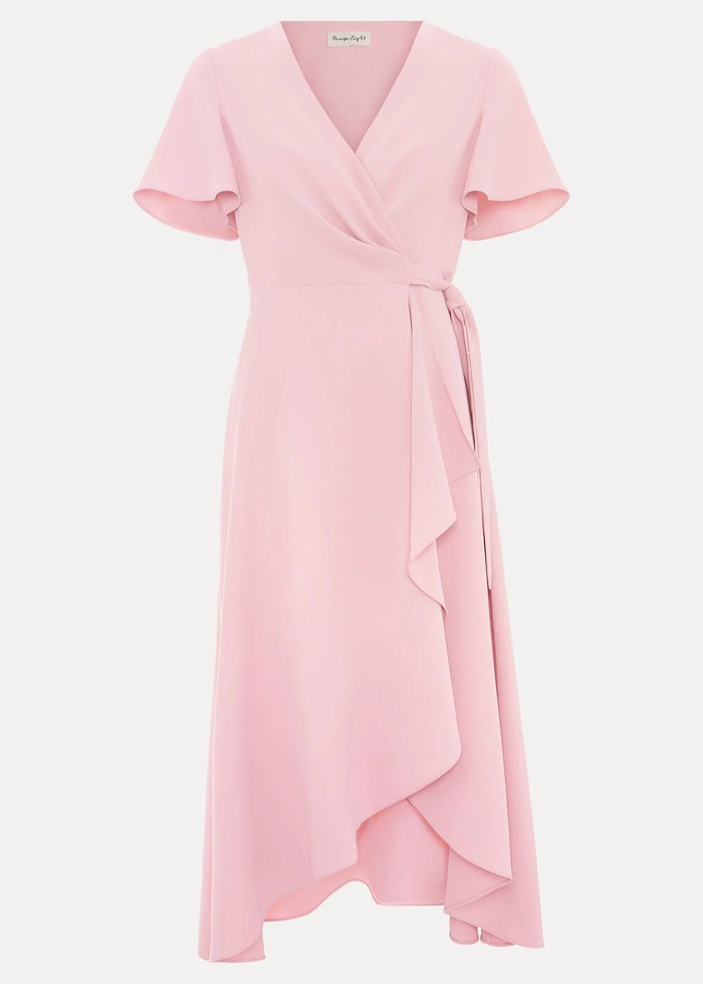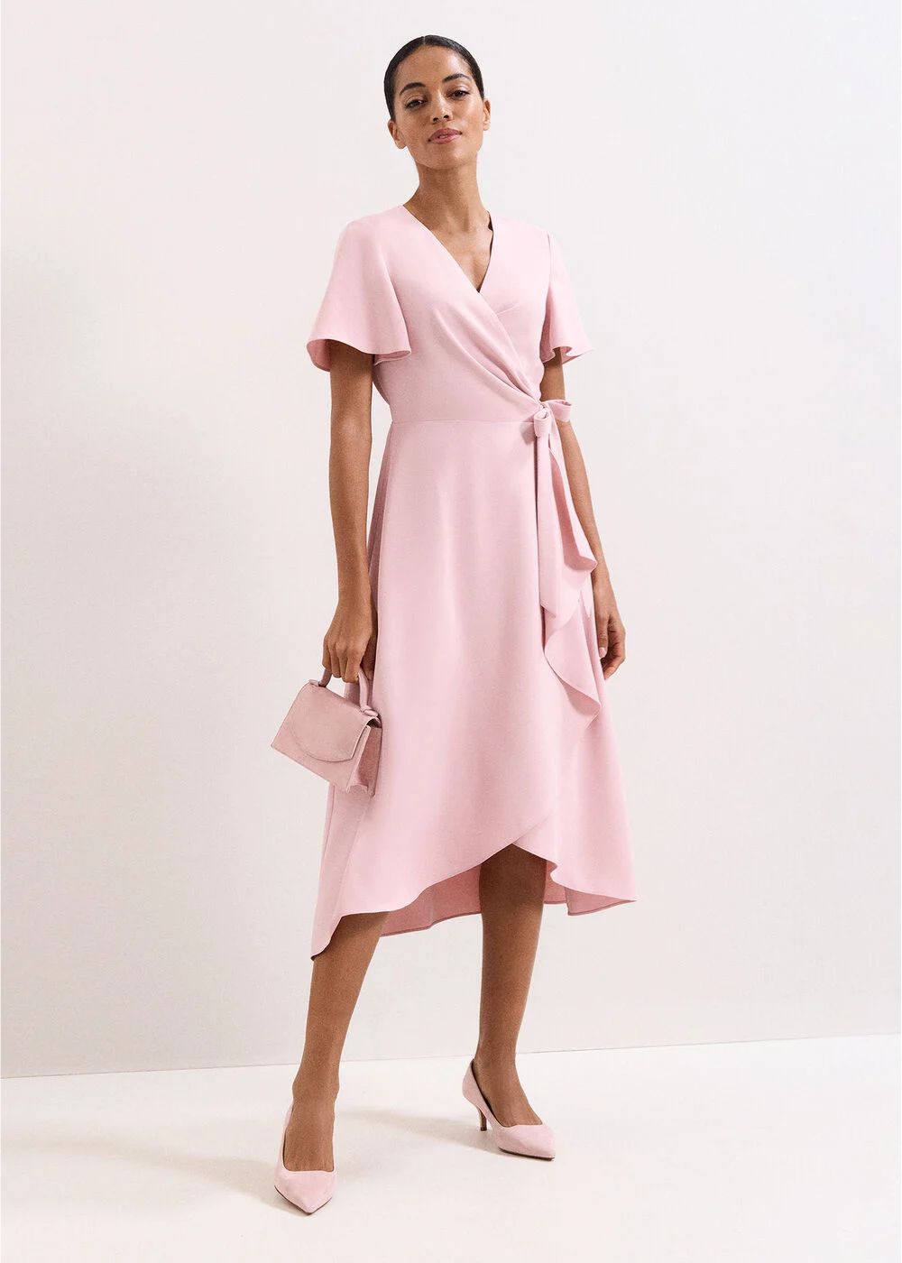 A bestseller for a reason, our signature Julissa dress arrives in a new colour, pale pink. This wrap dress is finished with an asymmetric hem and subtle frill detail for a feminine edge. Pair with matching accessories for an effortless event look.