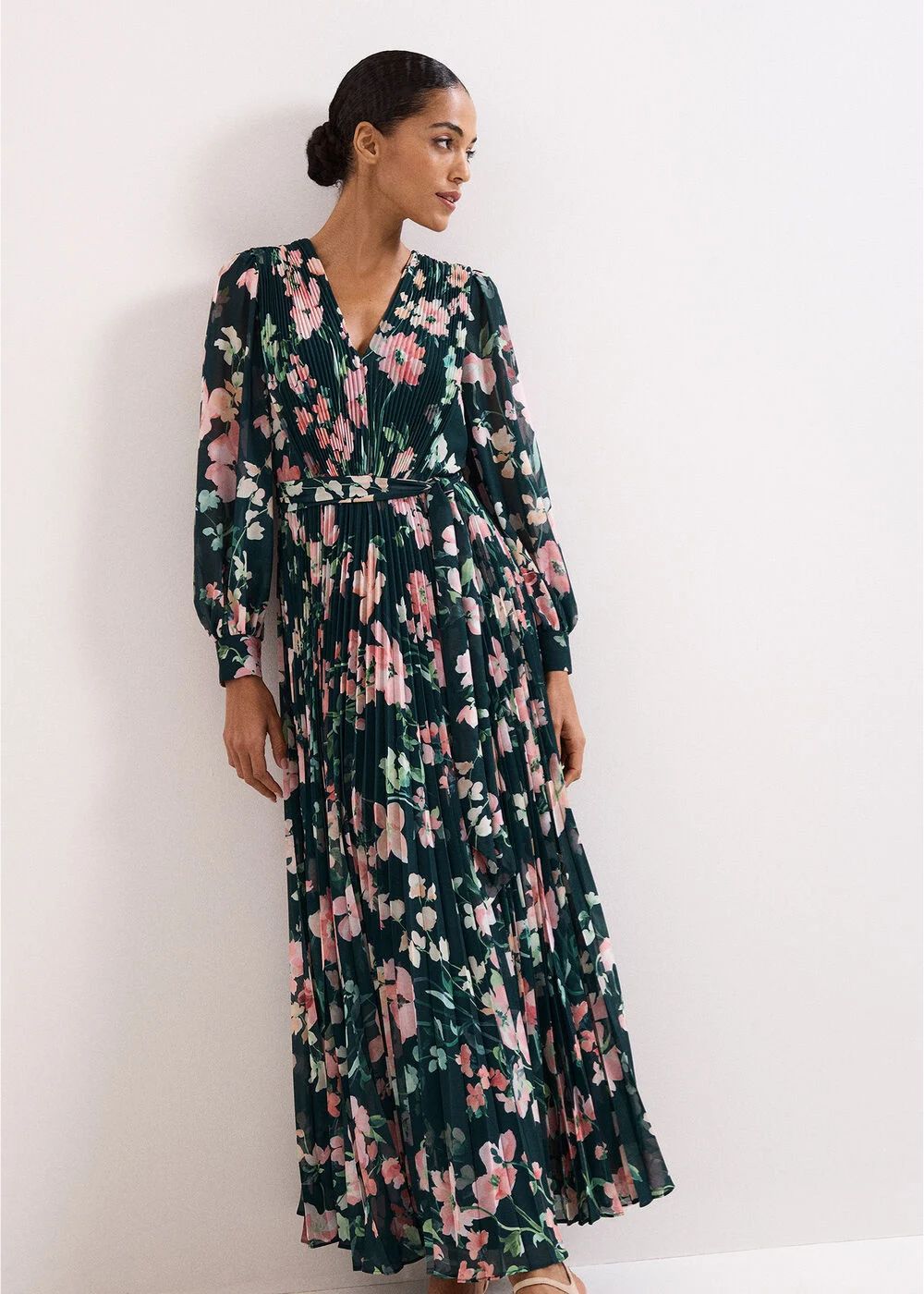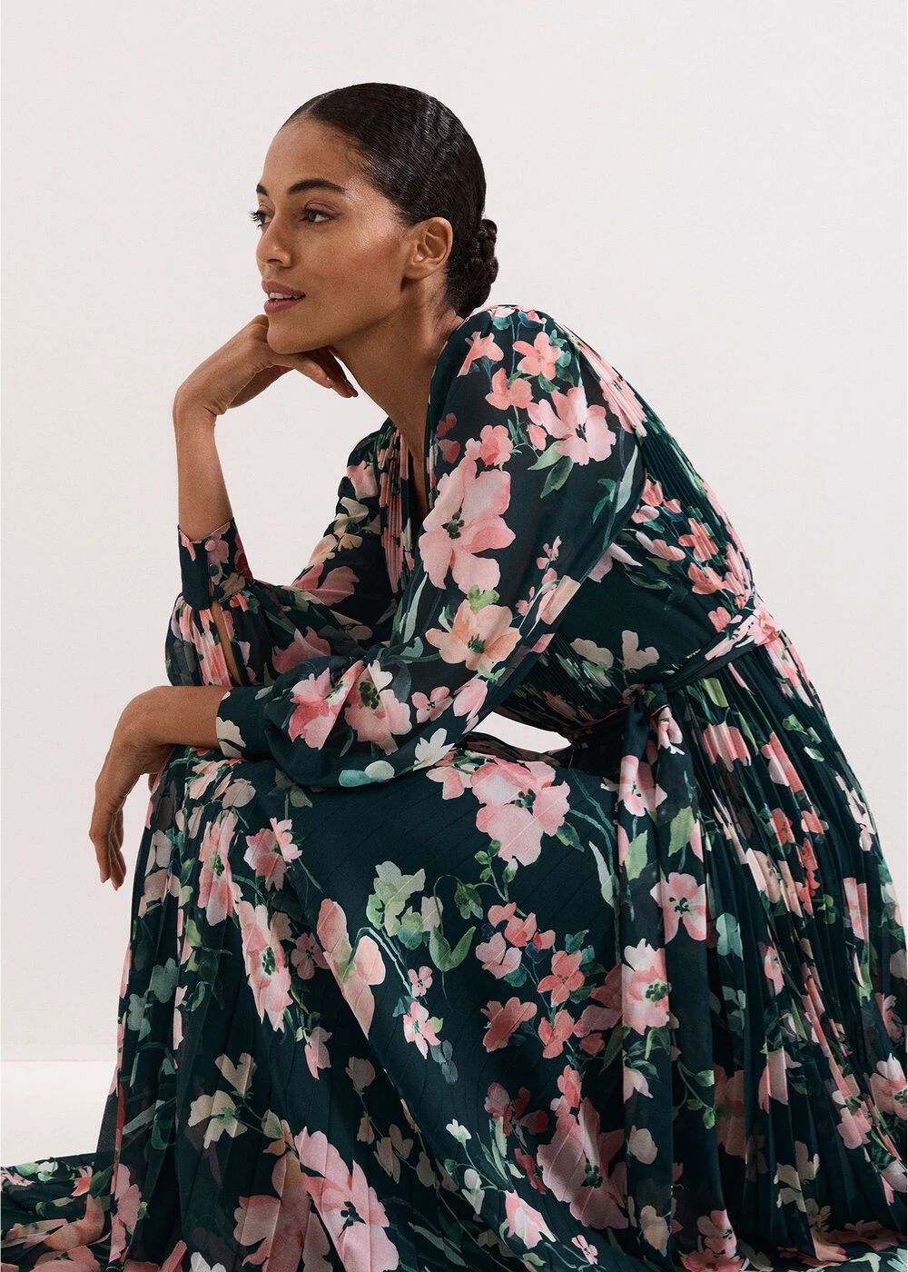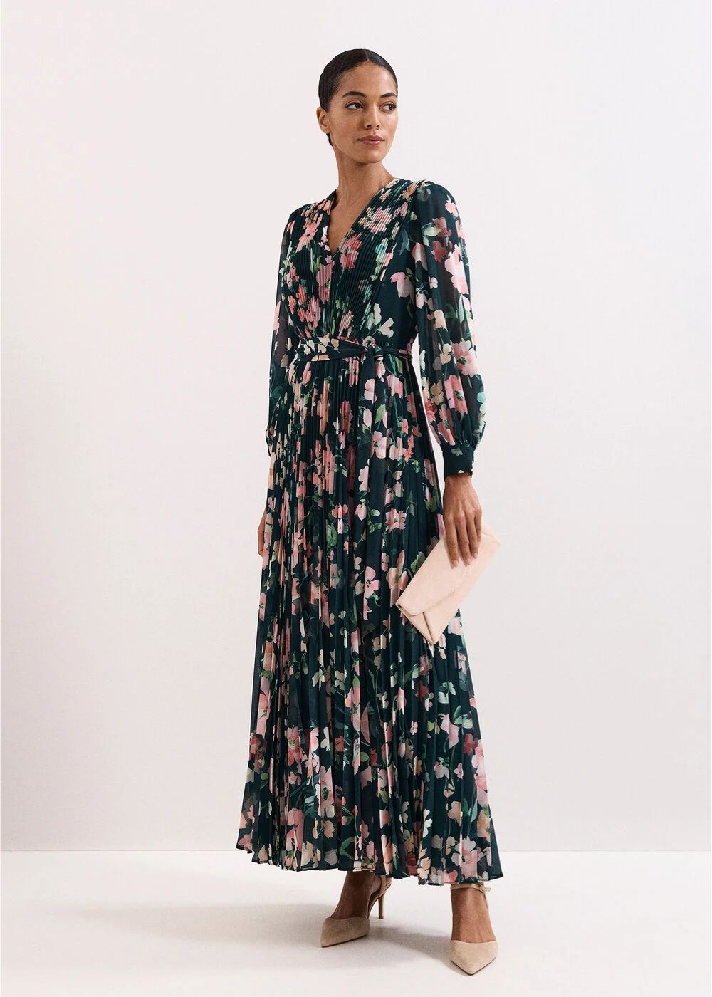 The ultimate floral dress, perfect for Spring events. Designed in a dark green, this maxi dress features feminine pink florals, a flattering wrap bodice which falls to a flowing, fully pleated skirt. With blouson sleeves and a matching tie belt to enhance the silhouette, wear this dress with matching or neutral accessories for an elegant event look.