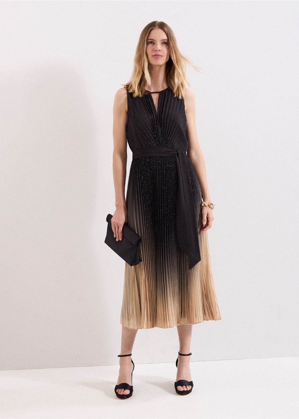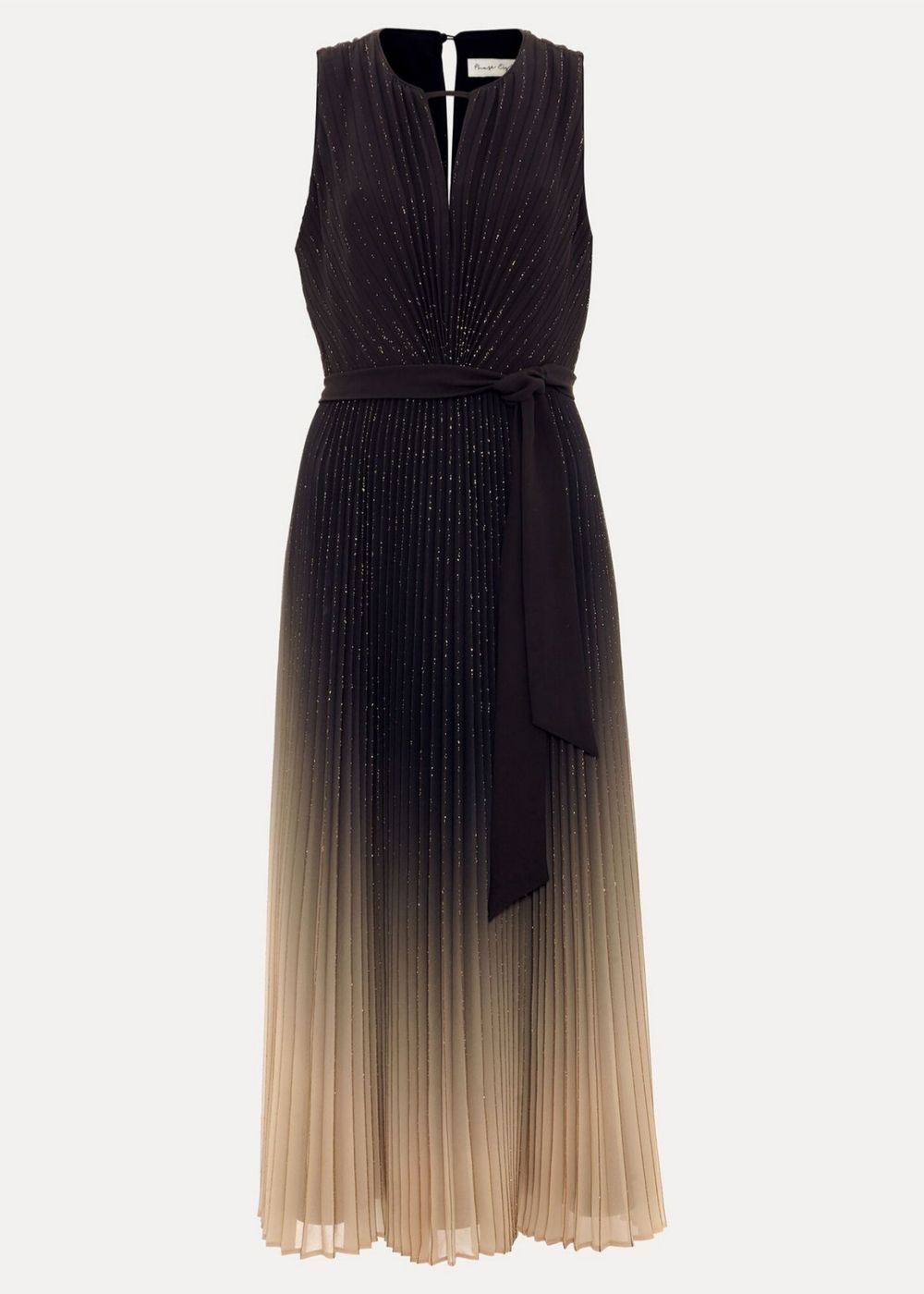 Our bestselling Simara dress arrives in a new black and gold ombre. Updated with a modern eyelet detail at the neckline it flows to a midi silhouette, accentuated by soft pleating throughout. The classic colour combination and touch of sparkle will work at special events year round, simply add your favourite matching accessories.