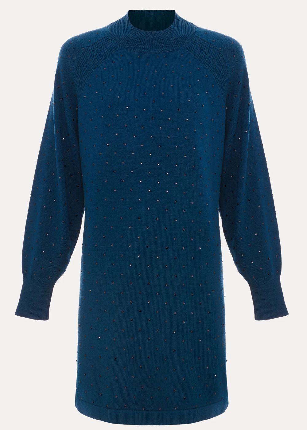 Designed in a rich blue, this knitted jumper dress is the classic mini your wardrobe needs. Considered detailing includes a high round neck, long blouson sleeves and stud finishes elevates the style to create a contemporary look you’ll be wearing again and again this season.