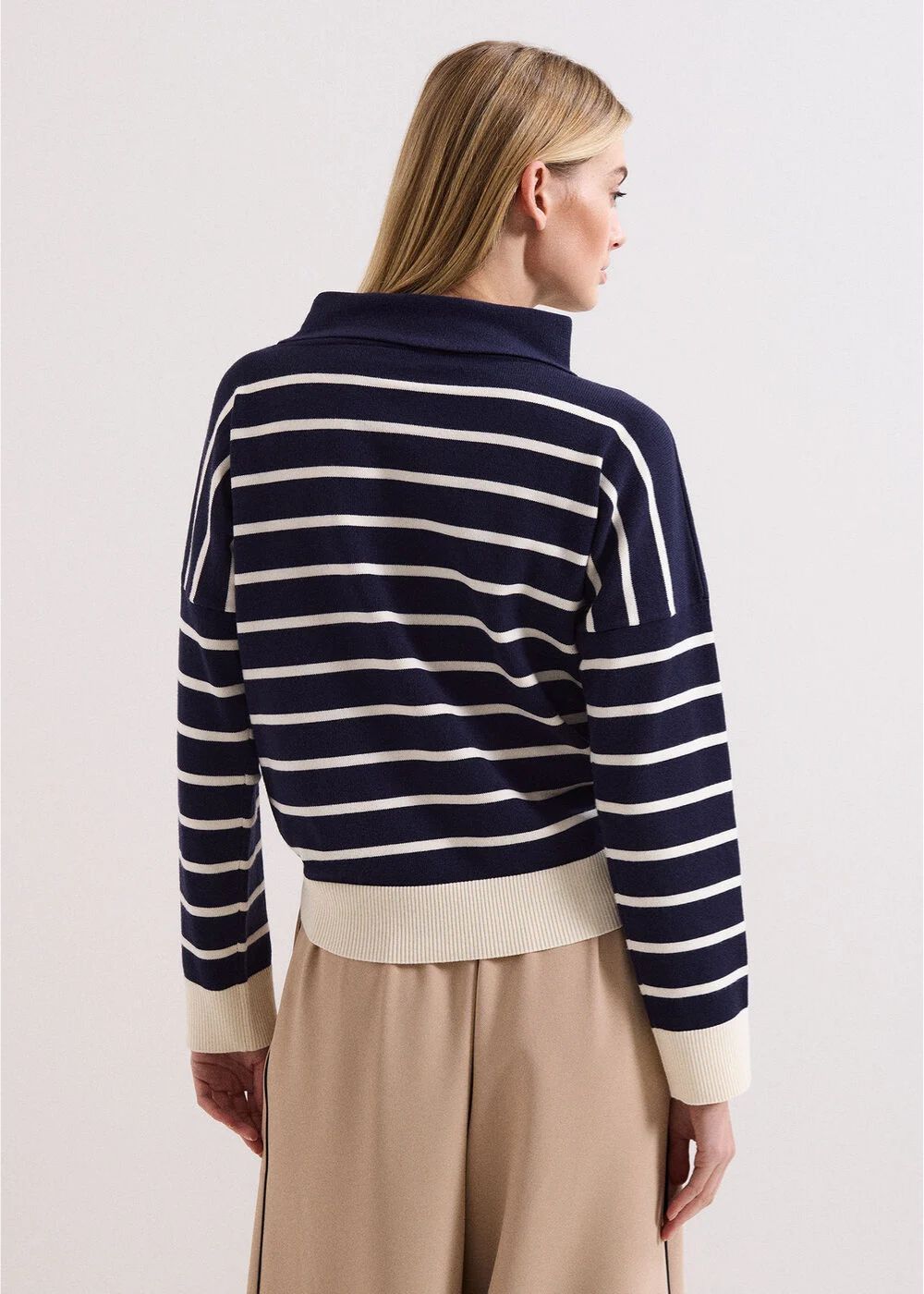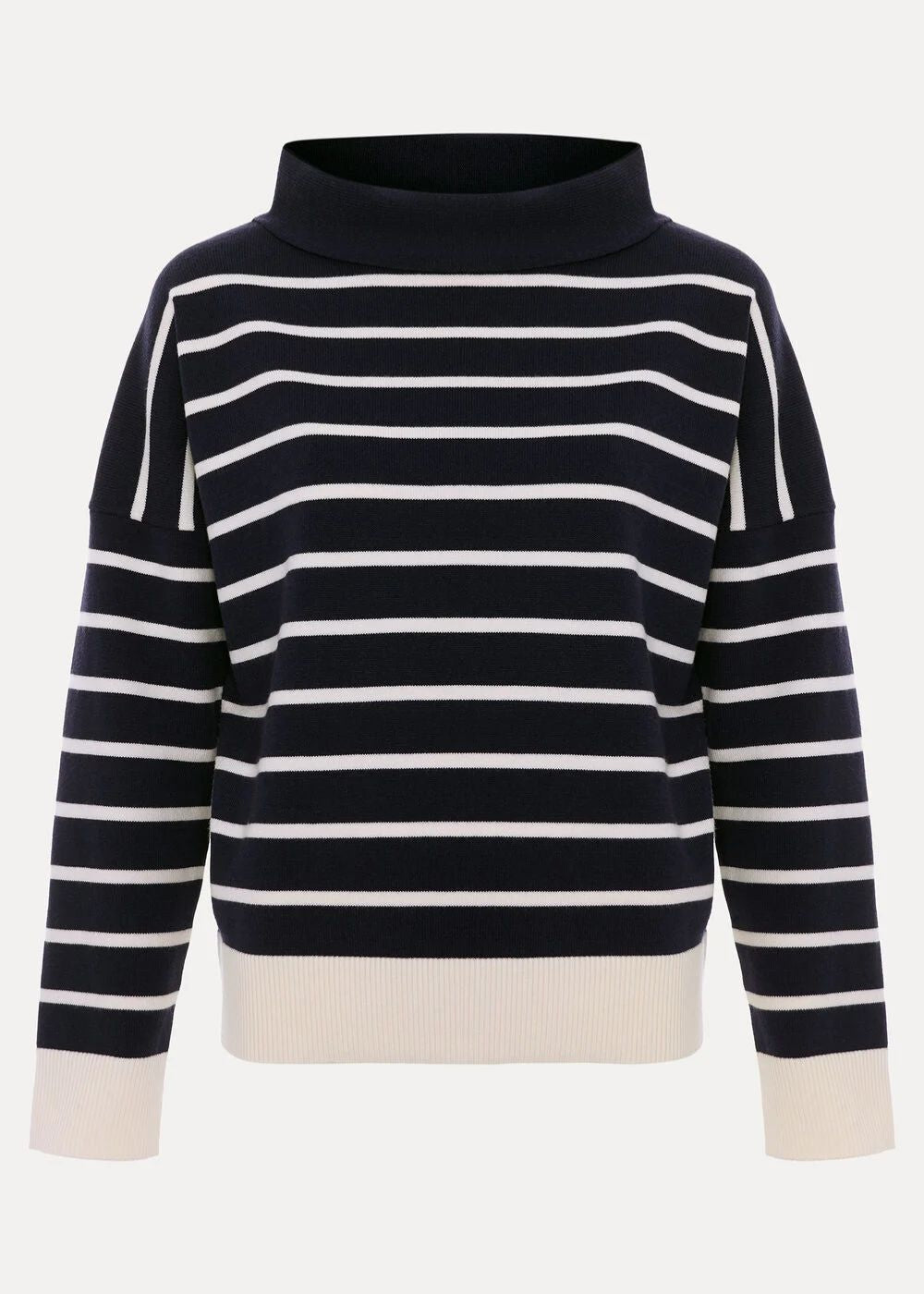 The wardrobe staple every woman needs, a striped jumper. In the timeless colour combo of navy and cream, this knitted jumper is made from a super soft of hand fabric and features a modern rolled neckline and contast ribbing to the cuffs and hemline for a chic finish. Versatile but cool, wear with your favourite trousers, jeans and skirts for an effortless everyday look.