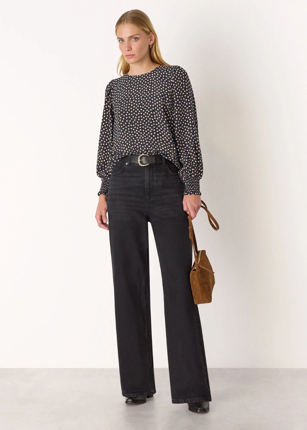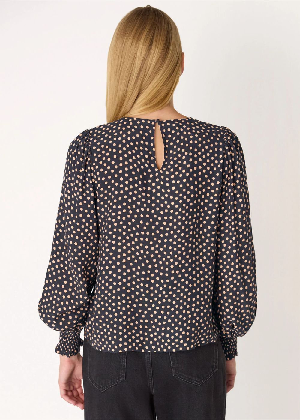 Print lover? Our Spot Shirred Cuff Blouse is made just for you. In a timeless base shade with playful contrasting spots, it features shirred cuffs on subtle balloon sleeves and a delicate back keyhole detail. Its relaxed fit offers an airy, comfortable feel, perfect for pairing with tailored trousers, jeans, or skirts for effortless style.