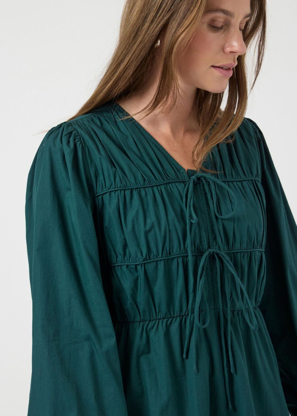 Crafted from breathable cotton, the YASEBBA LS Dress combines comfort with elegance. Its V-neck frames the neckline gracefully, while balloon long sleeves with elastic cuffs add refined volume. Featuring a drawstring fastening and a delicate bow detail at the waist cutline, this short dress offers a standard fit that effortlessly flatters your silhouette. Ideal for sophisticated occasions, it balances ease and style with a timeless appeal.