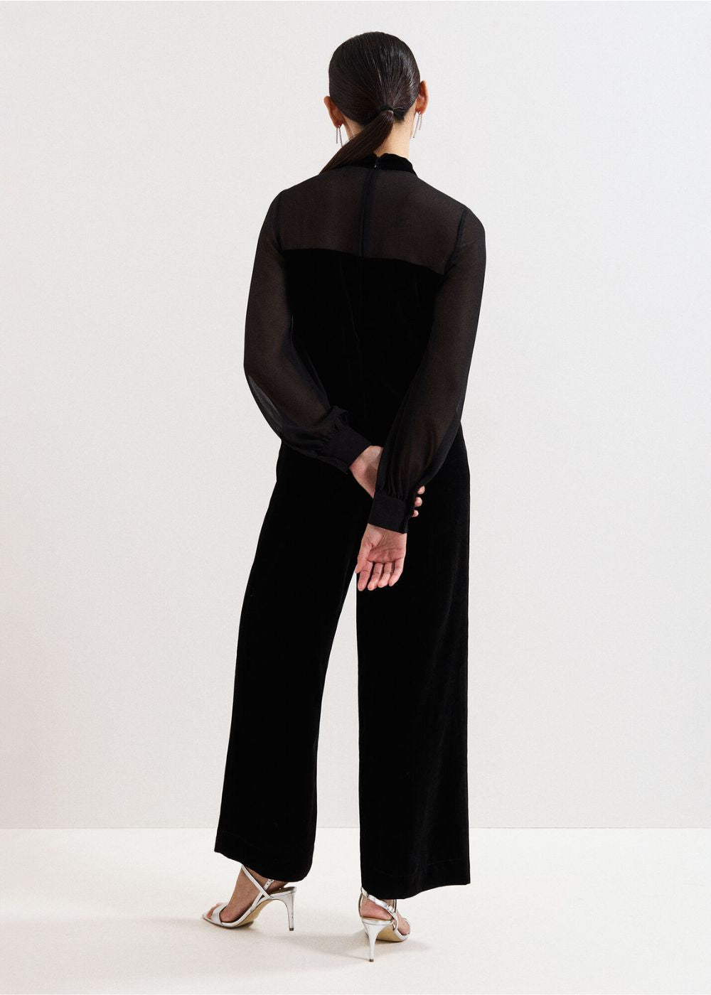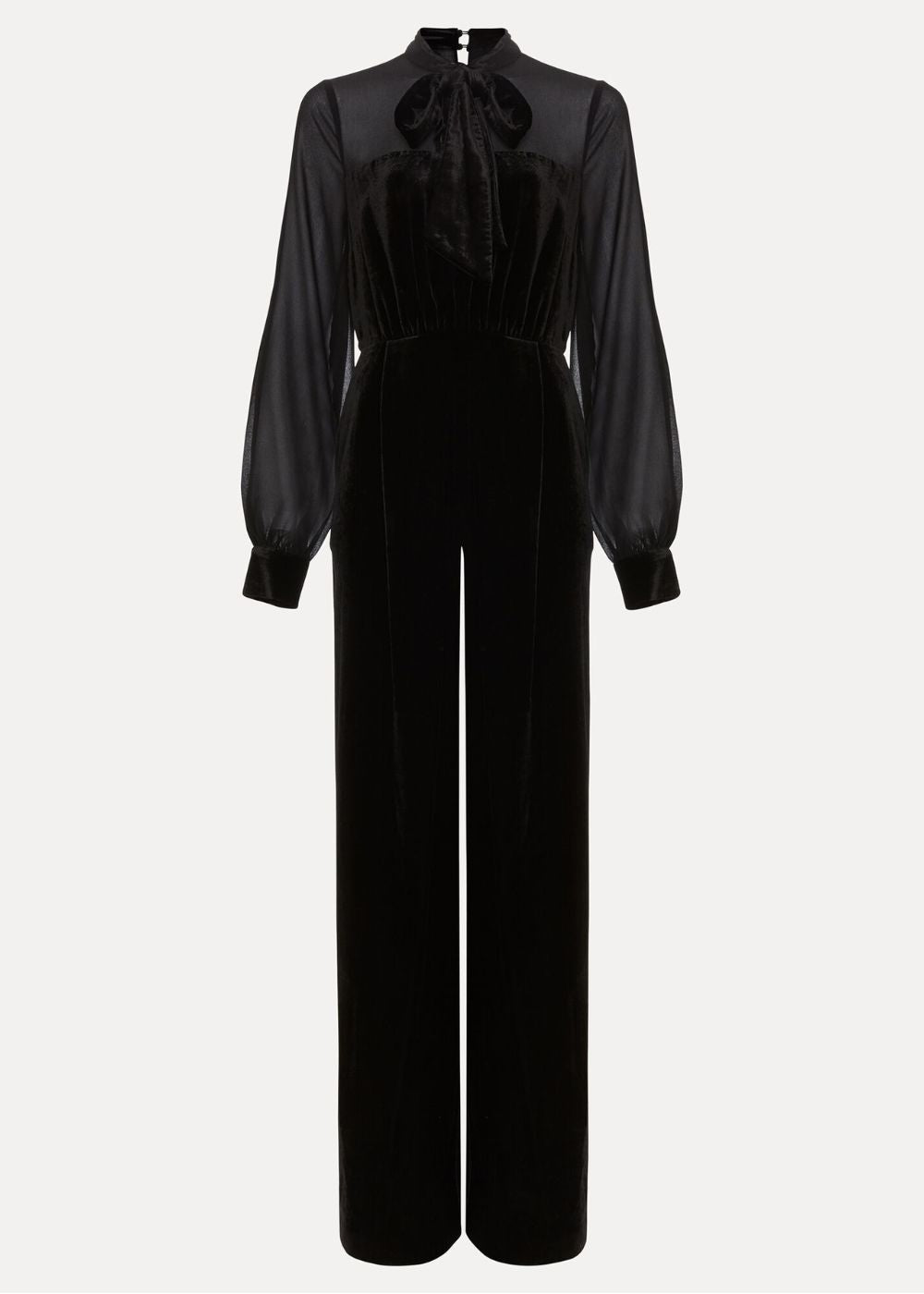 Tux-inspired detailing meets a classic black-tie silhouette with our velvet jumpsuit. The elegant semi-sheer yoke is embellished with a feminine pussybow detail for a touch of statement flair. Flowing through to an effortless wide leg silhouette we style ours with matching silver heels and a clutch for a sophisticated aesthetic.
