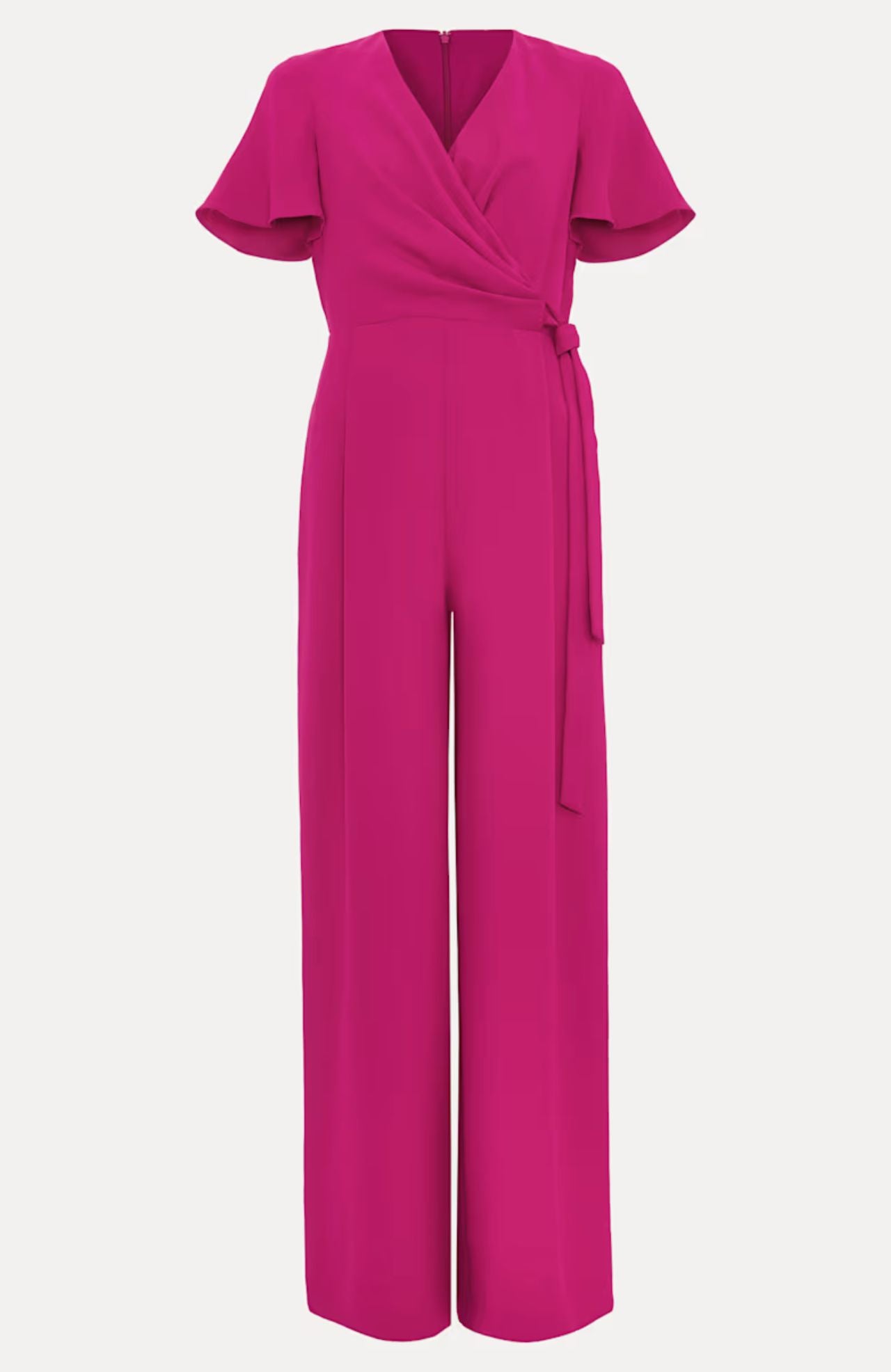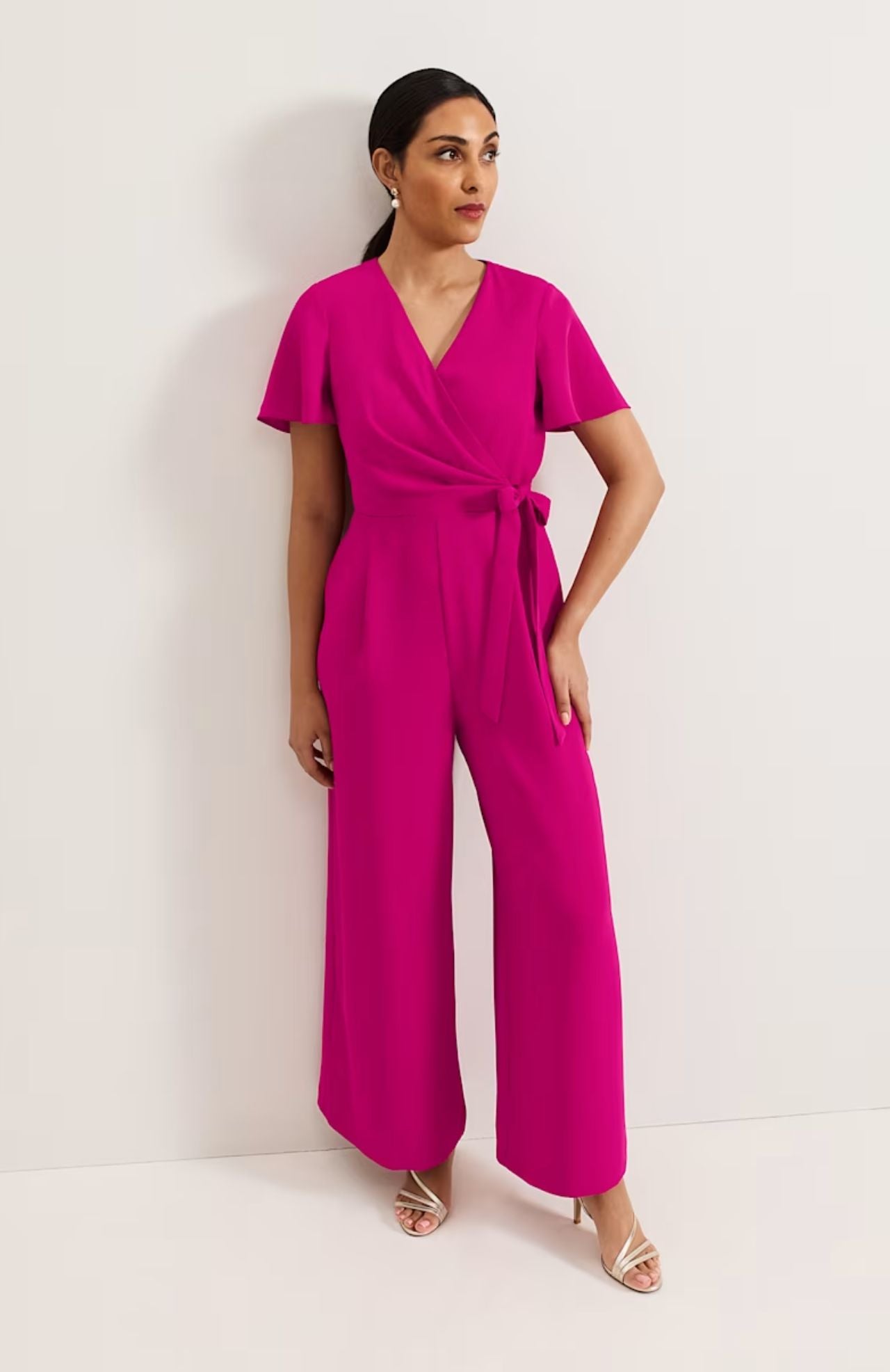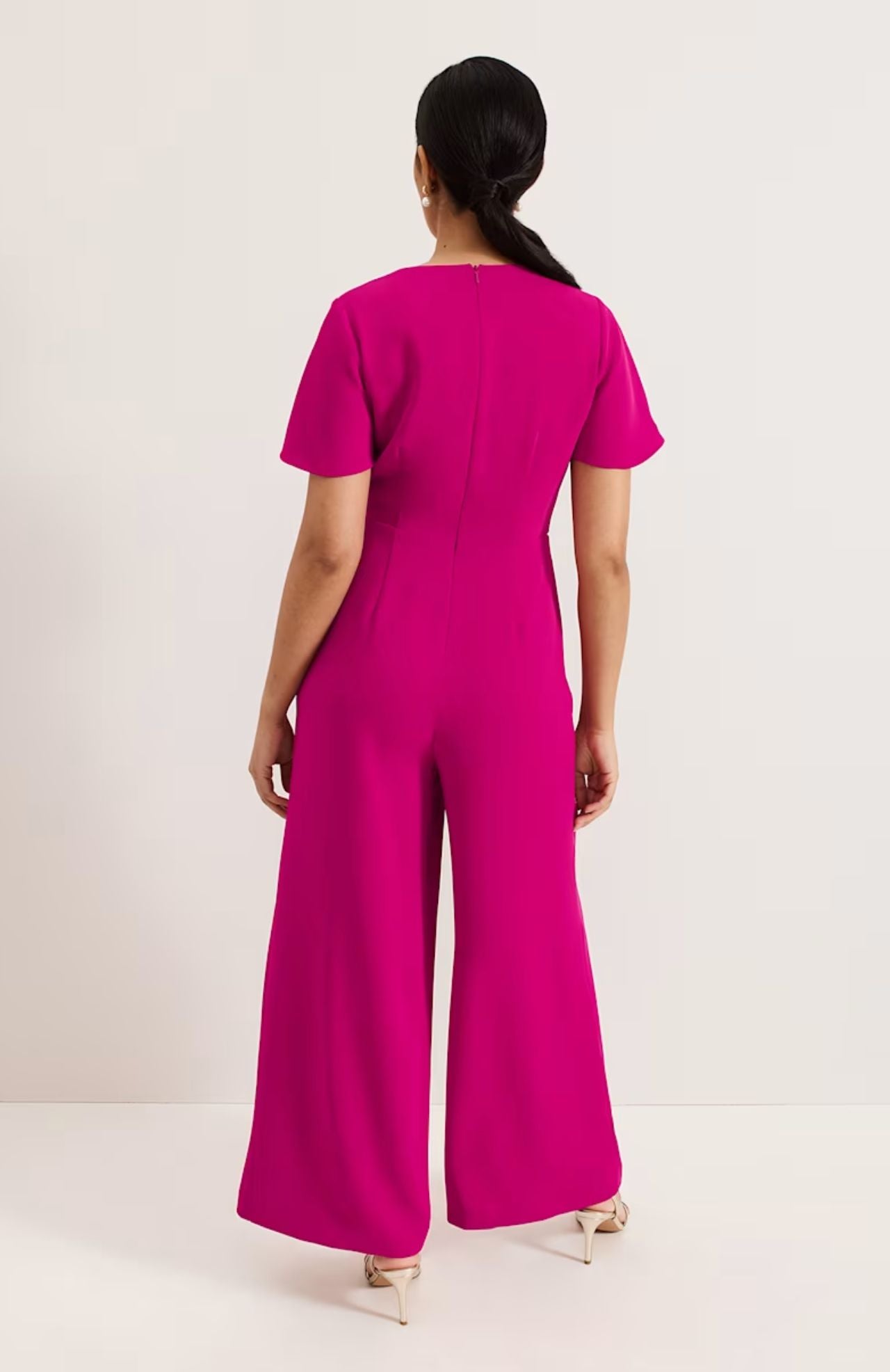 Say hello to the versatile look that works for any occasion. Made from a berry pink crepe fabric, our Julissa jumpsuit is designed in a faux wrap style, embellished with a bow detail at the waist. Flowing through to a wide leg silhouette we style it with ivory heels and a matching clutch.