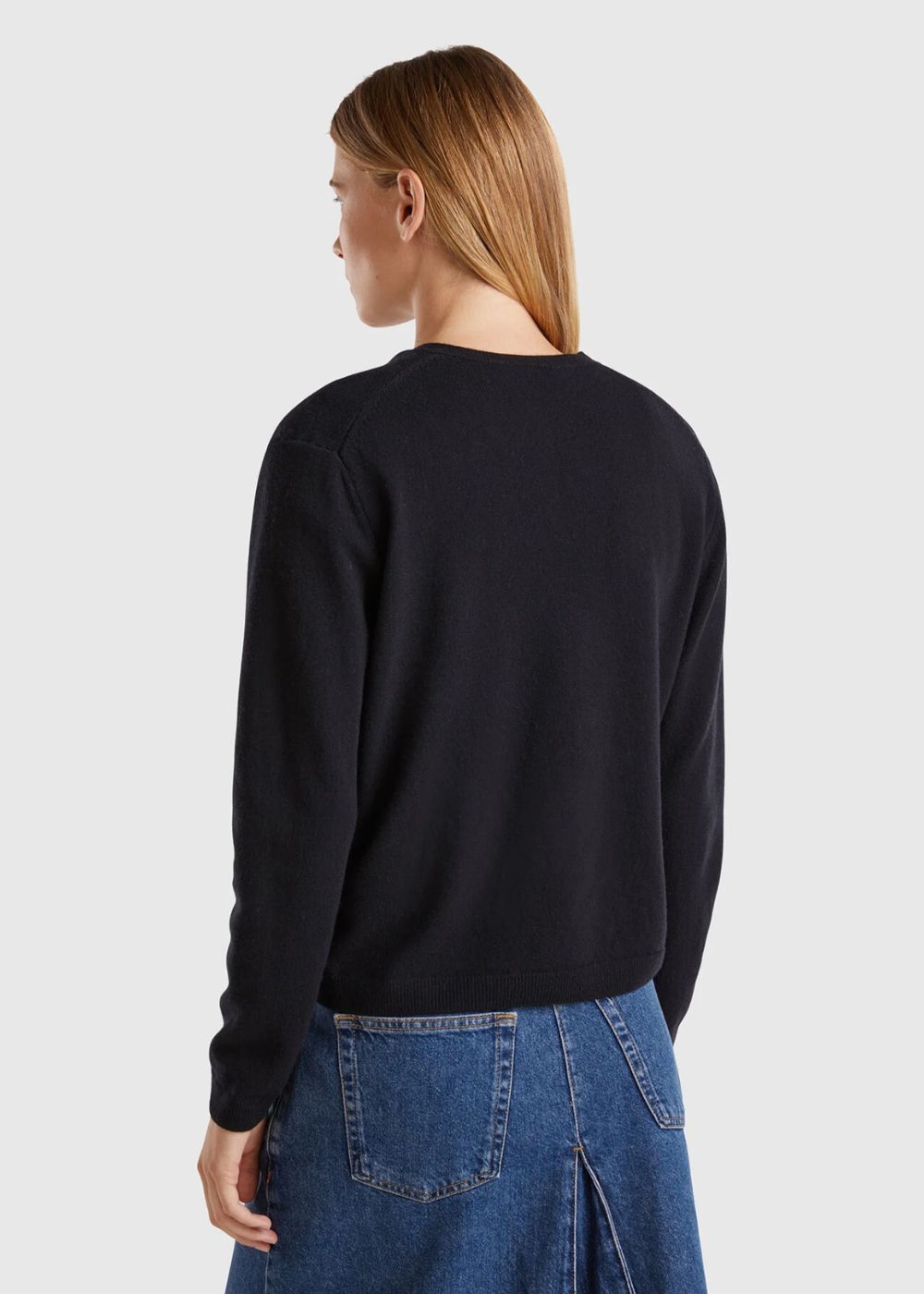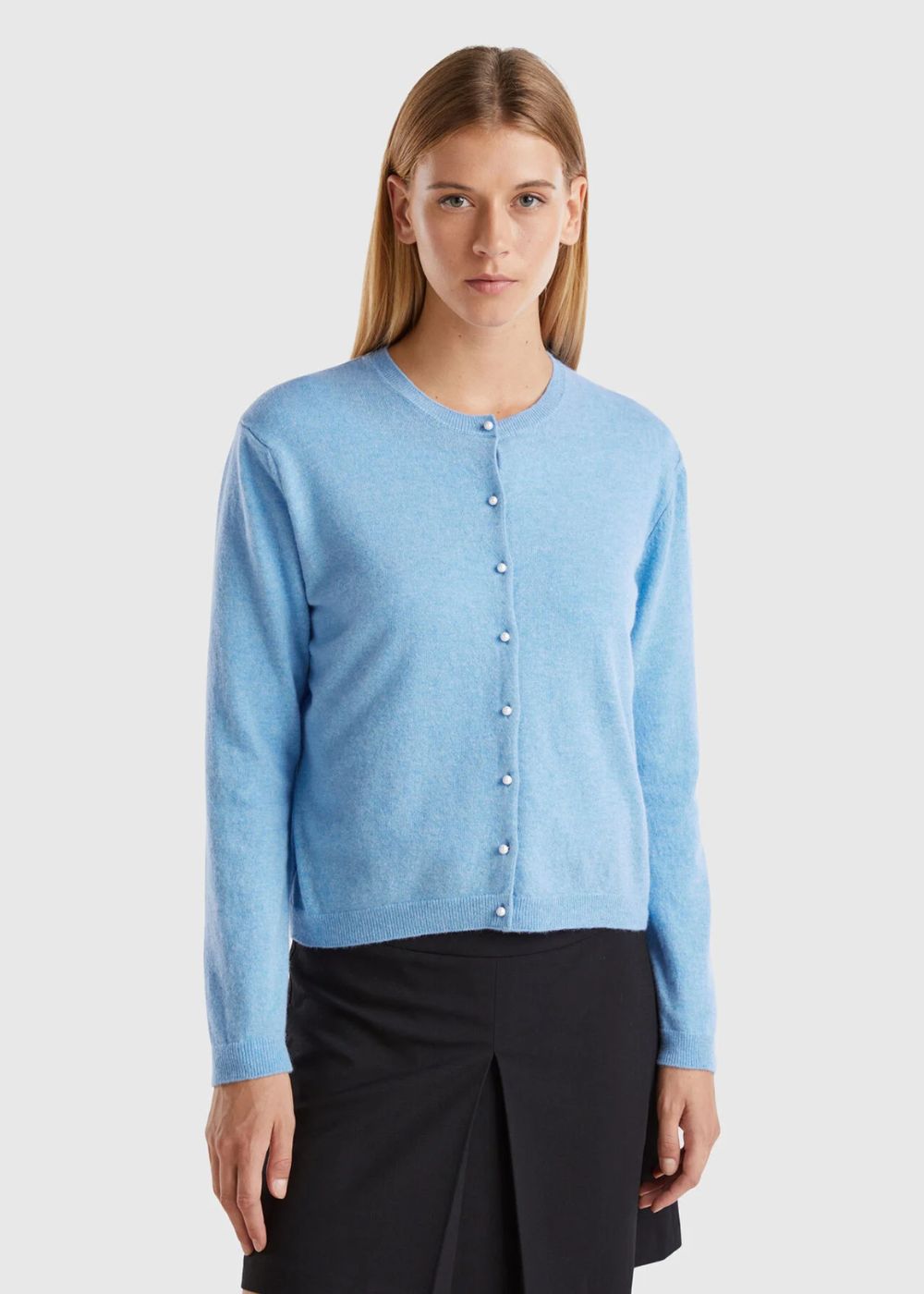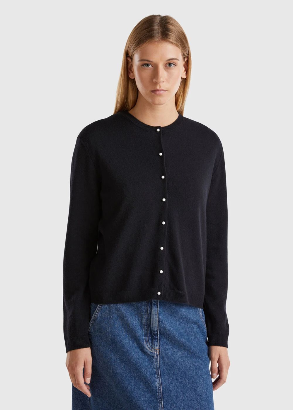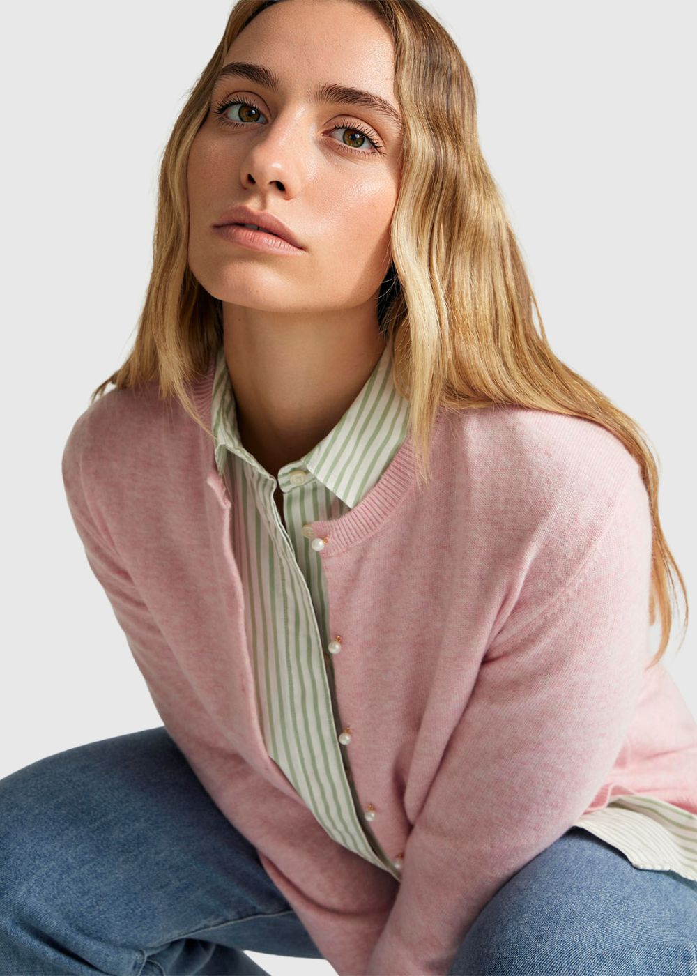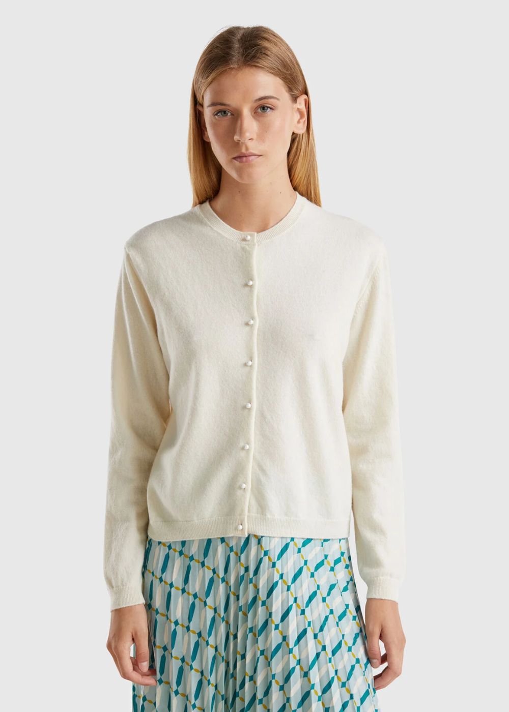 Cardigan in pure Merino wool, warm, light and pleasant to the touch. Regular fit with round neck and long sleeves. Front opening with pearl-look buttons. The presence of the Woolmark logo guarantees the high quality of the garments through the application and monitoring of specific standards in the production of wool, from breeding to the final product.