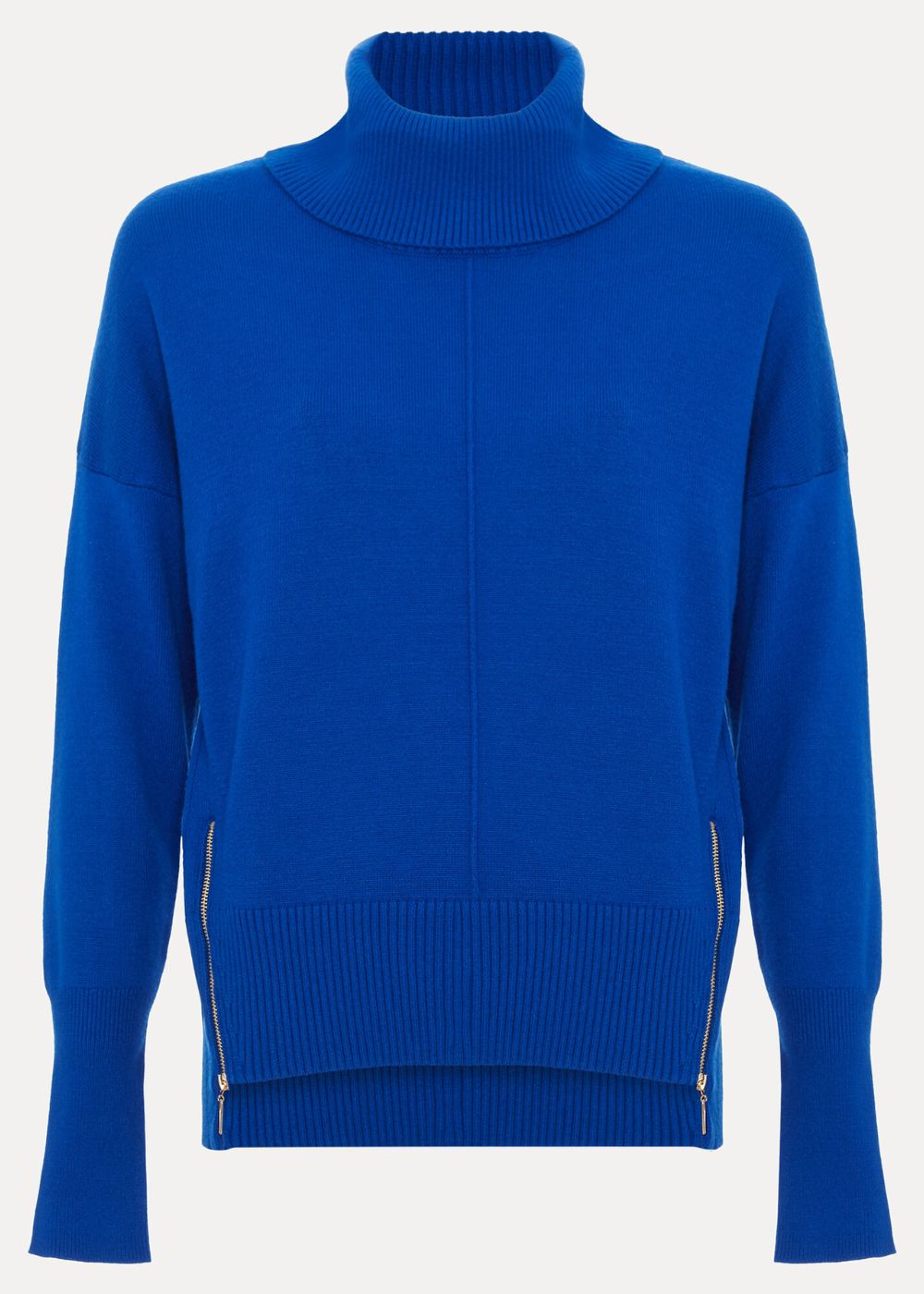 This knitted rollneck jumper will be a constant companion this season. In a vibrant cobalt that we love for brightening grey days it’s refined with ribbed detailing to create a subtly fitted shape. Finished with gold zips for a modern edge it’s sure to become a work to weekend staple.