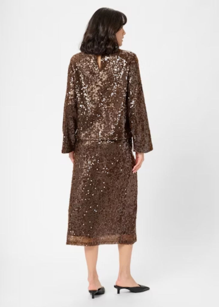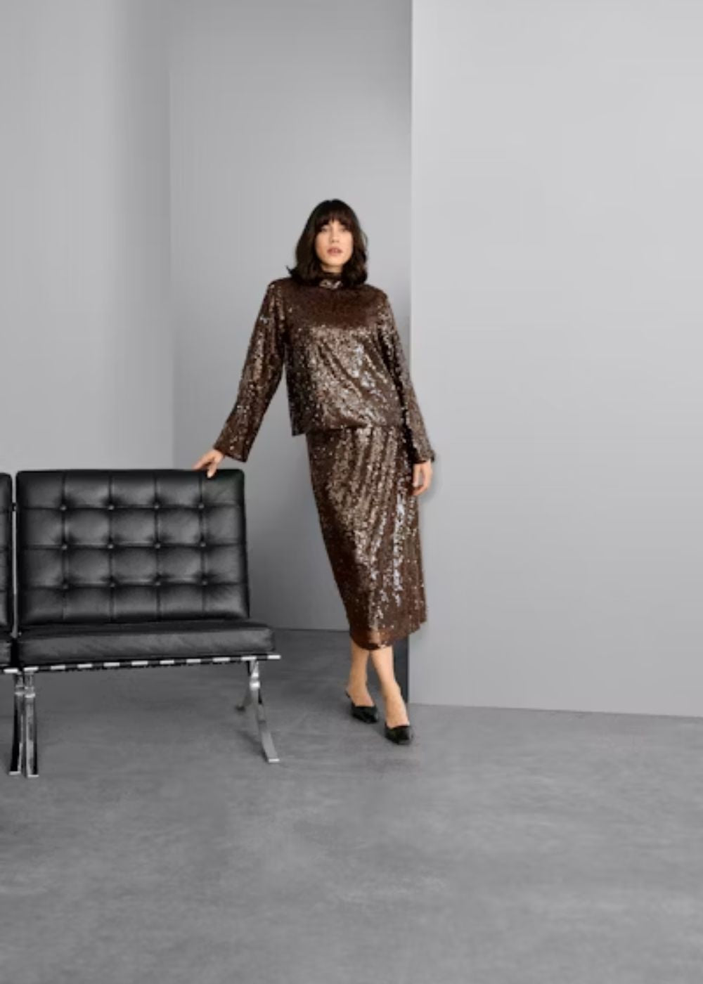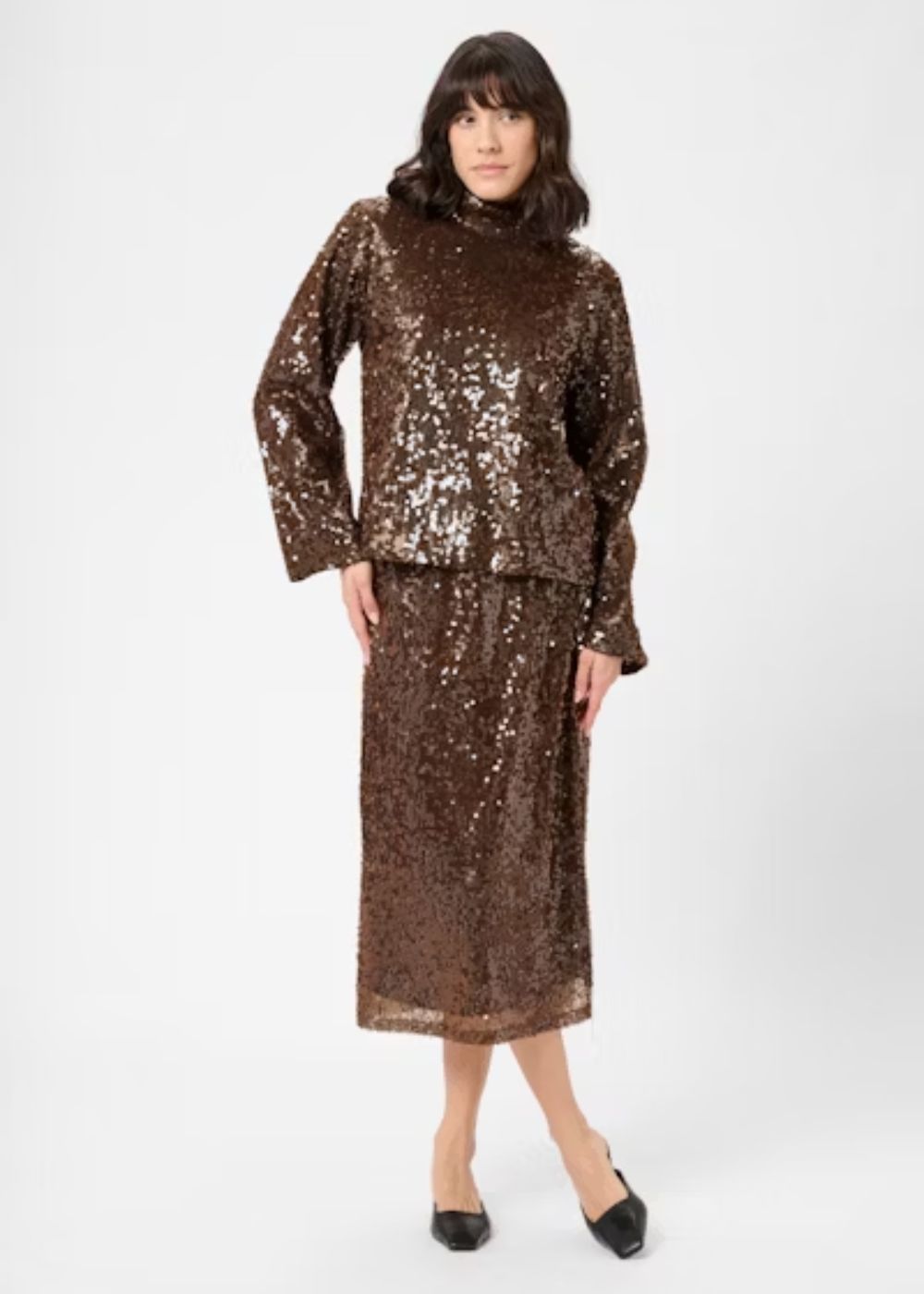 Sequin top featuring a mock neckline, straight silhouette, and full-length wide sleeves. Sparkling finish and back zip closure add contemporary edge.