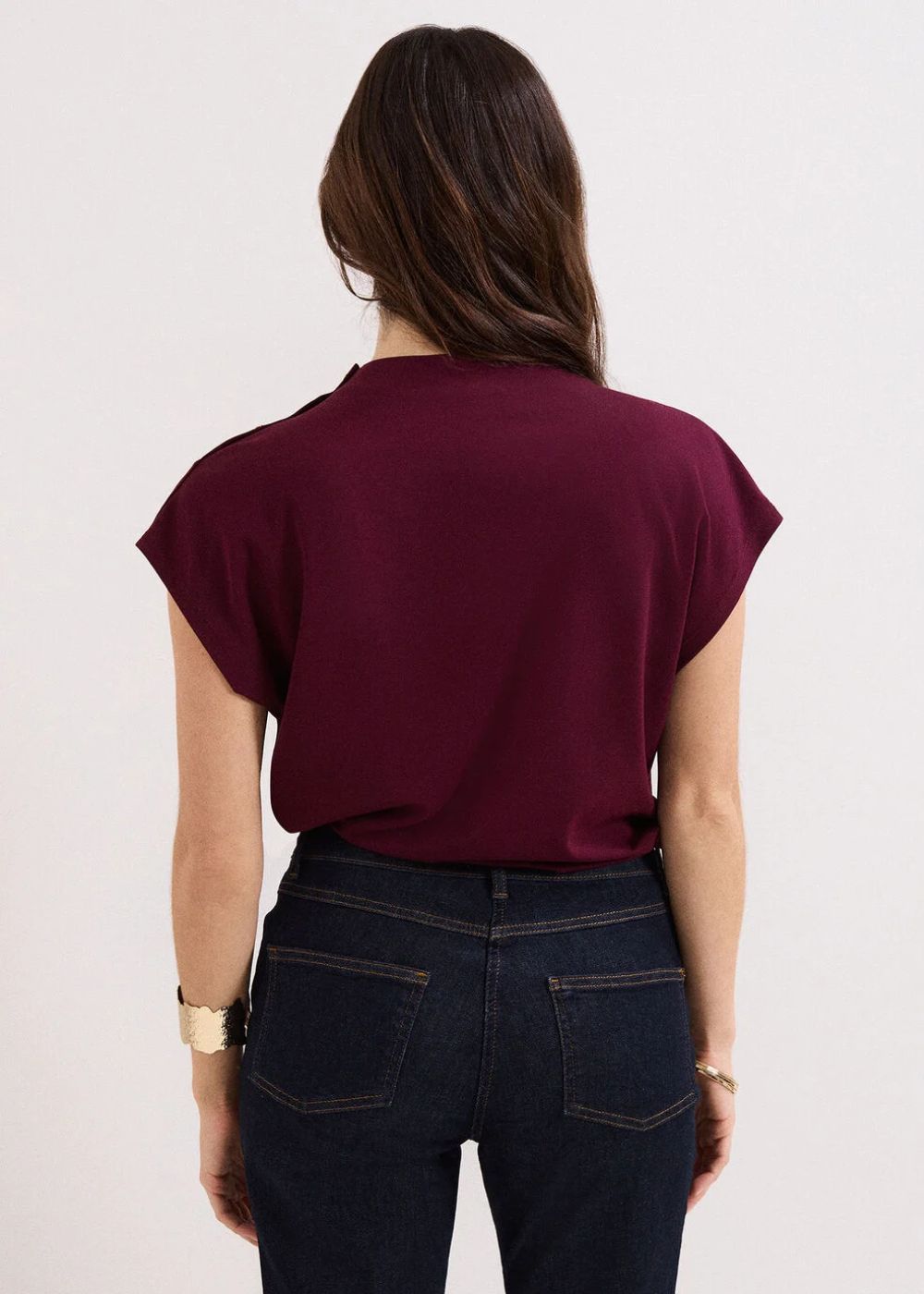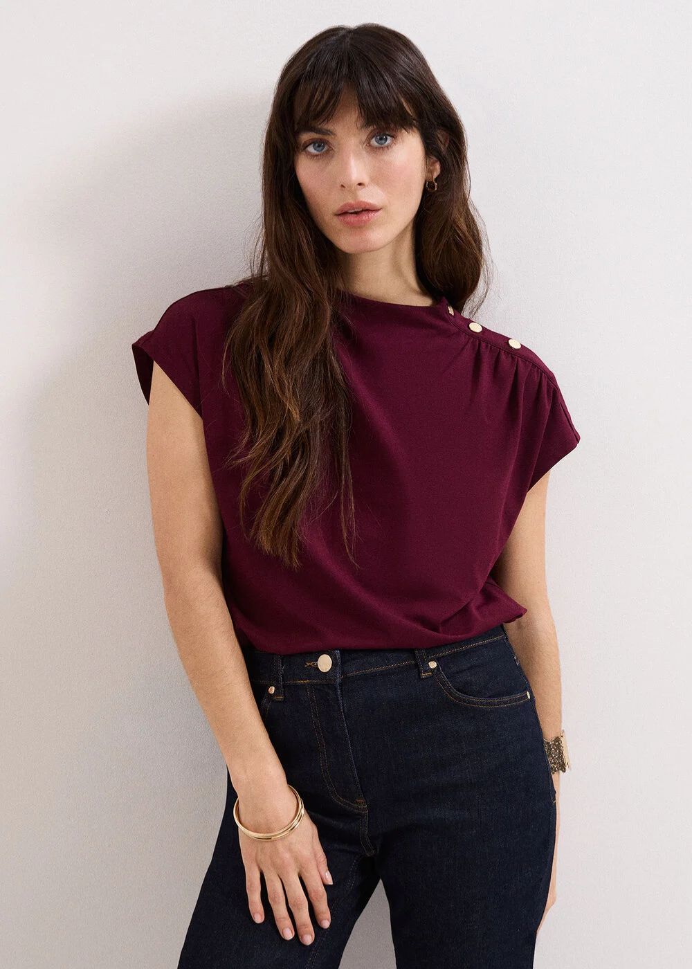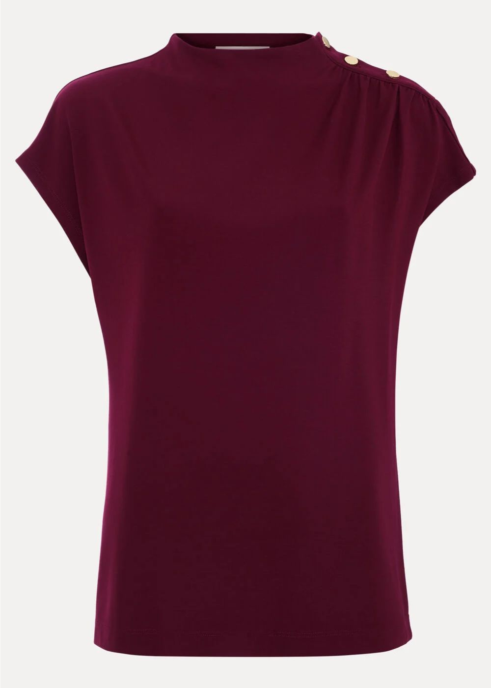 Effortlessly modern, this burgundy top with a contemporary twist is the answer to easy everyday styling. With cap sleeves and chic gold hardware on the shoulder, this top features expertly placed ruching to create a refined silhouette. Style with your favourite trousers and skirts for a stylish yet relaxed look.
