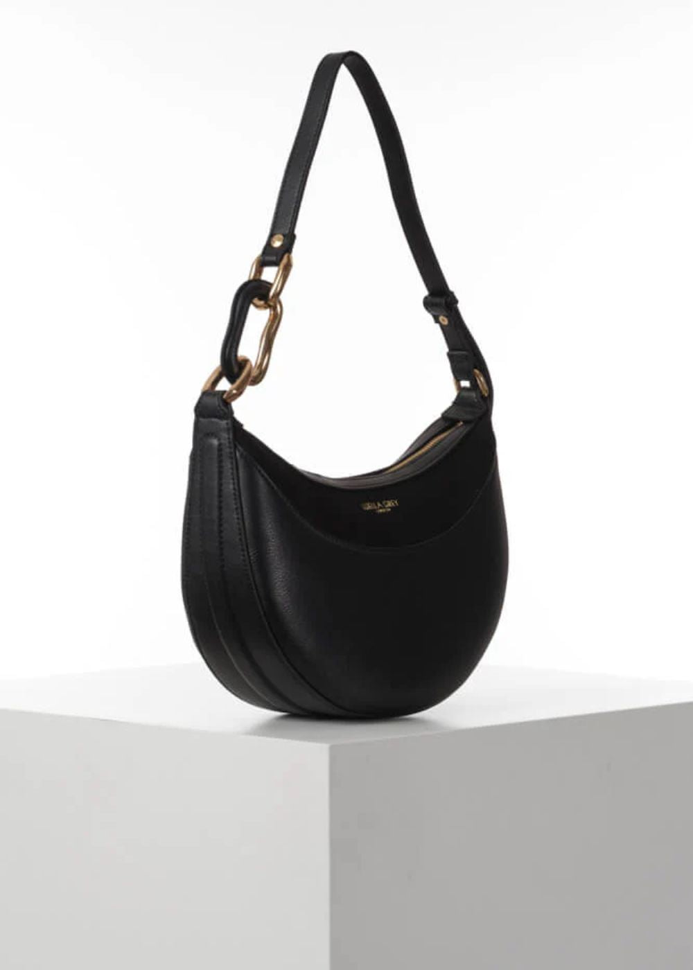 Hester is a shoulder bag designed for style and functionality. Meet Hester, a saddle shoulder bag that oozes refined, sophisticated style. Hester features the new Tooting Half-Covered Chain Link strap detail for a flash of golden glamour - a signature Luella Grey statement. The mix of material textures adds tactile interest, and with the molten metal zip closure, Hester scoops under your arm for a comfortable, yet super chic carry. Hester features a slip in pocket on the front and comes with a protective branded dustbag.