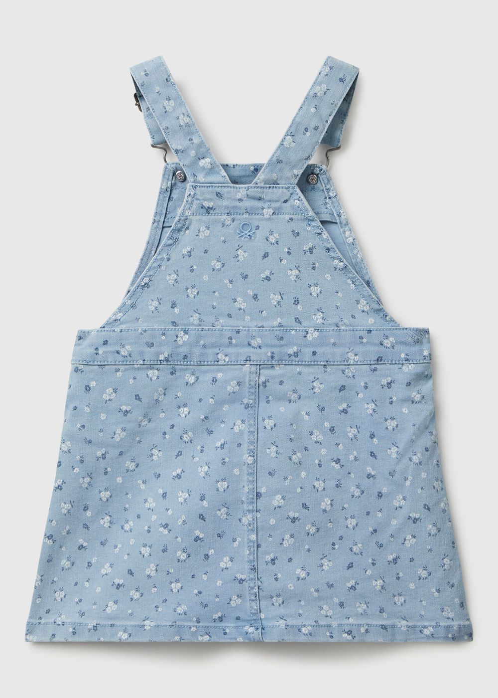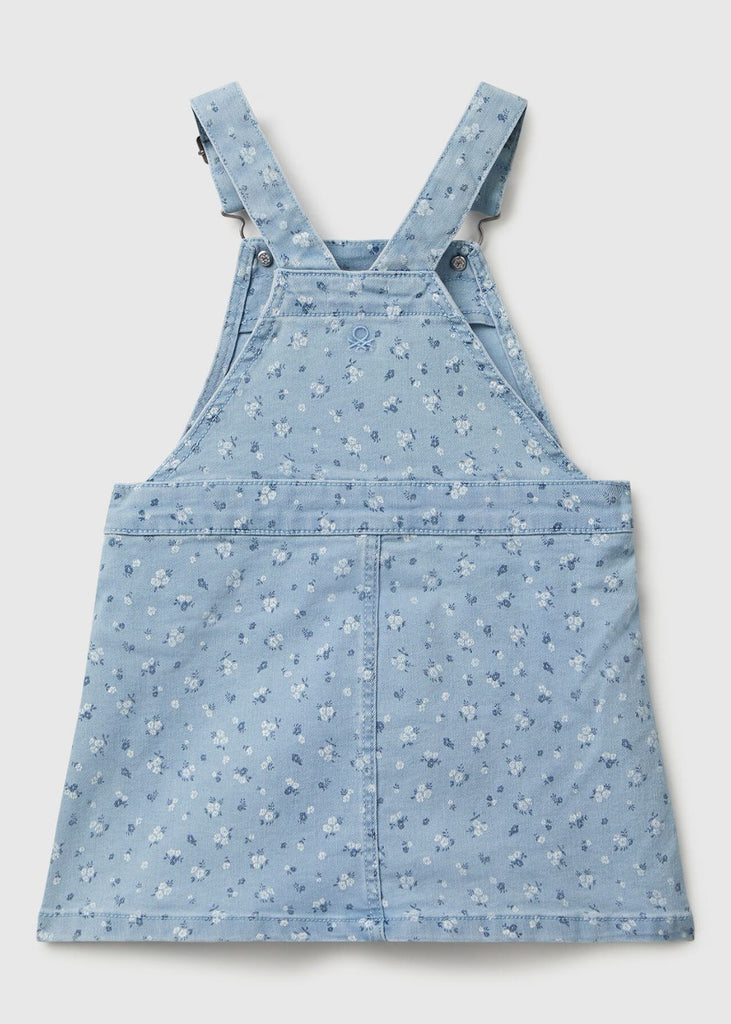 Denim dungaree dress in pure yarn dyed cotton with thin pinstripes. Knee-length, shoulder straps with button and gathered waist. Ideal over a t-shirt or light sweater.