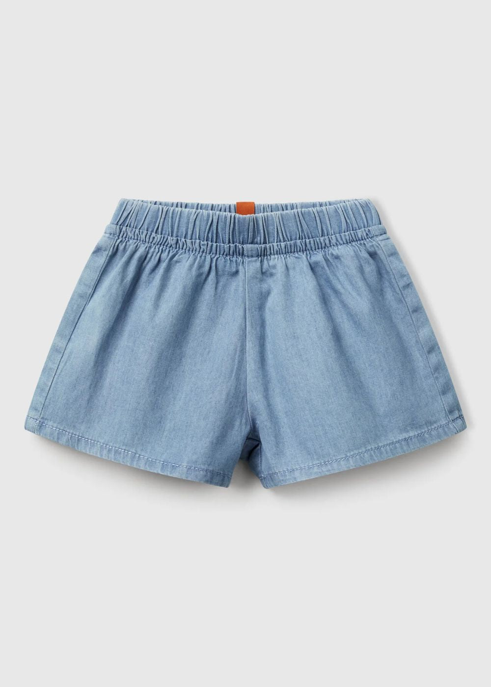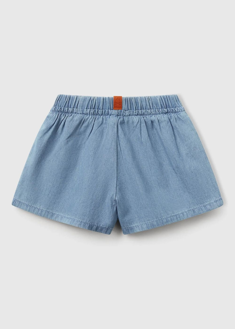 Denim shorts in pure cotton chambray. Inner elastic waistband, side slits, front rouching. Ideal for the summer.