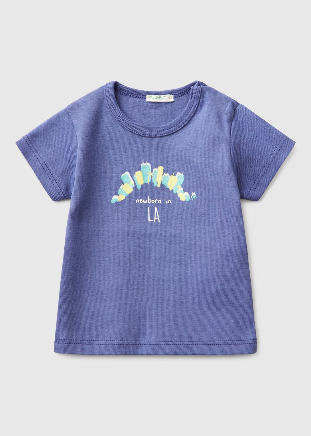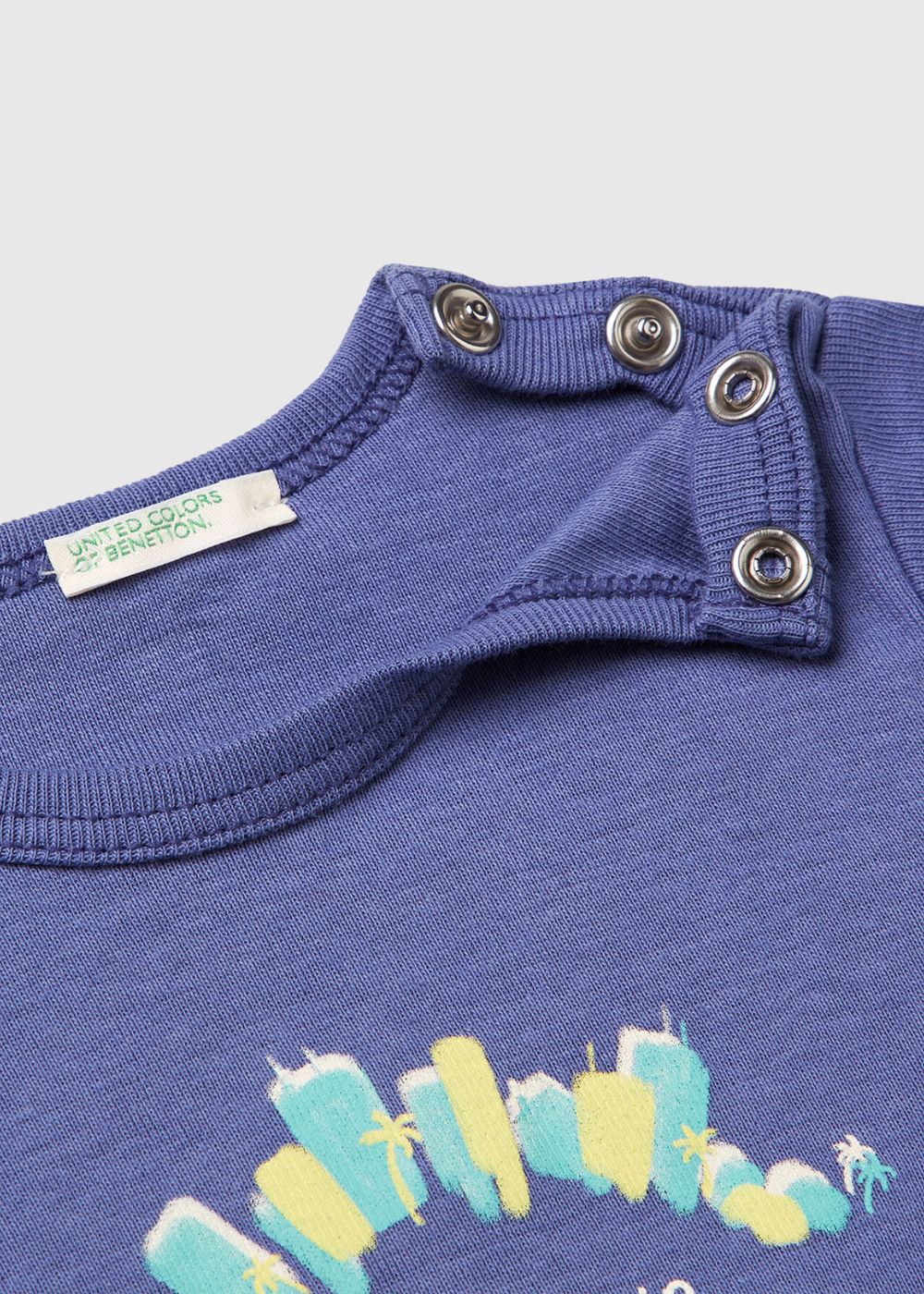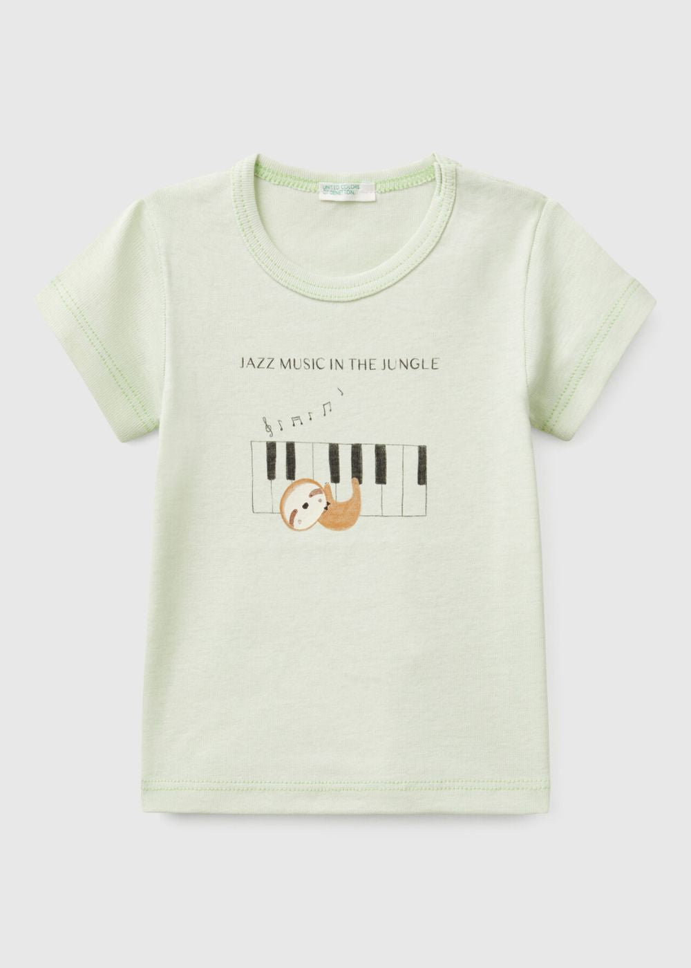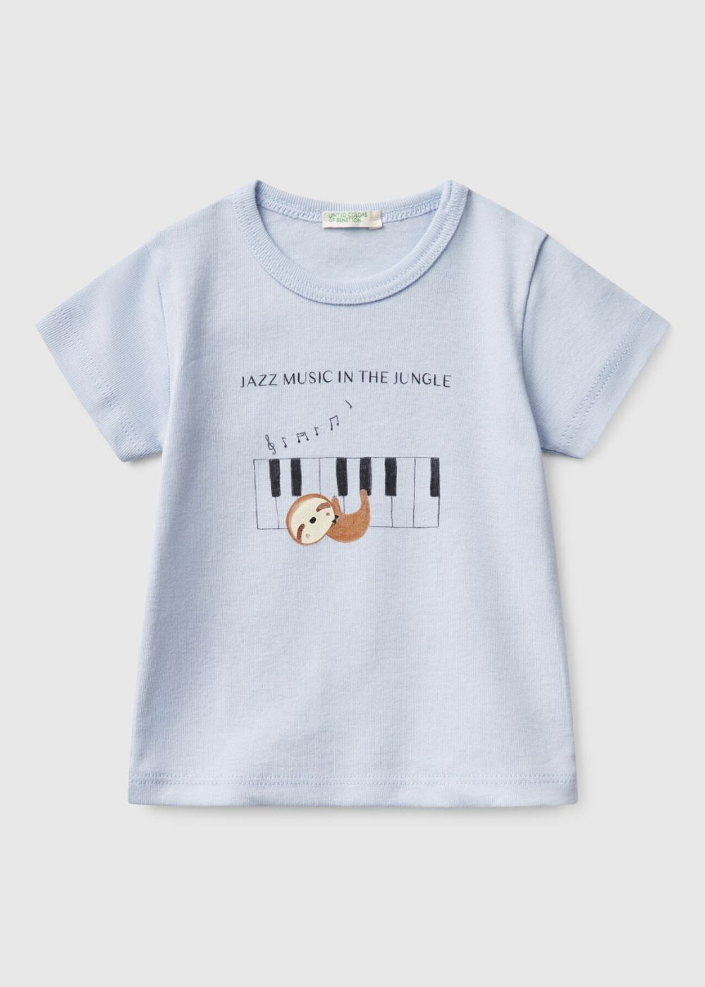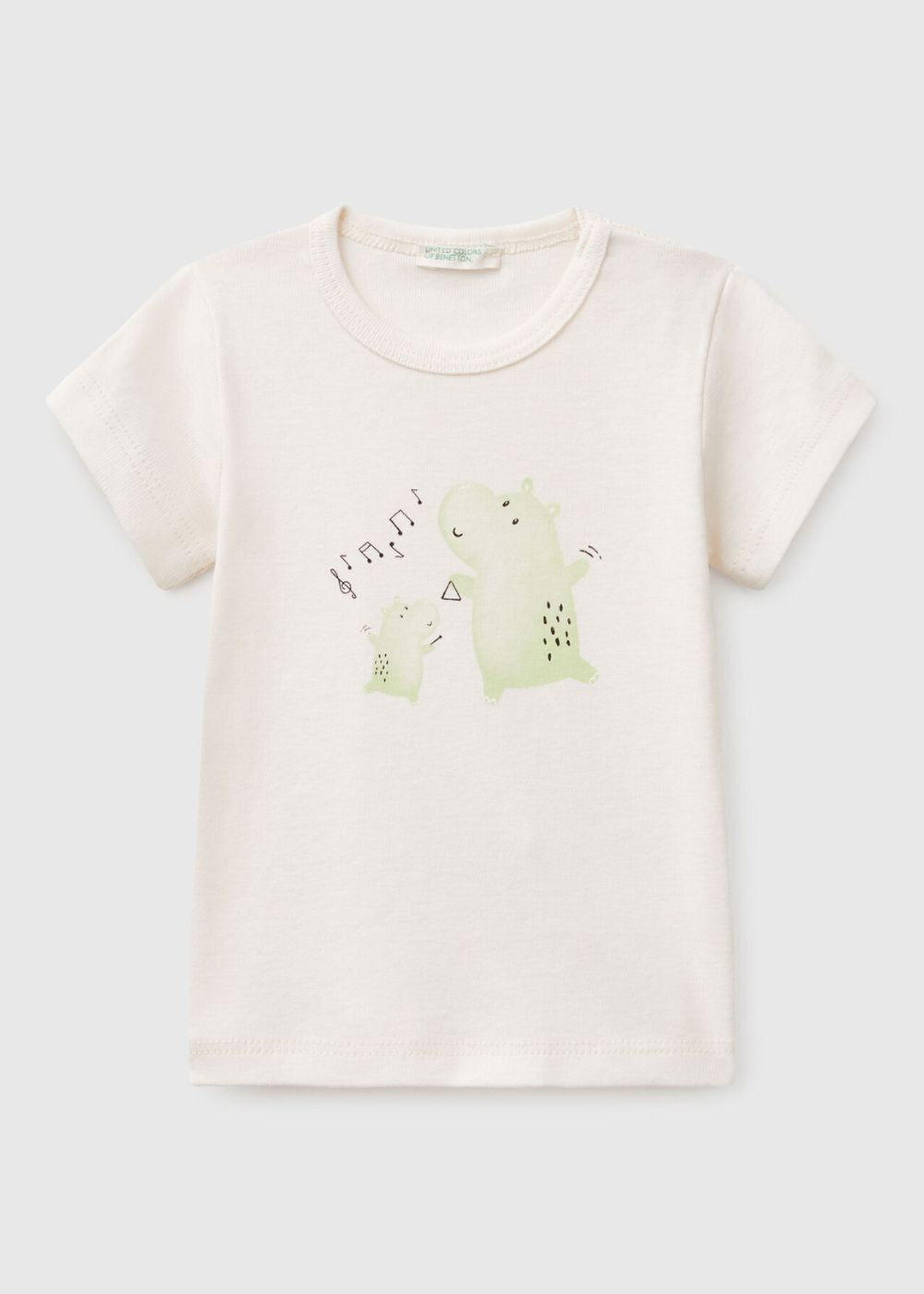 Crew neck short sleeve t-shirt in pure organic cotton. Cute print at breast, hidden opening with snap buttons on the left shoulder. Refined, soft and pleasant to wear. Item made with fabric containing at least 95% organic cotton.
