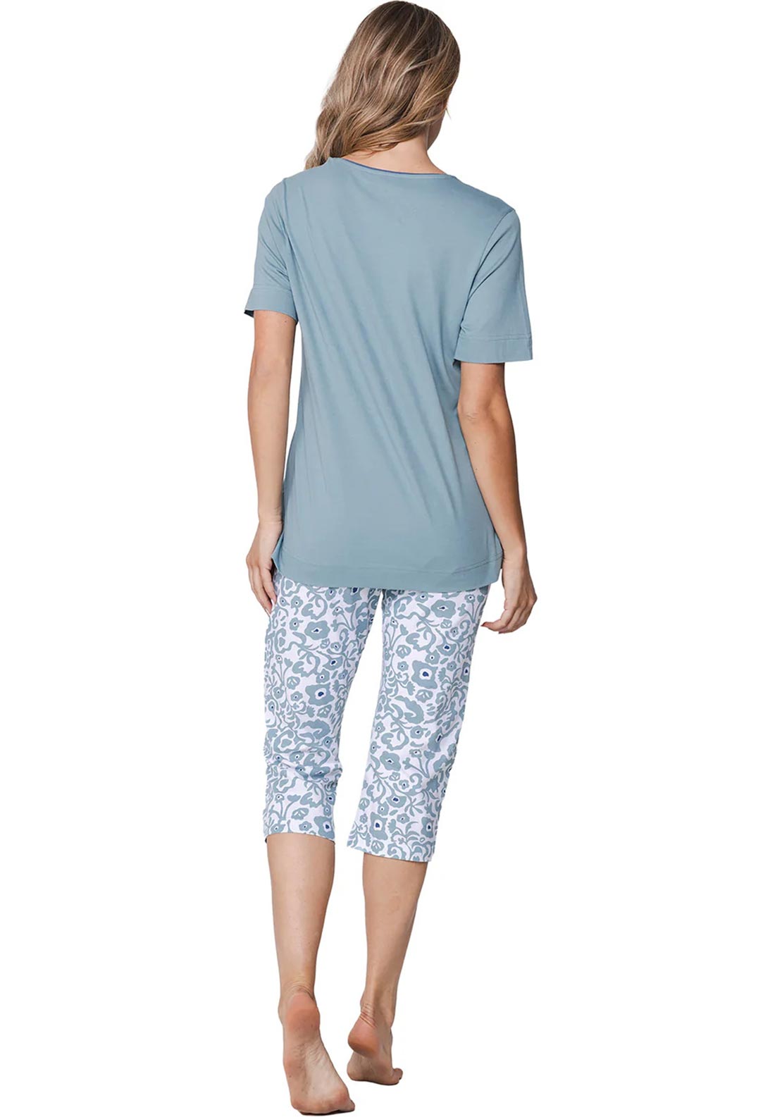 Discover effortless comfort with Pastunette's Stone Blue Capri Pyjama Set, expertly designed for those warm nights when you want to sleep in style. This charming two-piece ensemble pairs a solid blue top adorned with an eye-catching fantasy print that brings contemporary flair to your bedtime routine. The thoughtfully placed side slits at the hem ensure unrestricted movement, while short sleeves and a classic round neckline keep you cool and relaxed. Complementing the top, the white capri-length pants feature a coordinating blue fantasy pattern and a gentle elastic waistband that adapts to your body for all-night comfort. Perfect for creating a put-together look that doesn't compromise on the ease and breathability you deserve.