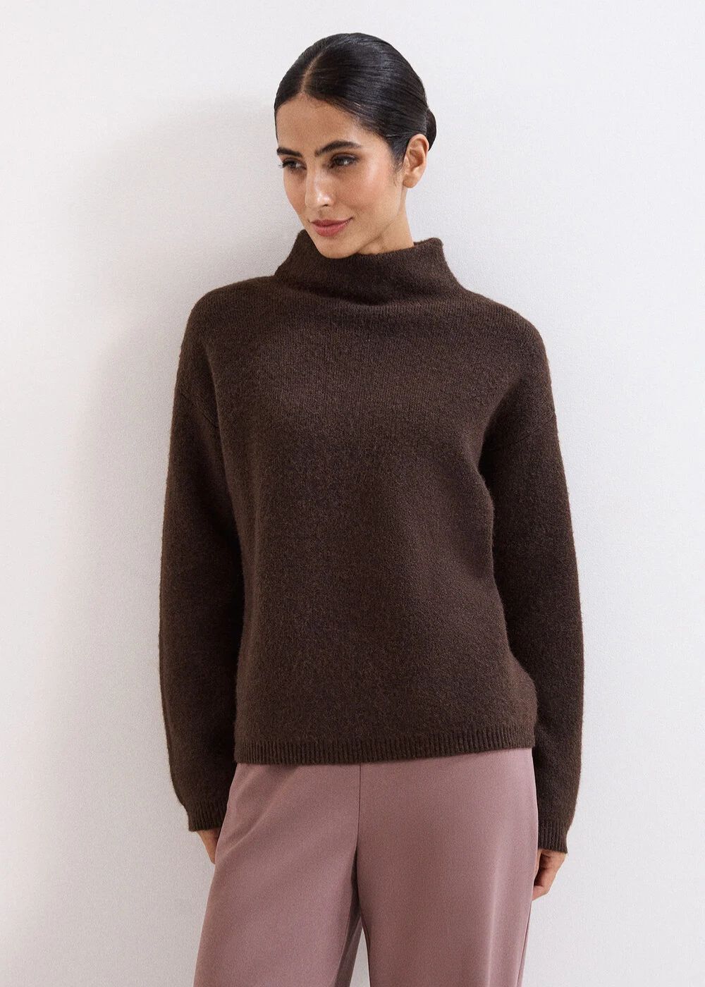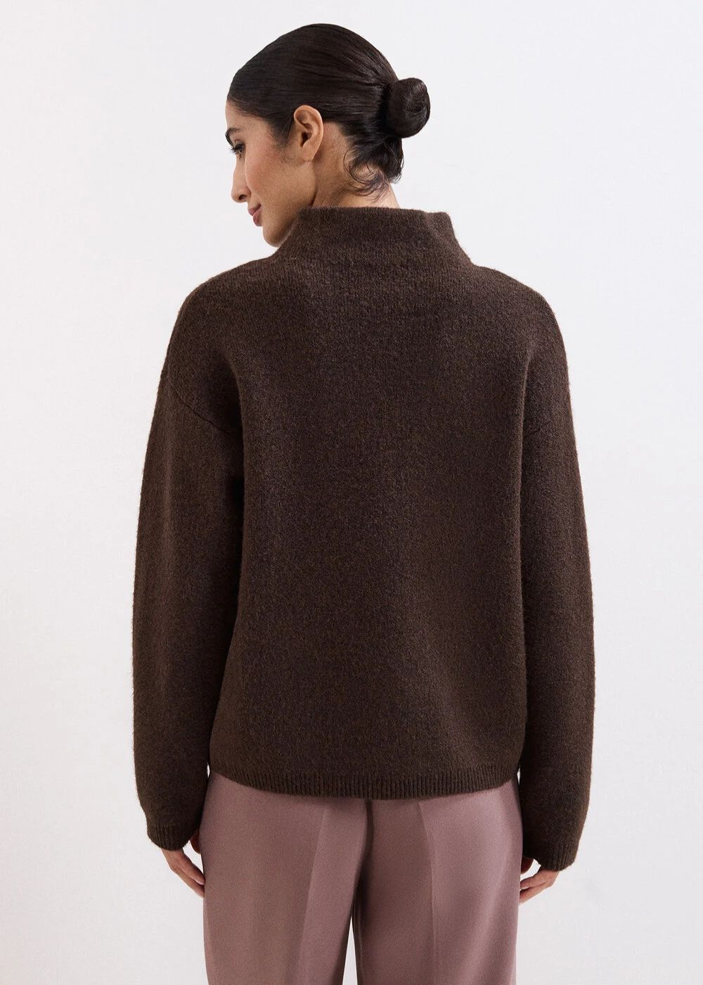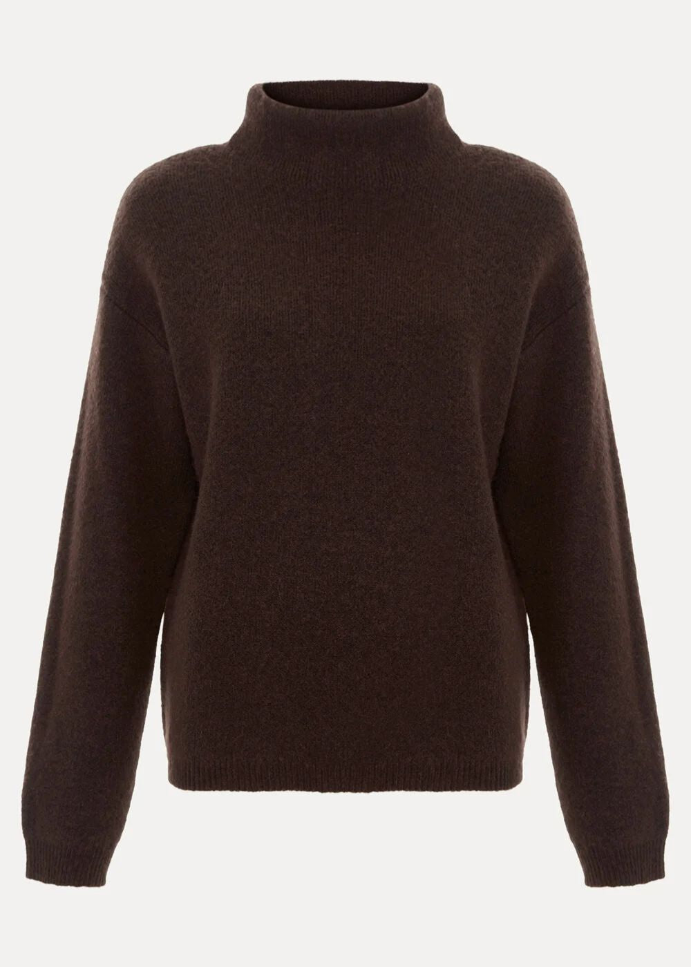 Meet your new favourite cosy jumper. In trending chocolate brown, this fluffy knit is designed in a relaxed fit and features a warm funnel neck, making it perfect for cold weather dressing. Wear with your favourite jeans or over dresses, this style will become your most reached for jumper this season.