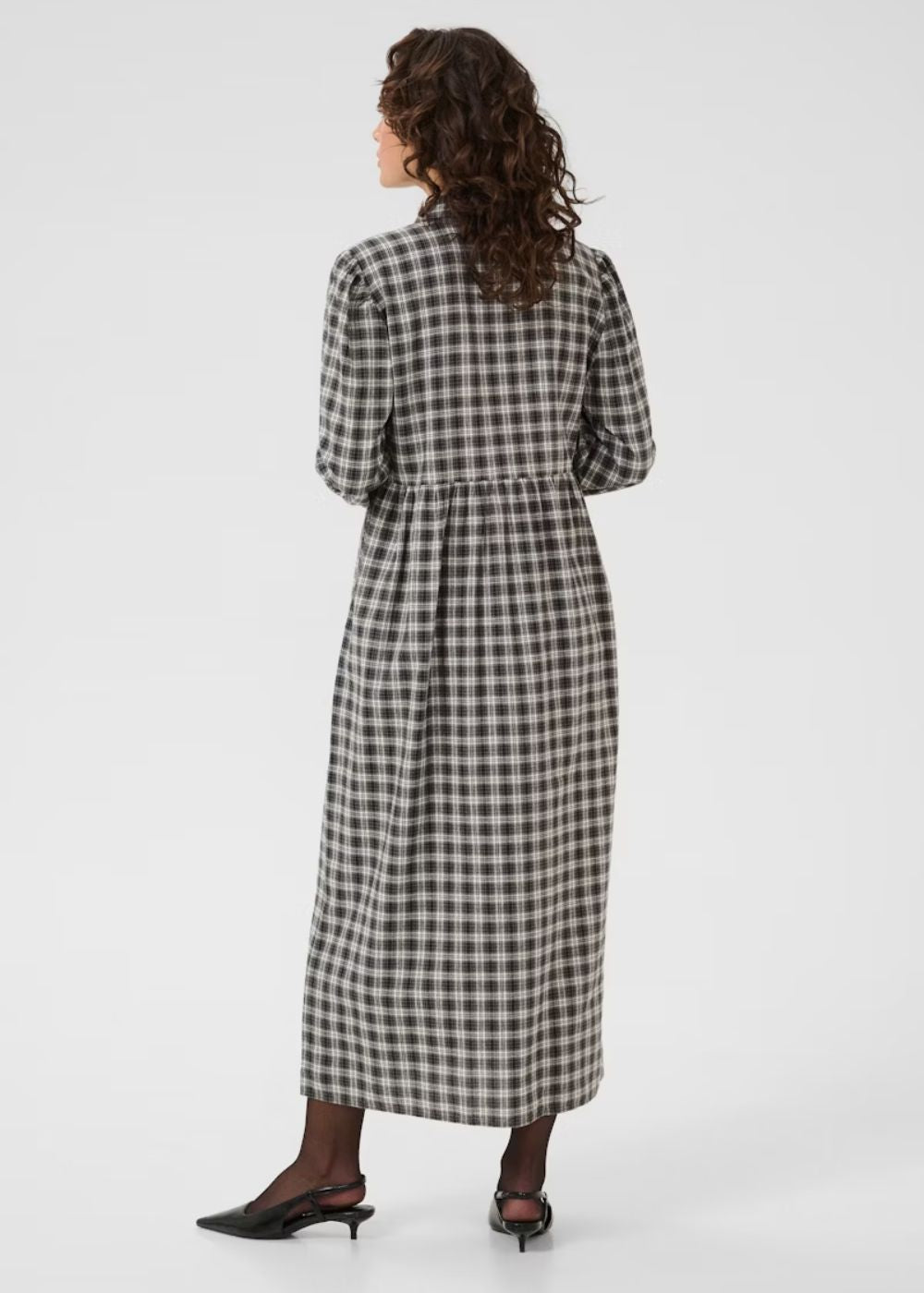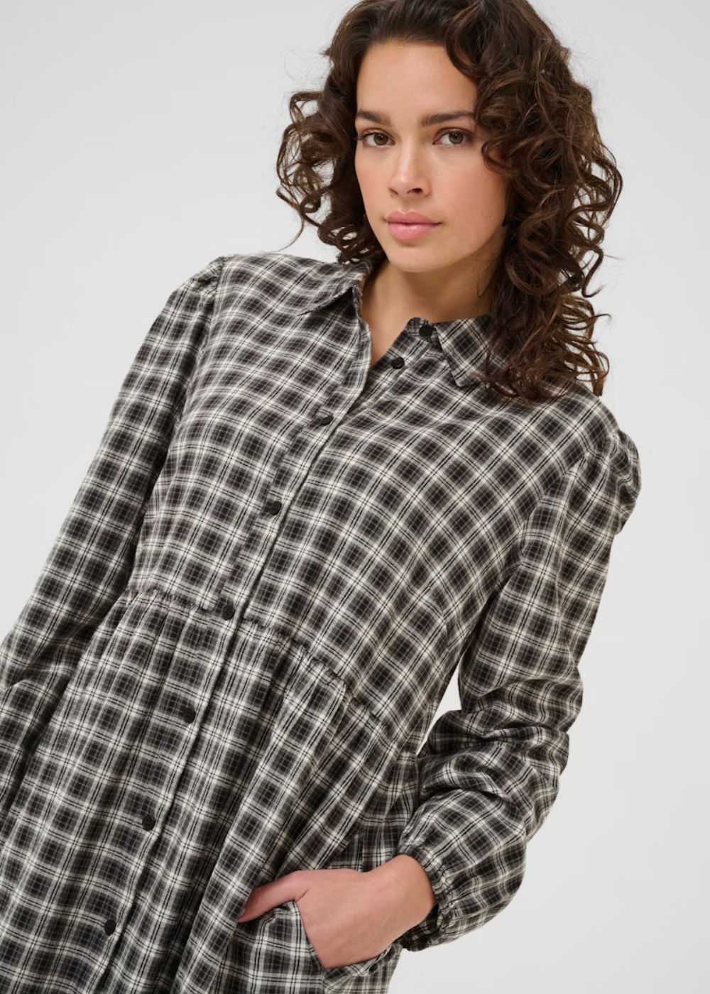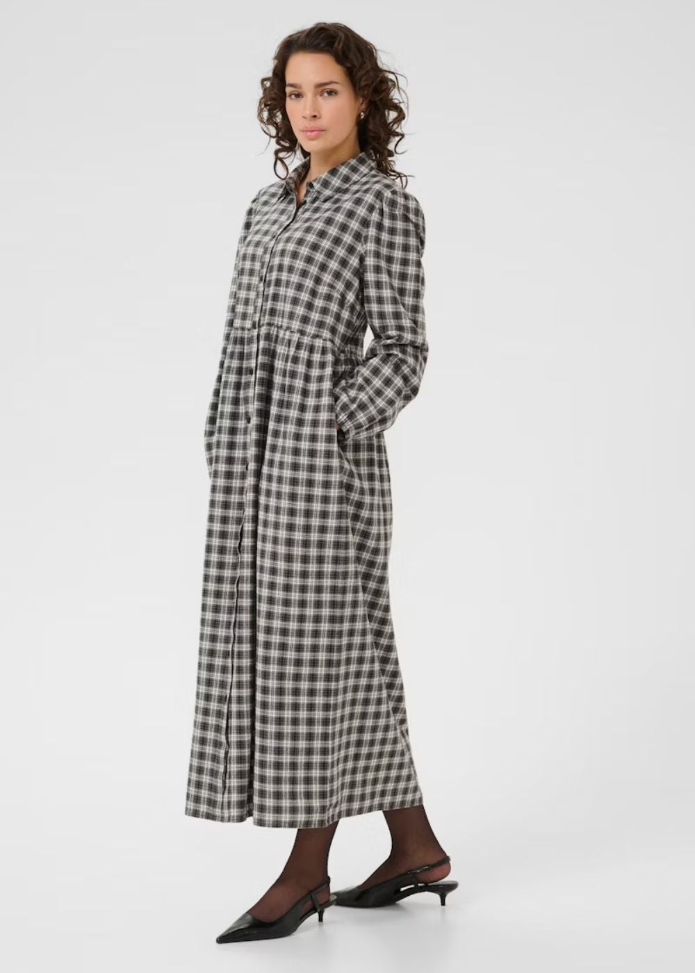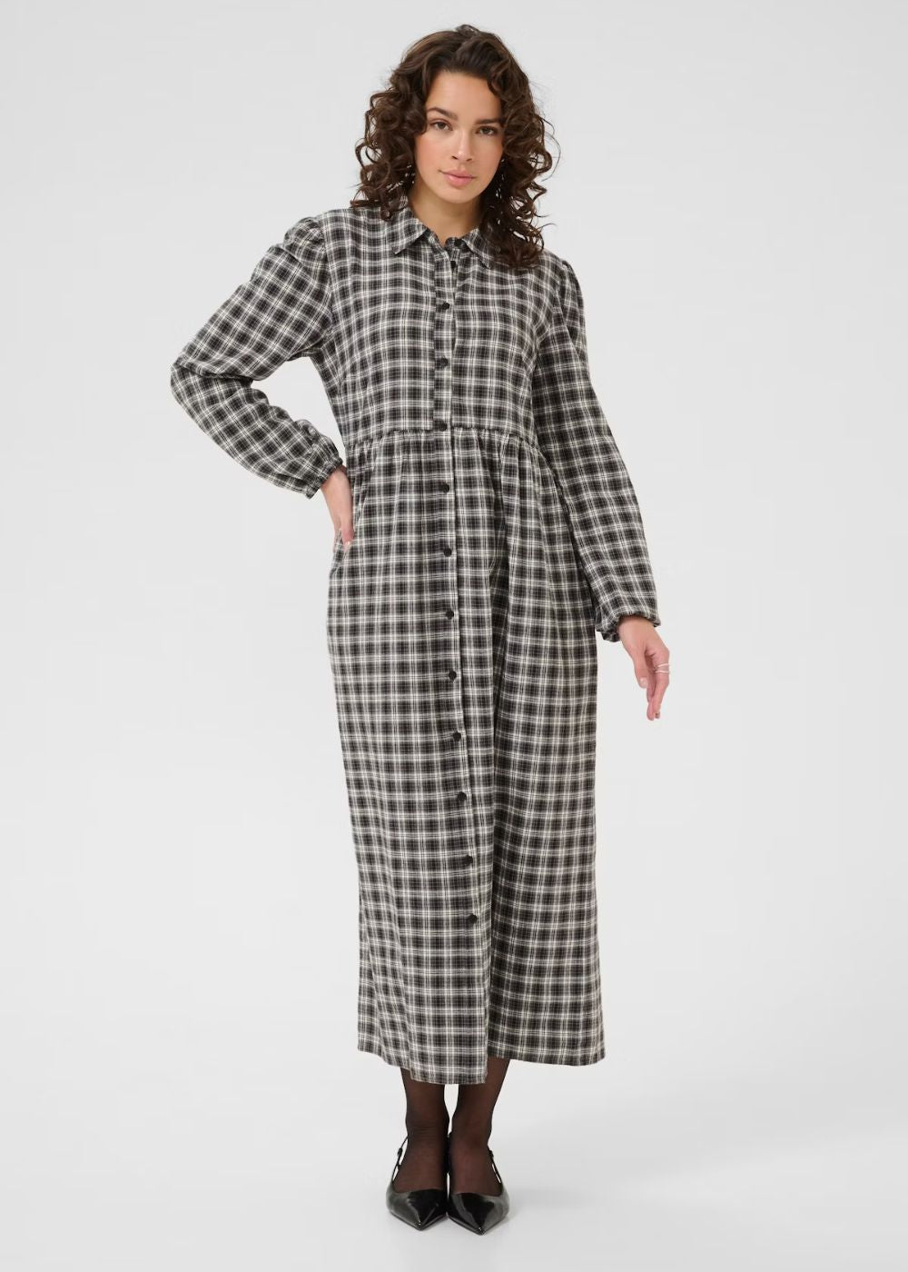 The KAELNA Shirt Dress offers a sophisticated blend of comfort and style with its relaxed fit and timeless design. Crafted from 100% cotton, it features a classic collar, button-down front, gathered waist, and long sleeves, making it an elegant choice for various occasions. This versatile dress effortlessly enhances your wardrobe with its refined silhouette and breathable fabric.