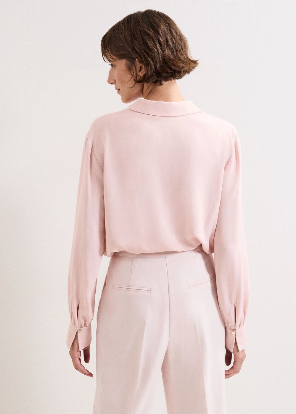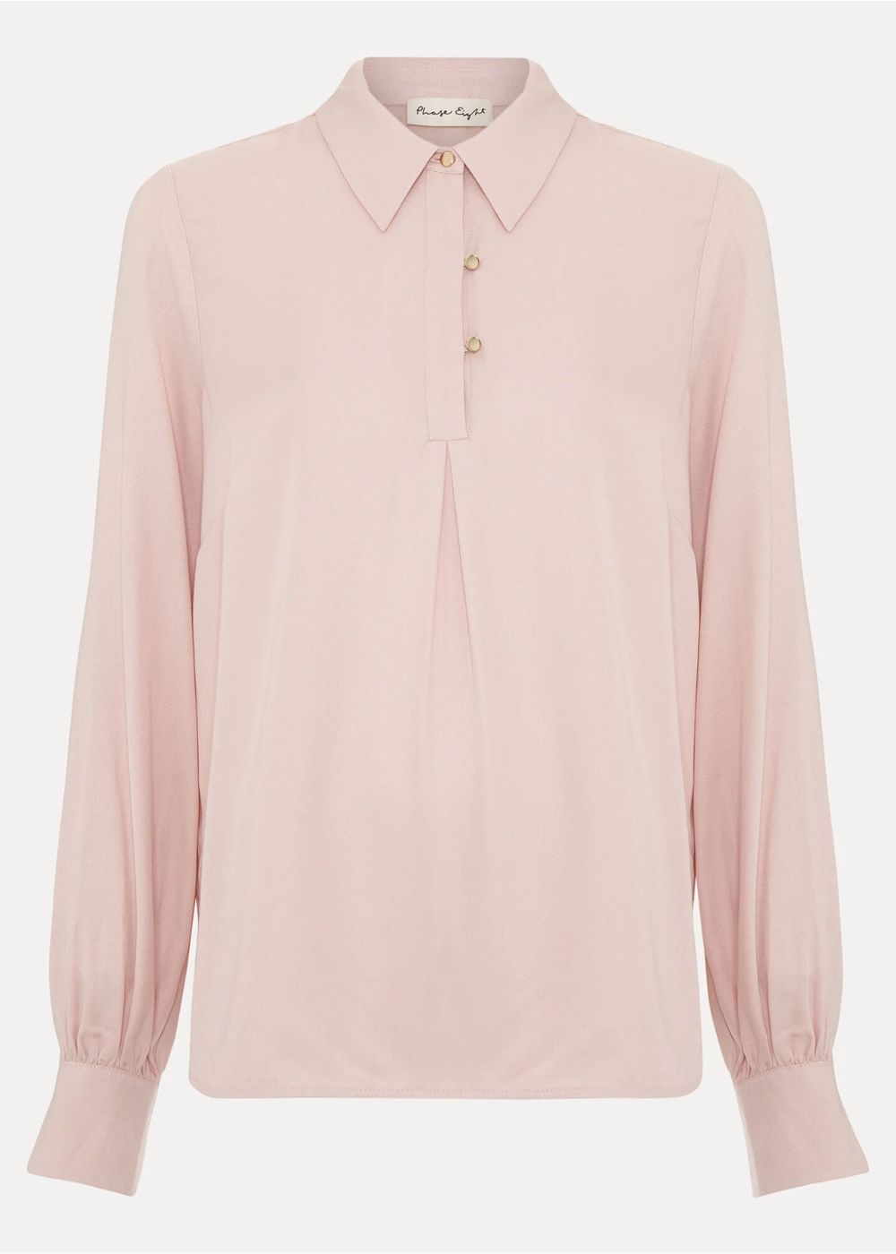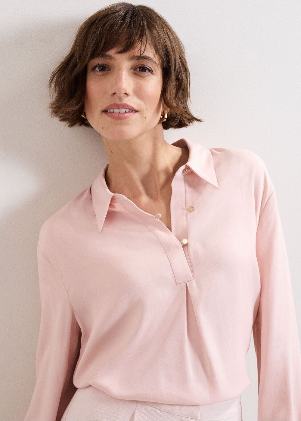 Your classic everyday shirt, elevated. Designed in a feminine pale pink hue with stylish gold button detailing and a V neck-line, this relaxed-fit shirt is the perfect style for ticking off any smart-casual dress code, work or play.
