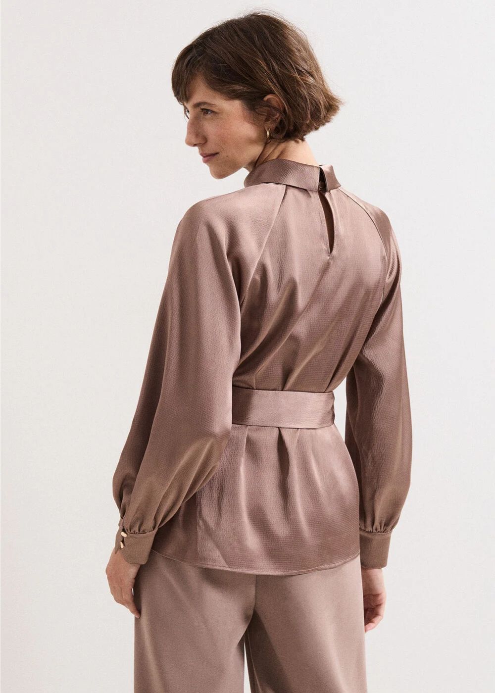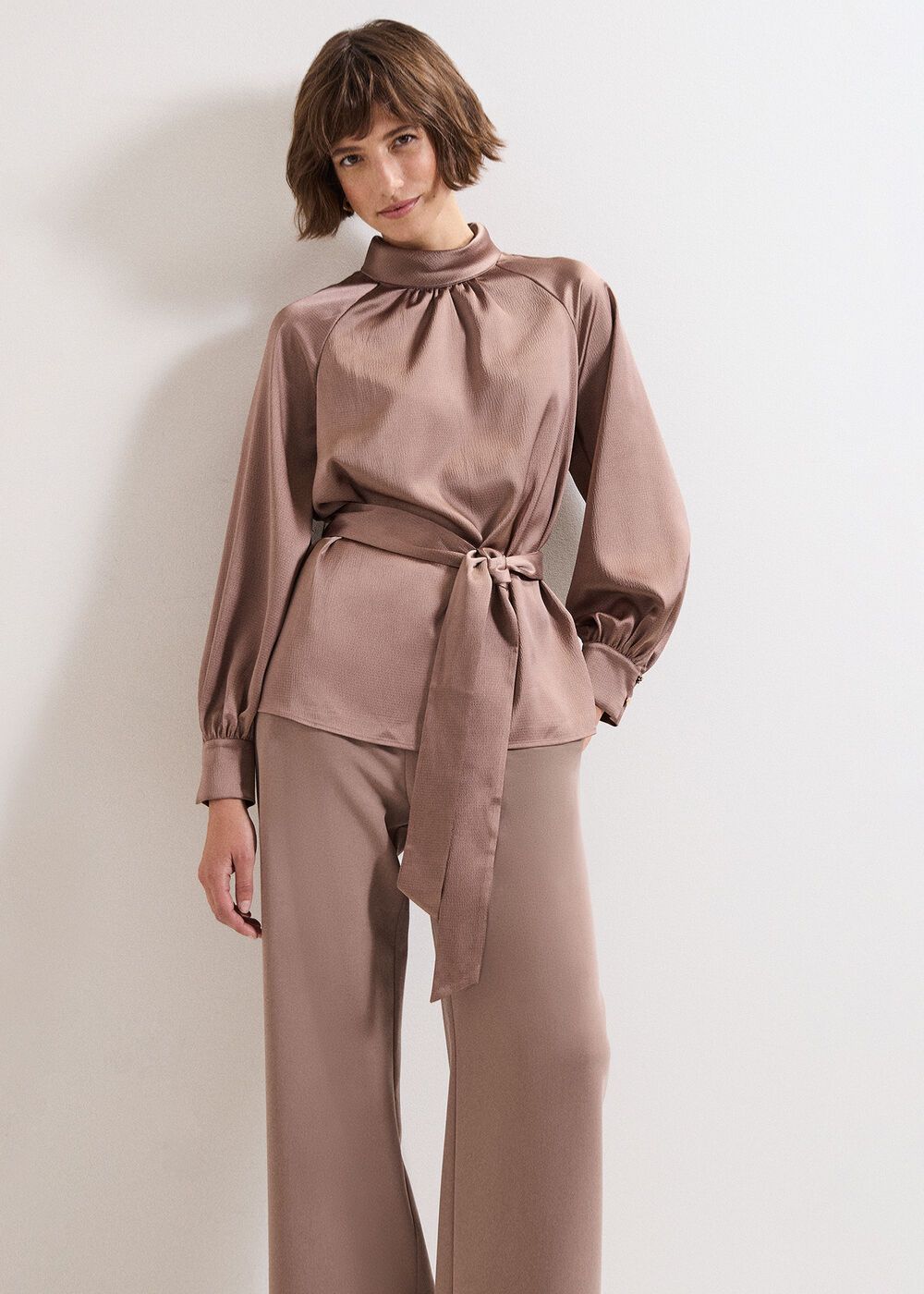 The definition of luxurious elegance, this satin blouse is designed in a feminine soft brown hue which captures the light beautifully with every movement. Featuring a modern high neck, subtle balloon sleeves and matching tie belt to create a contemporary silhouette, this blouse will be your new go-to style to make you look and feel amazing.