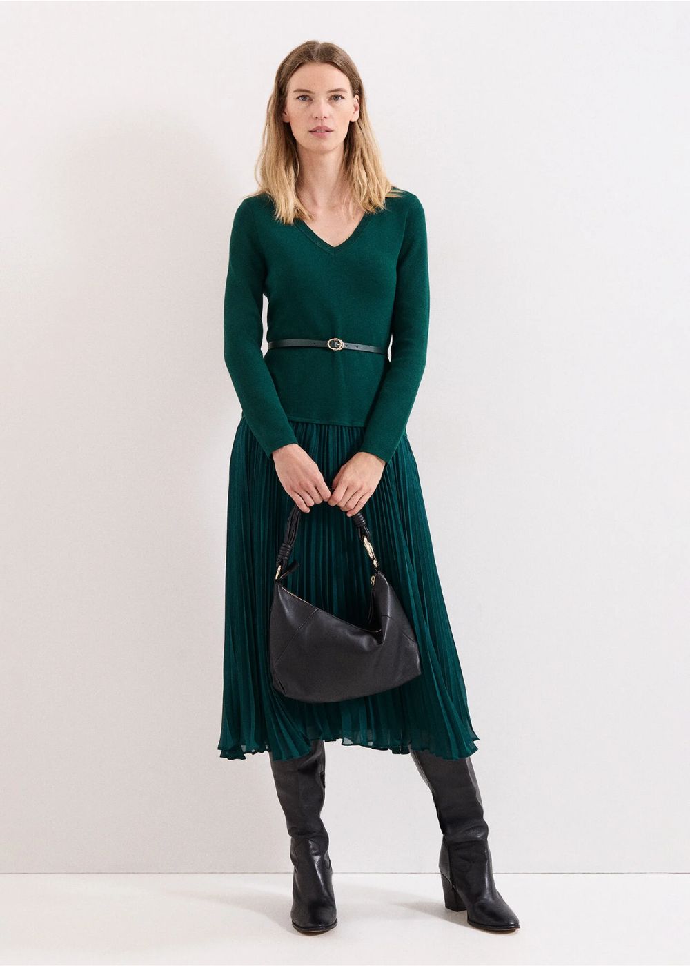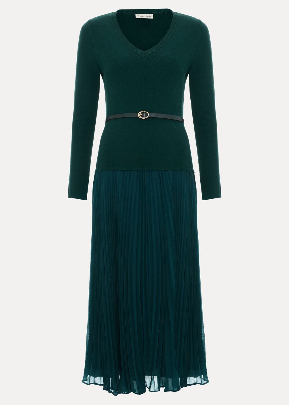 A knitted midi dress with wear-all-day appeal. In a deep forest green that’s perfect for transitioning into autumn, it features a knitted top, flowing to a fully pleated skirt that create beautiful movement. The dropped waist creates an elegant silhouette, finished with a slim belt for subtle refinement. Paired with boots or heels it’s a sophisticated work to weekend choice.