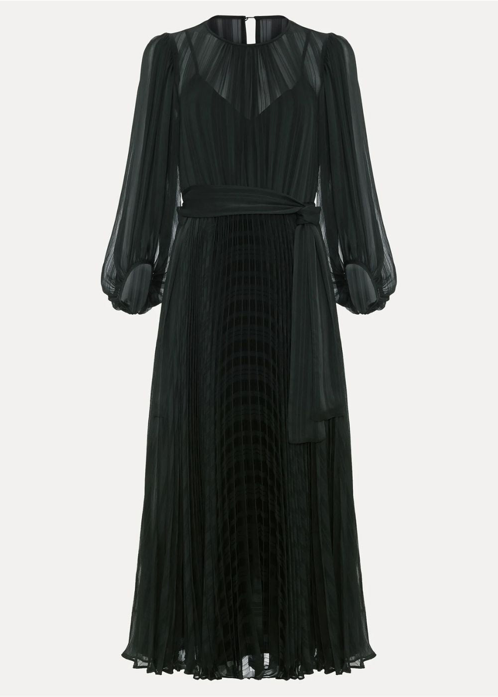 This midi dress is all about effortless design details. Fully pleated, it flows to a sophisticated A-line skirt and the sheer voluminous sleeves add elegant motion to the silhouette. The deep green shade will never go out of style. Add simple matching accessories for a look you’ll wear for all your chic moments.