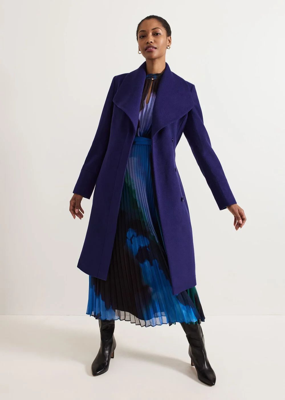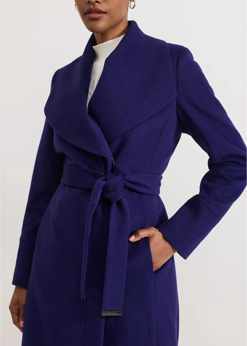 Transition into the new season seamlessly with our Nicci coat. In a gorgeous deep purple shade our coat is crafted from a responsibly-sourced wool blend, perfect for keeping warm on those colder days. The oversized shawl collar and matching belt with gunmetal grey accents create a feminine wardrobe staple that you’ll wear forever.