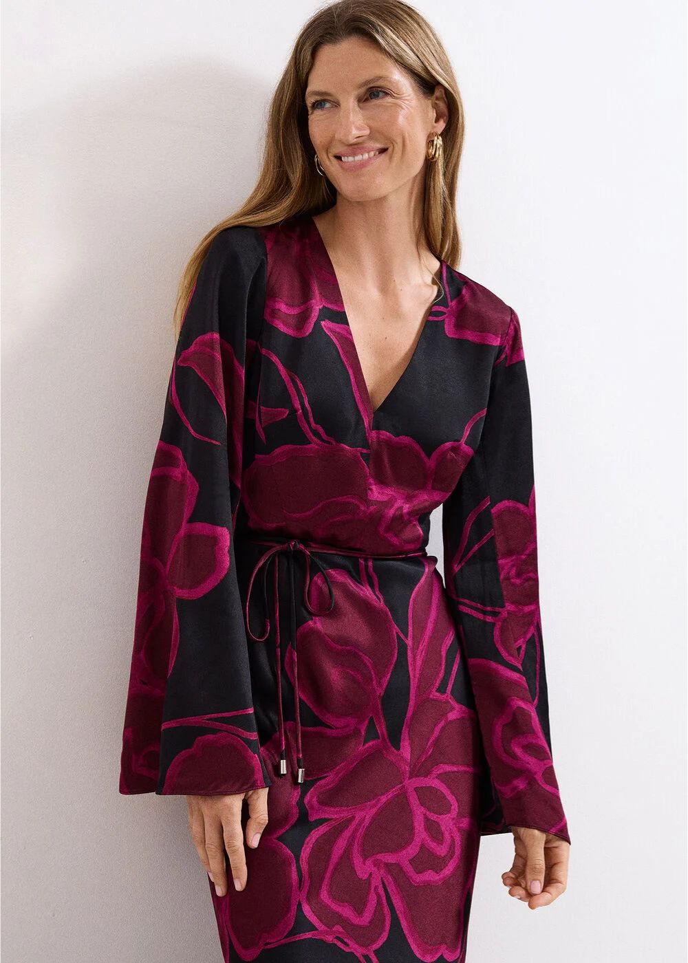 Modern glamour at its finest. This luxurious satin maxi dress features a bold floral print in striking black and purple. In a wrap style silhouette with matching tie belt and romantic fluted sleeves, this eye-catching dress will be your new go-to for every special occasion. Wear with heels and a clutch to finish the look.