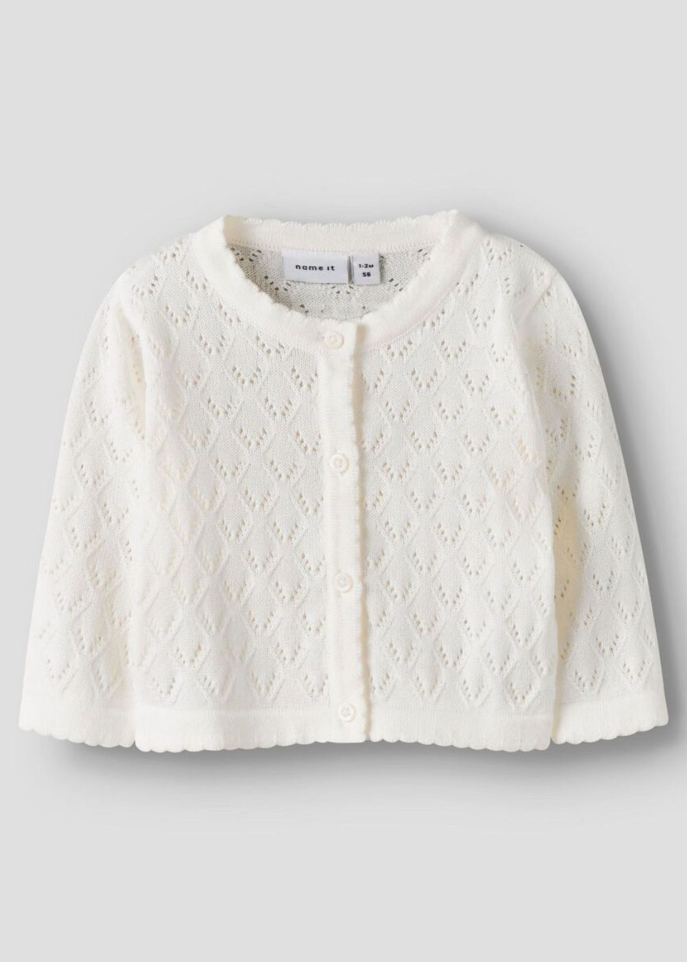 Elevate your child's wardrobe with this short knit cardigan, crafted from delicate knit featuring an elegant geometric pattern. Designed with a round neck and long sleeves finished with ribbed cuffs, it offers a refined yet comfortable fit. The button fastening adds a classic touch, making it an ideal layering piece for everyday sophistication. Perfect for creating a polished and cozy look that balances style and ease.