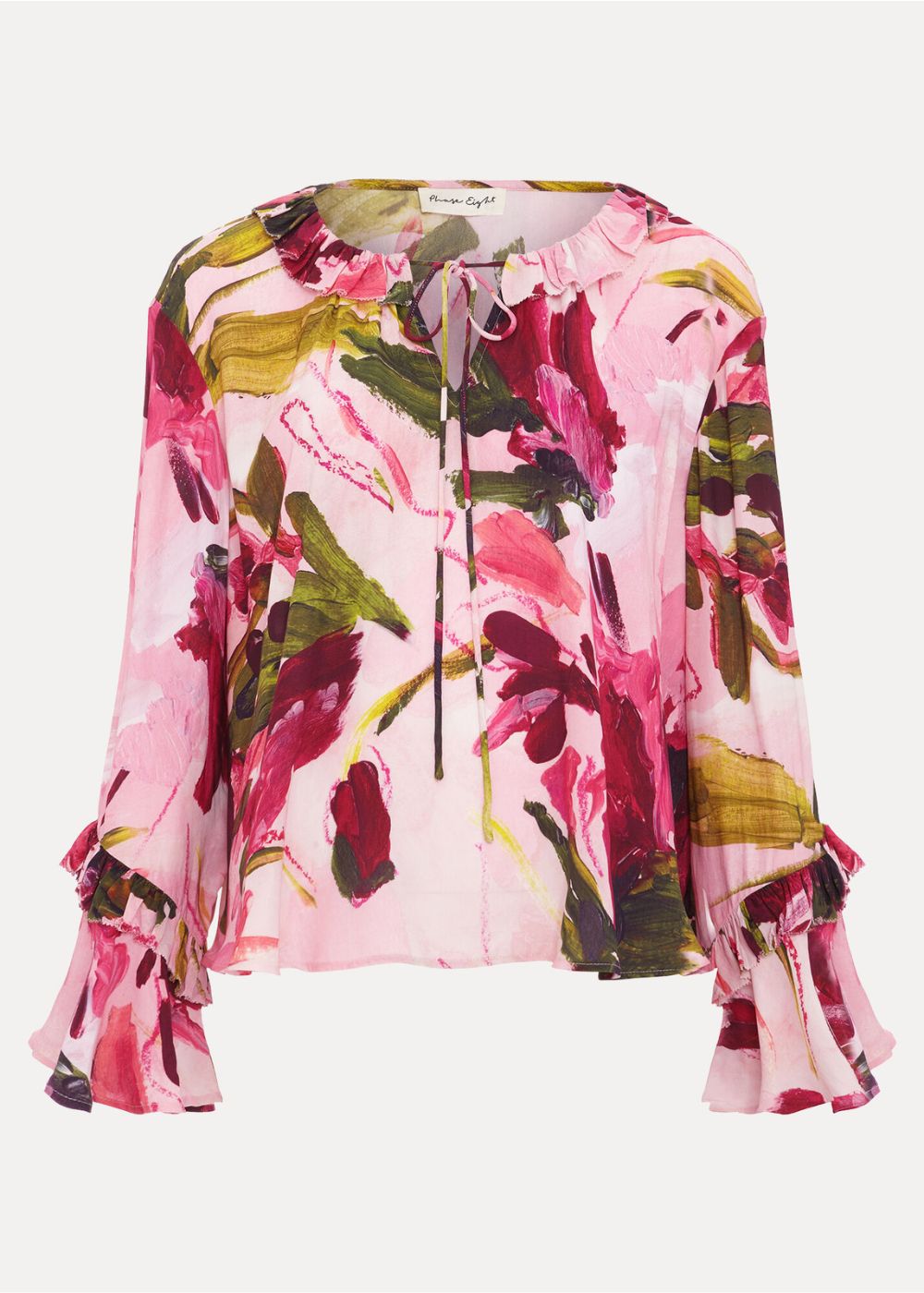 Inject some colour and pattern into your blouse collection. This abstract, floral blouse is designed in gorgeous pinks and greens and features feminine frills to the fluted sleeves and round neckline. Paired with jeans, trousers and skirts, this blouse will work hard for you all year round.