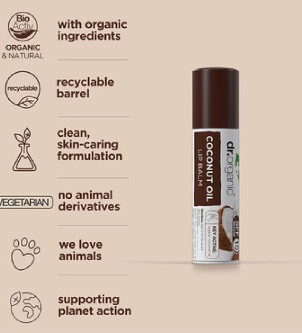 Dr Organic handy lip balm nourishes dry, cracked lips and provides protection against weather and harsh environments. The ideal daily lip care for everyday nourishing, hydrating and smoothing. With organic virgin coconut oil, shea butter and beeswax, this soothing lip balm gives instant relief from chapped and dry lips, helps protect against UVA and UVB rays with SPF15.