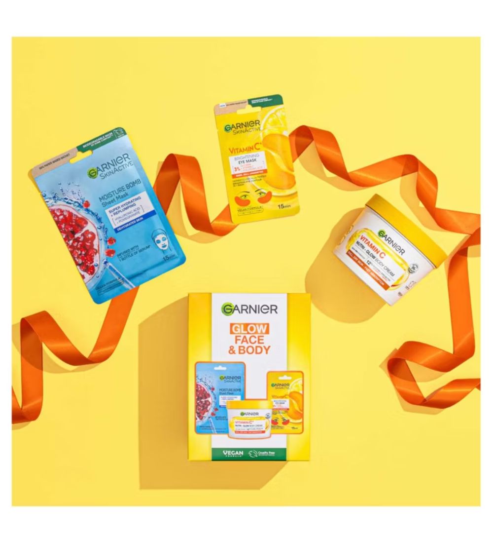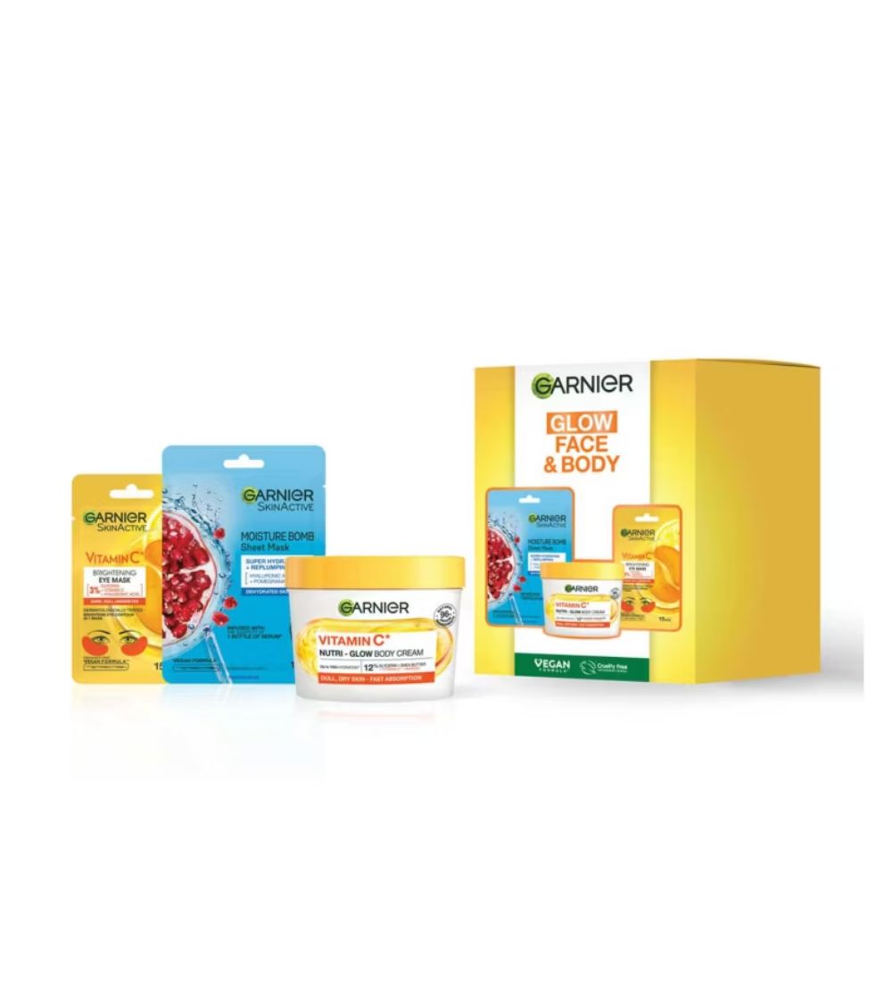 Hydrate from head to toe! The Garnier Ultimate Face and Body Trio hydrates and replumps your skin. Contains: Moisture Bomb Hyaluronic Acid + Vitamin C* Eye Mask to plump skin with moisture, reduce the look of fine lines and revive radiance for skin that glows, Moisture Bomb Pomegranate Hydrating Face Mask to plump skin with moisture, reduce the look of fine lines and revive radiance for skin that glows, and Vitamin C* Nutri-Glow Body Cream leaves skin feeling instantly hydrated.