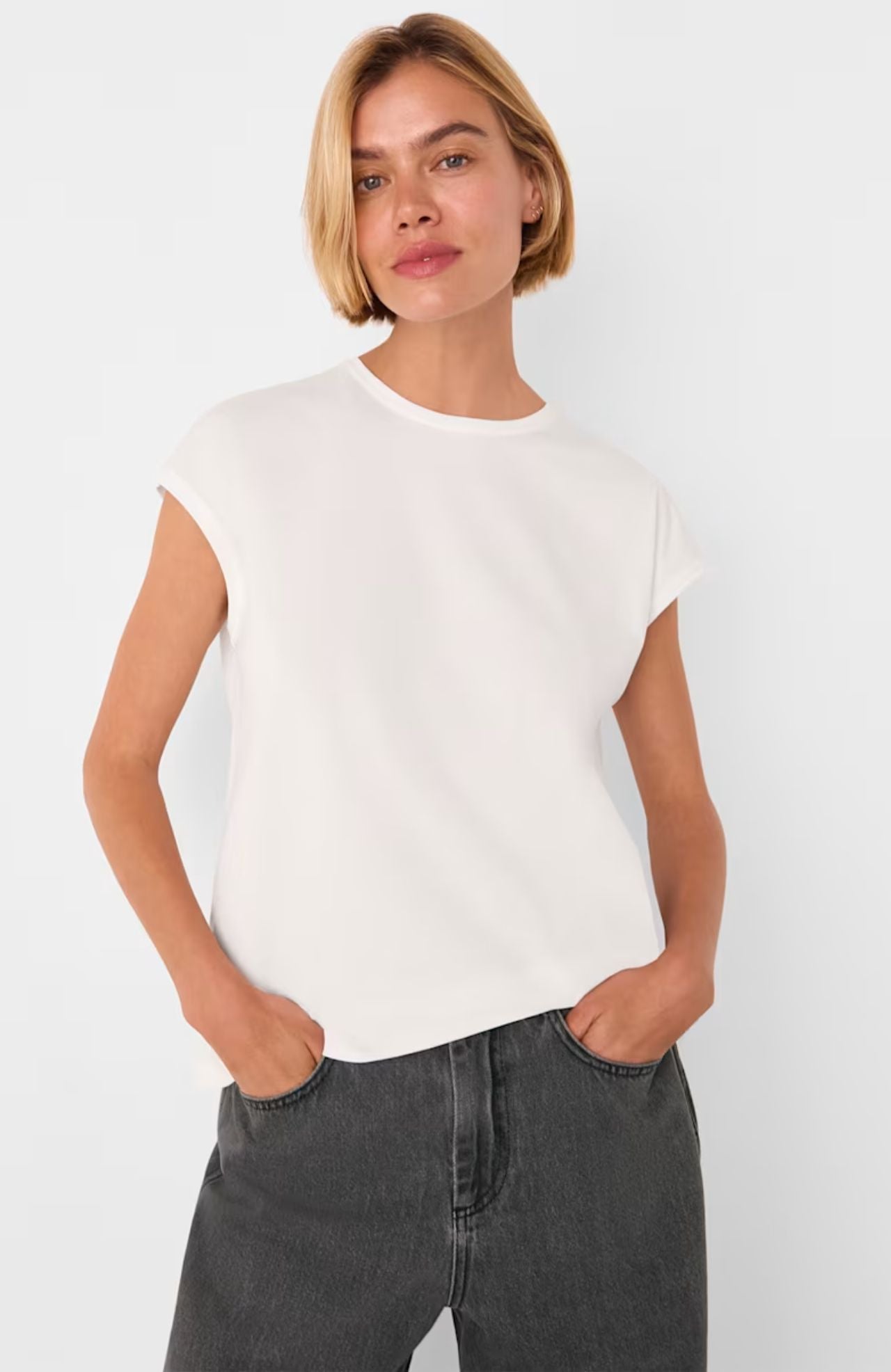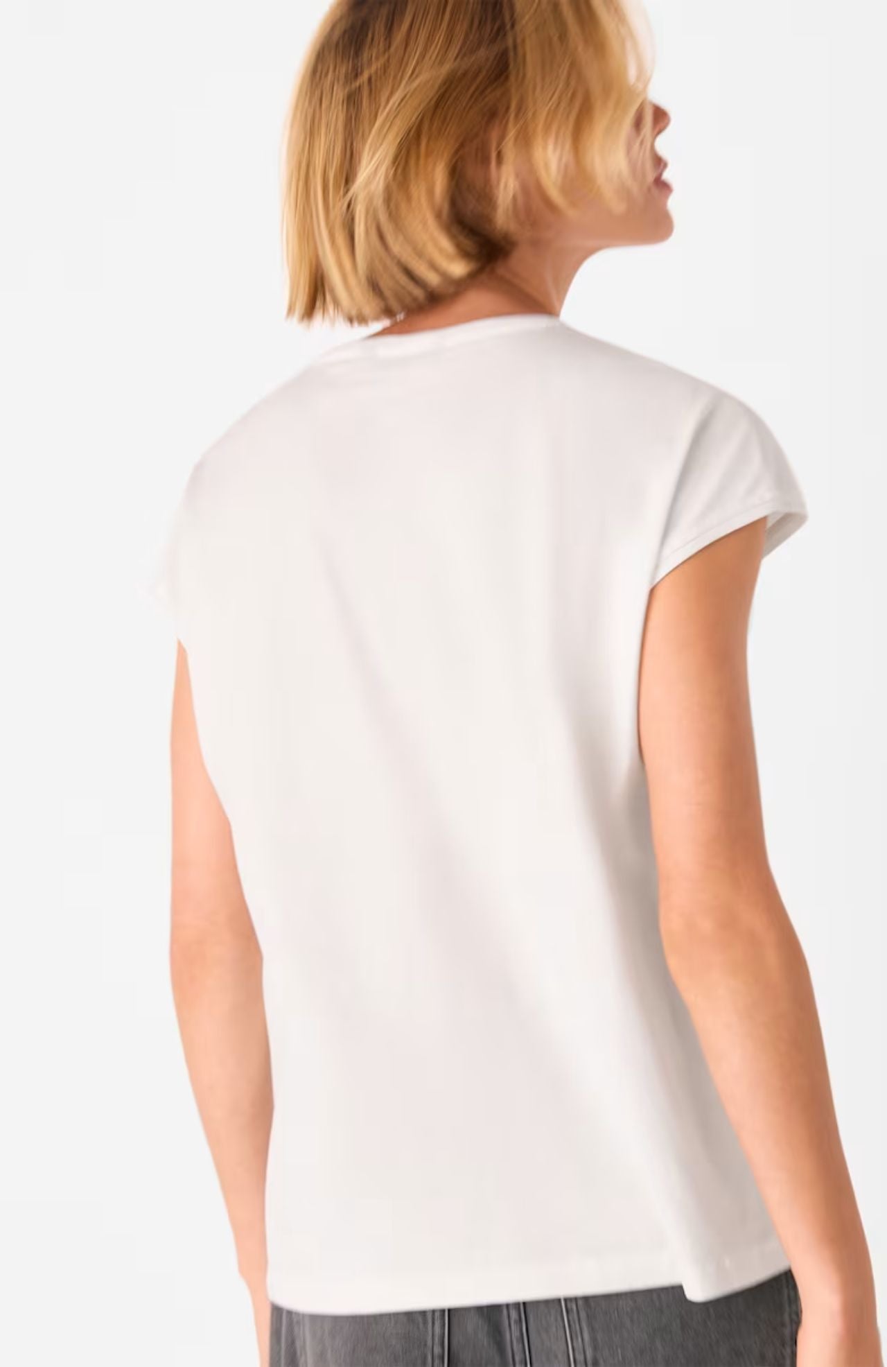 Made for comfort and versatility, our Cap Sleeve Tee is your new everyday essential. Whether you're at home, or on the go, this white tee is your perfect go-to, with its cap sleeves, relaxed fit.