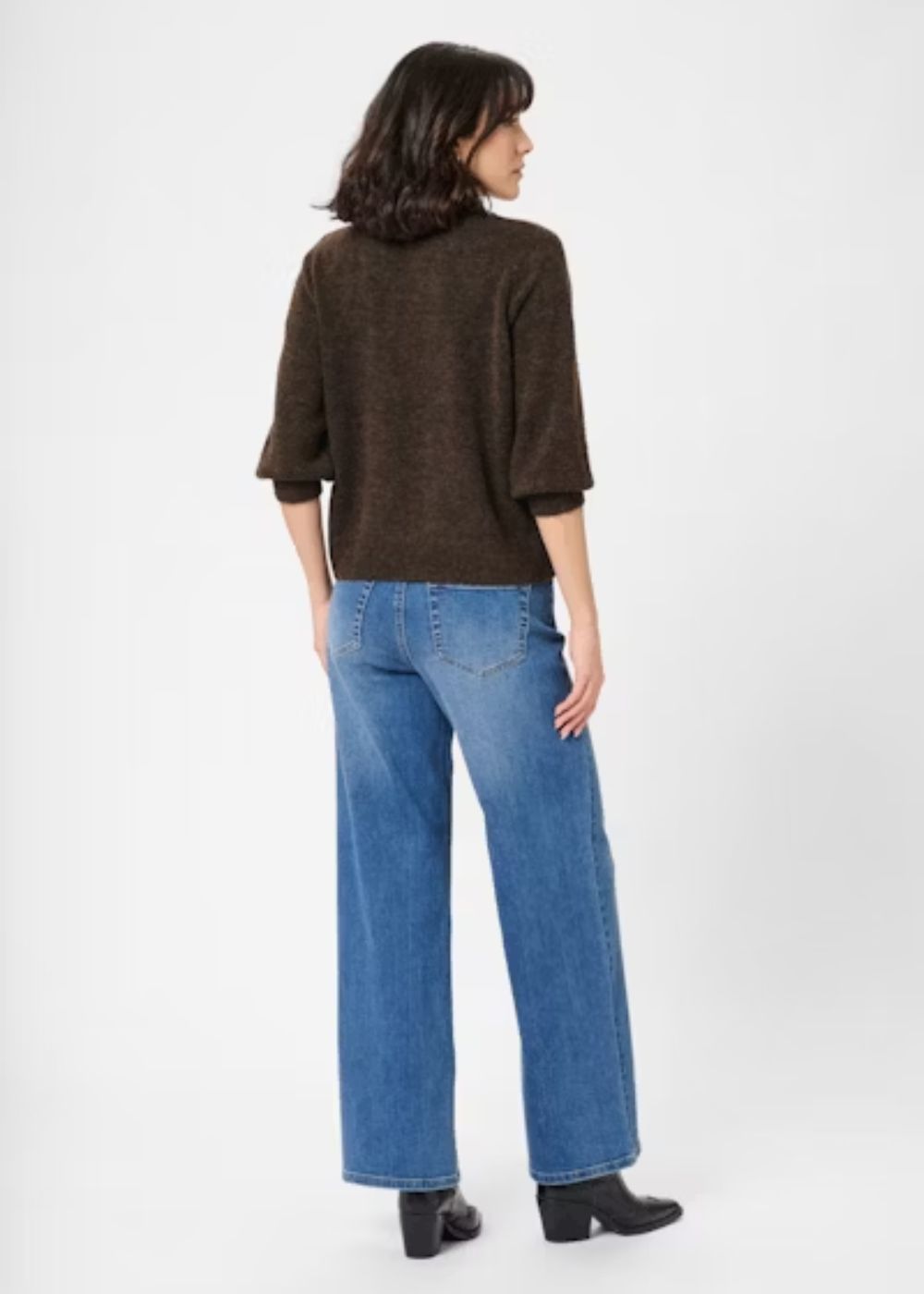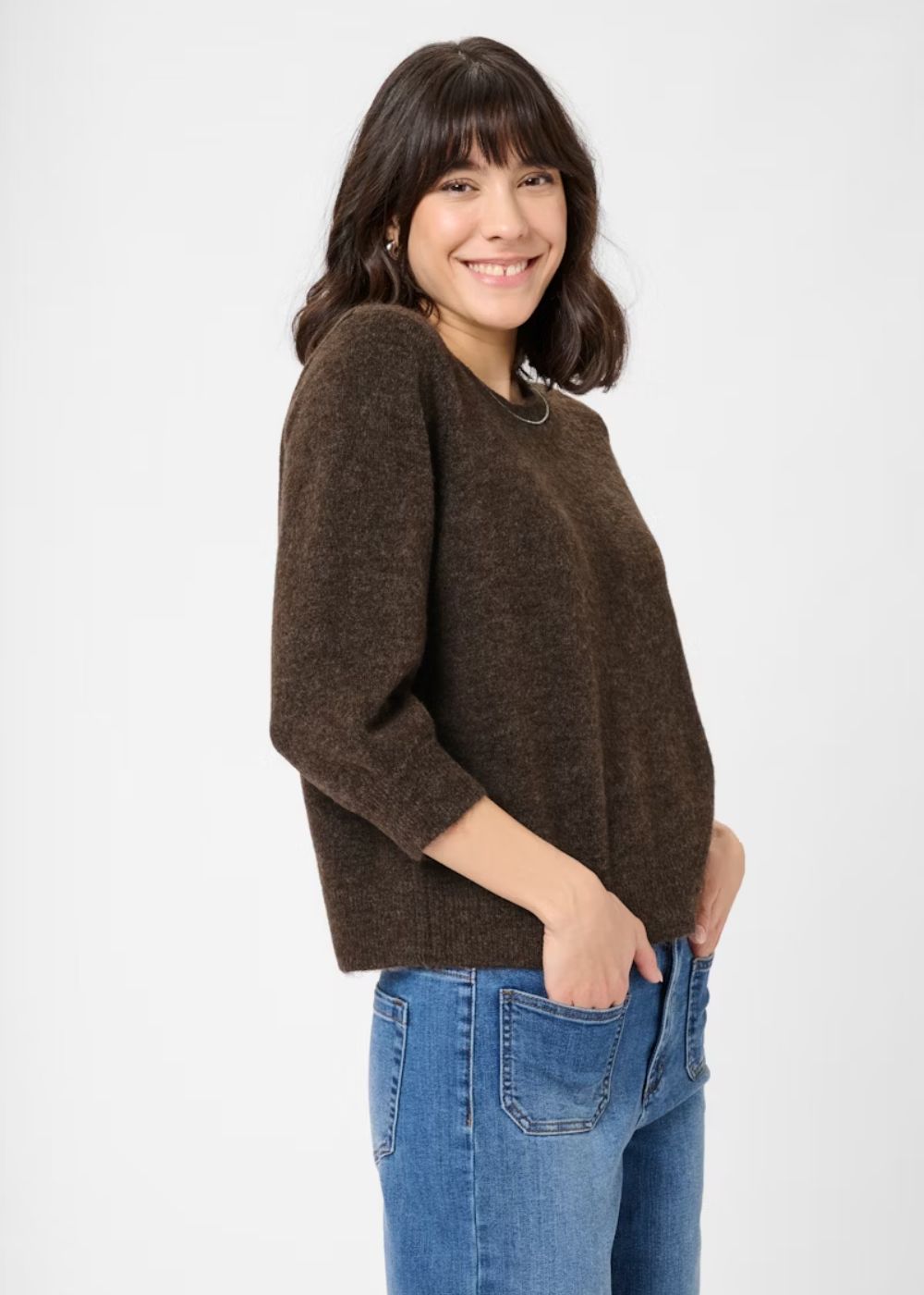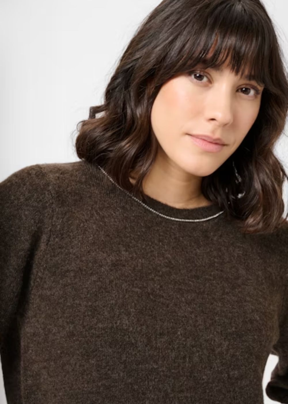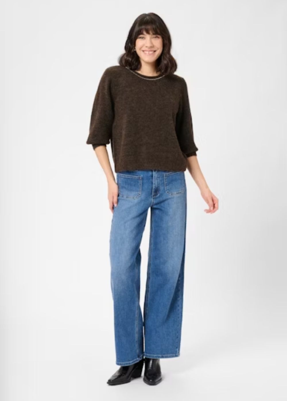 Sweater with a straight silhouette, soft finish, classic crew neckline with subtle embellishment. Features relaxed gathered sleeves and ribbed cuffs for understated style.