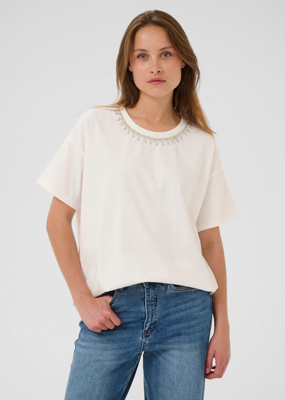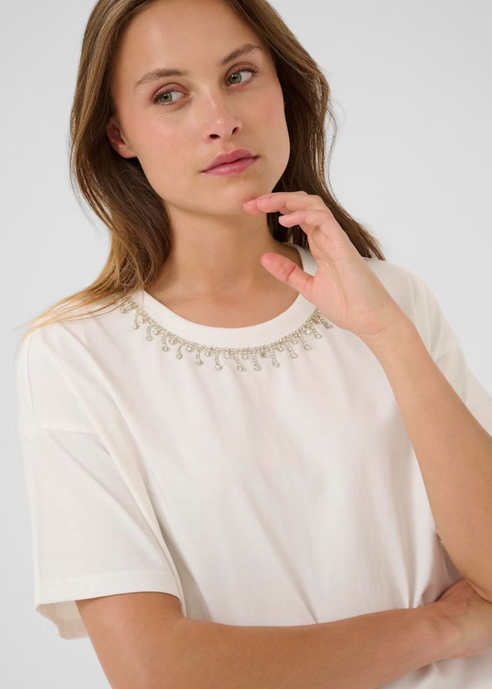 This relaxed fit T-shirt with short sleeves and a classic crew neckline features elegant stud embellishments. Comfortable and suitable for various occasions, it easily enhances both casual and smart-casual outfits.