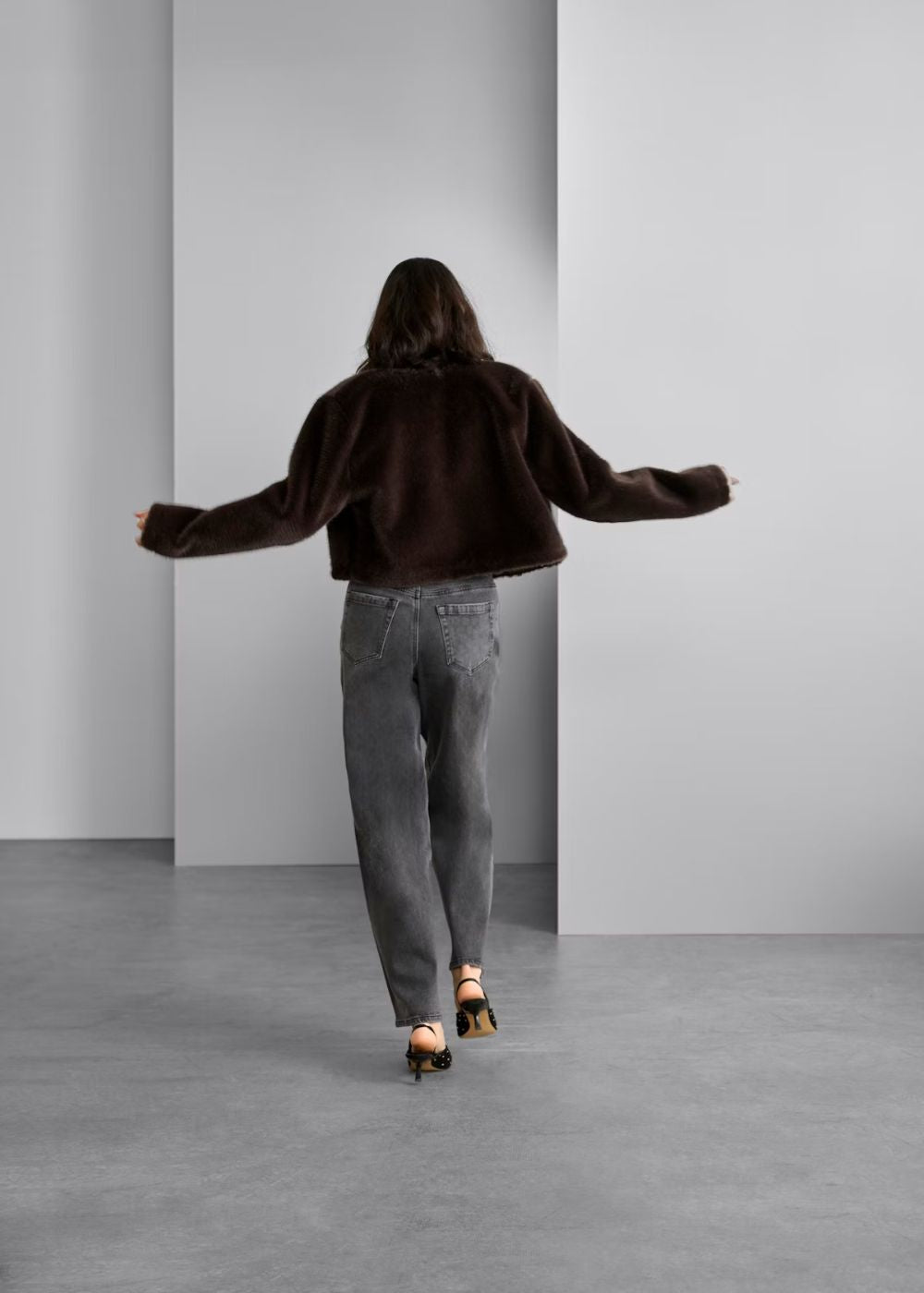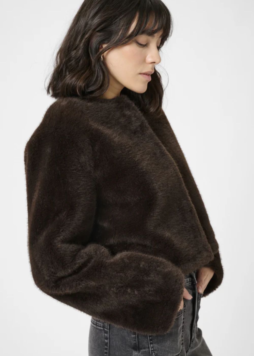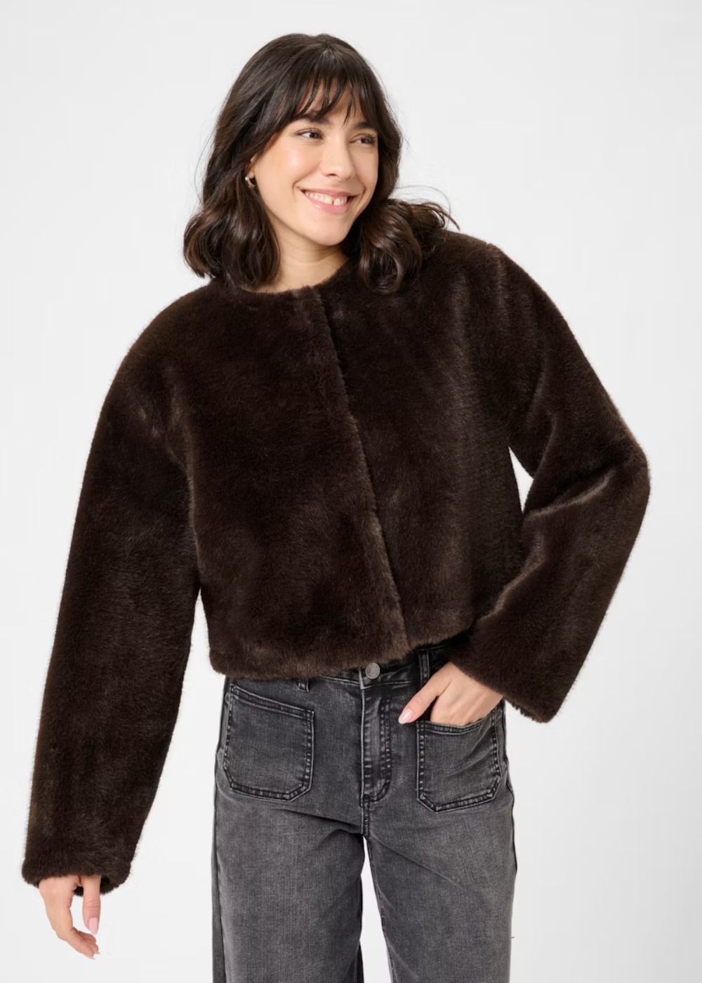 Short faux fur jacket with a soft, shaggy texture and a straight silhouette. Open front, long sleeves and a round neck create a minimalist, modern look.