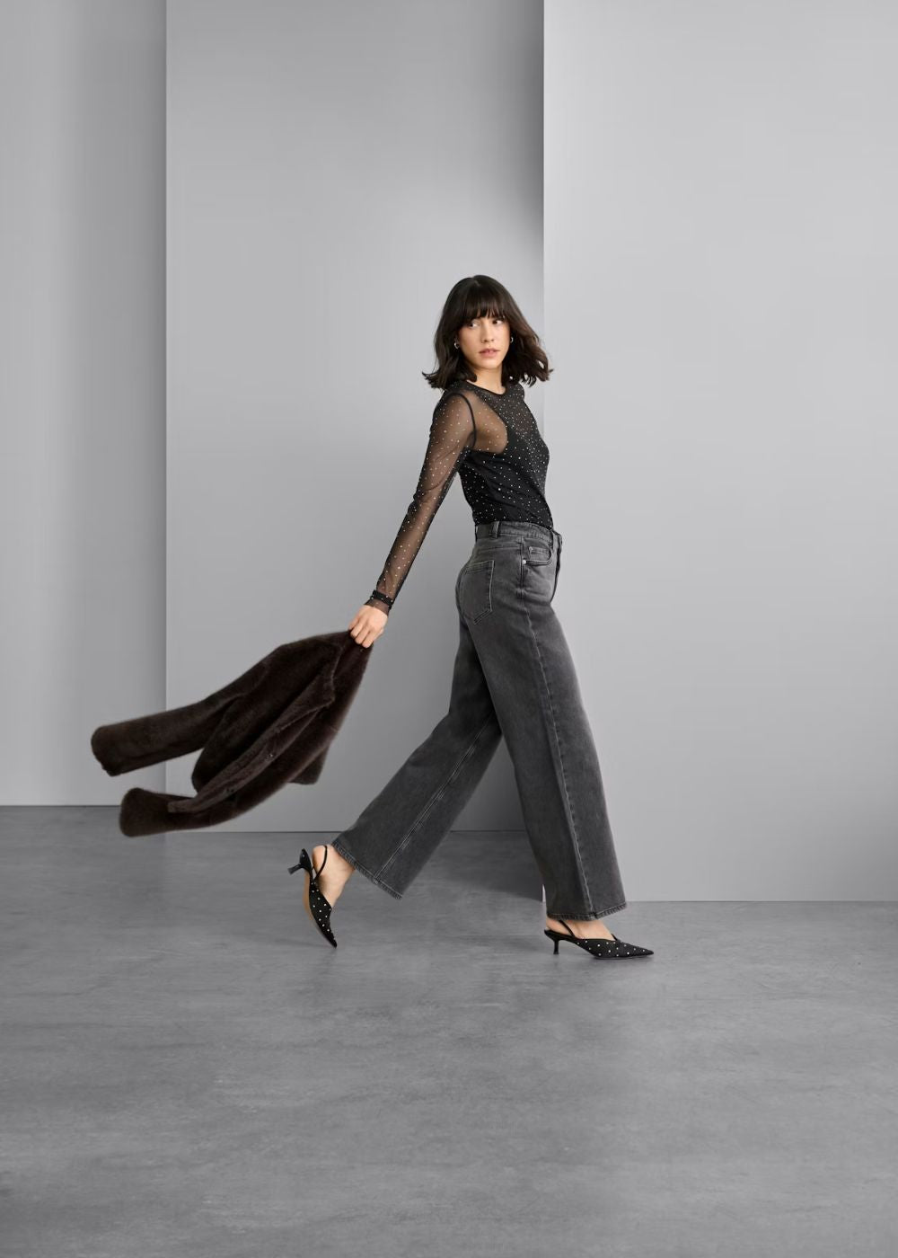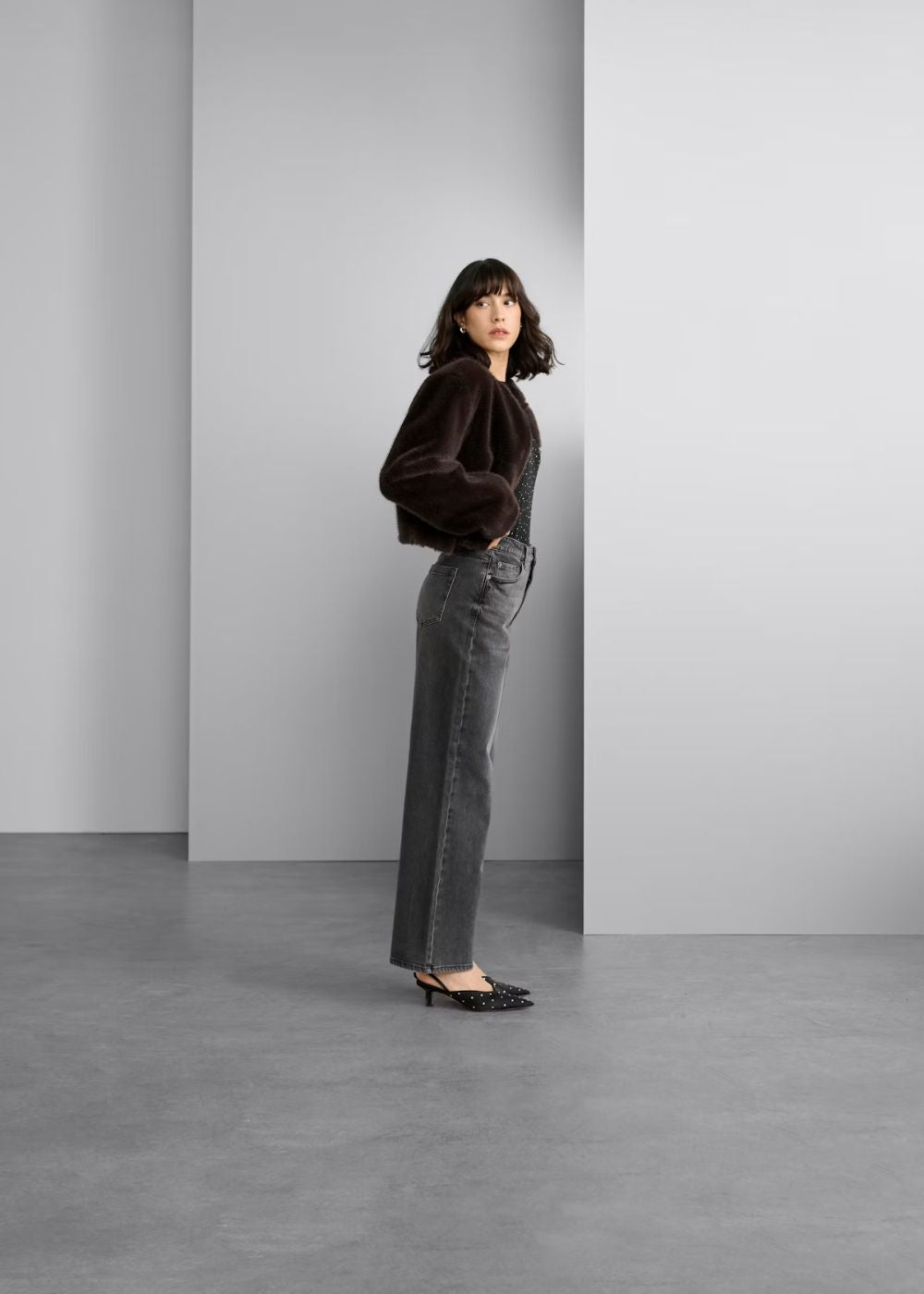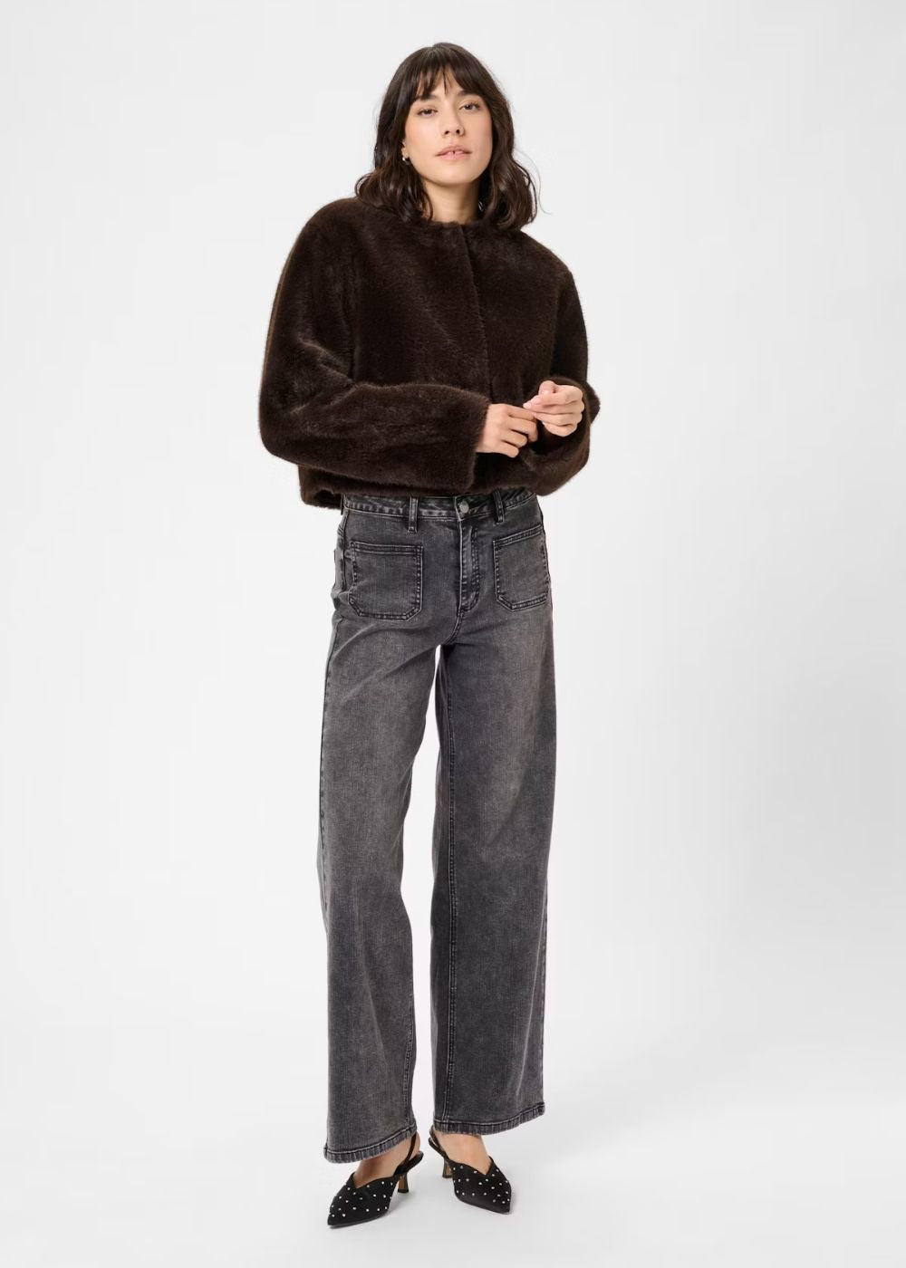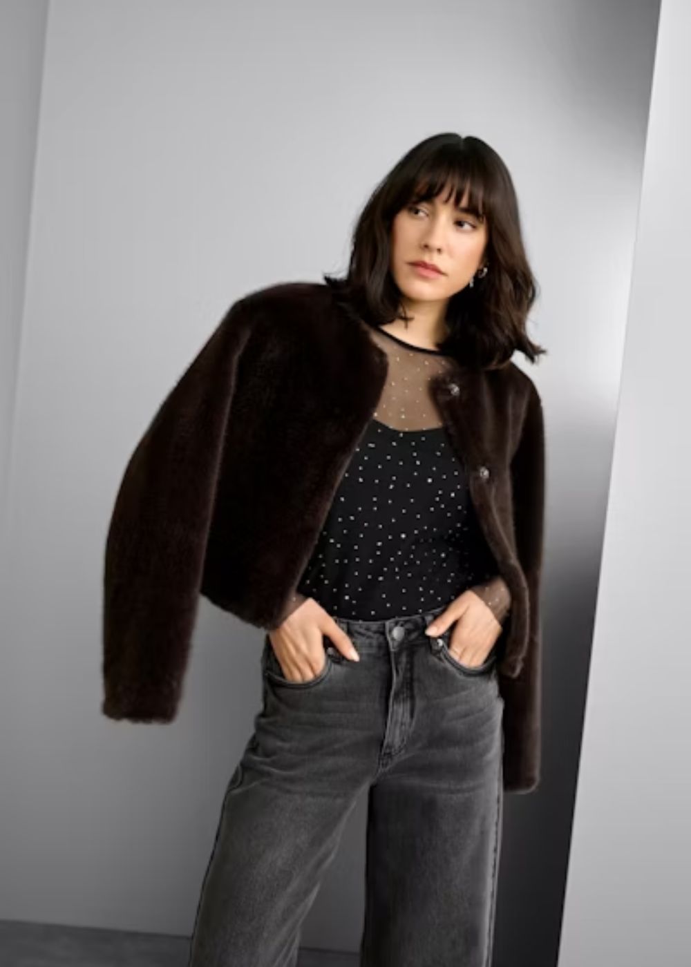 Short faux fur jacket with a soft, shaggy texture and a straight silhouette. Open front, long sleeves and a round neck create a minimalist, modern look.