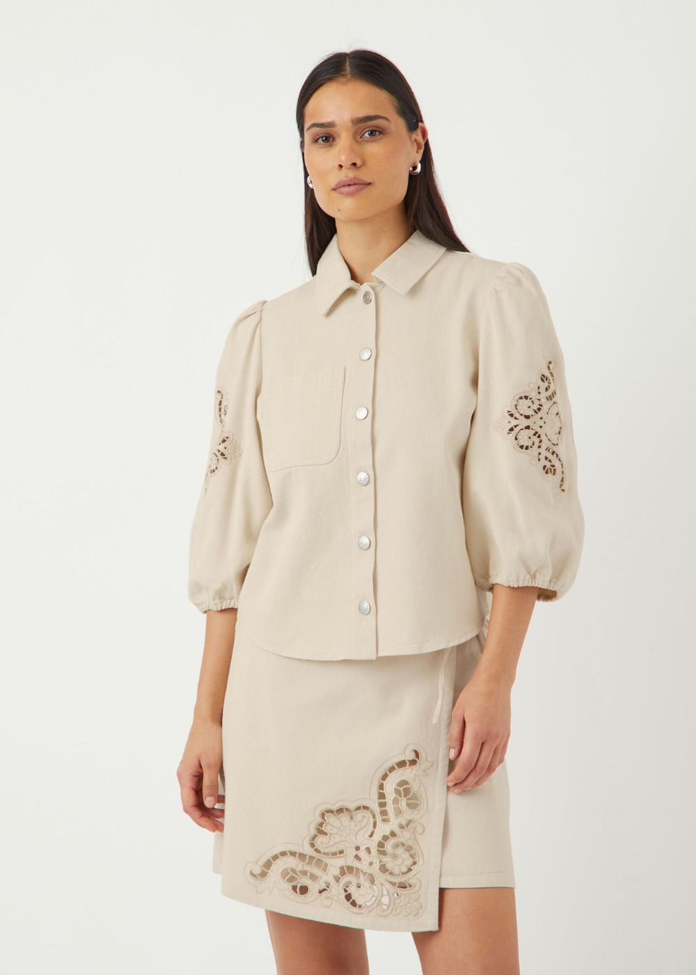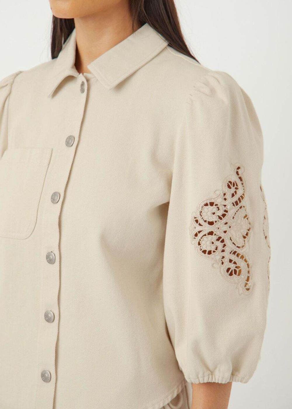 Elevate your wardrobe with the YASKILMO 3/4 SHIRT - FEST. Made with 100% organic cotton, this luxurious shirt features delicate broderie anglaise detailing and a classic button fastening. The 2/4 sleeves and shirt collar add a touch of sophistication to any outfit. Upgrade your style with this exclusive piece.