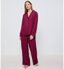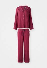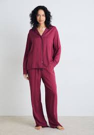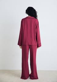This pyjama set brings together classic elegance with modern comfort in perfect harmony. A timeless button-down top pairs beautifully with wide-cuffed trousers, creating a sophisticated silhouette that transforms your evening routine into something special. You'll want to go to bed earlier just to curl up in these luxurious pyjamas that feel as good as they look.Two-piece pyjama set with timeless appealButton-down shirt featuring classic collar designWide leg pants with convenient side pockets, wide cuffs and elegant pipingSoft and shiny striped Jacquard fabric for refined texture100% certified Lenzing EcoVero viscose fabric feels gentle against skin.