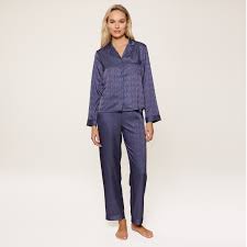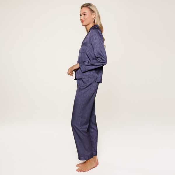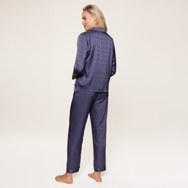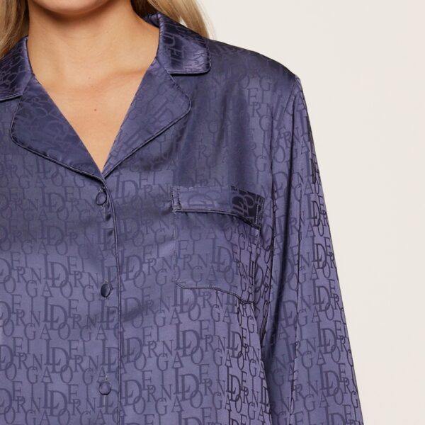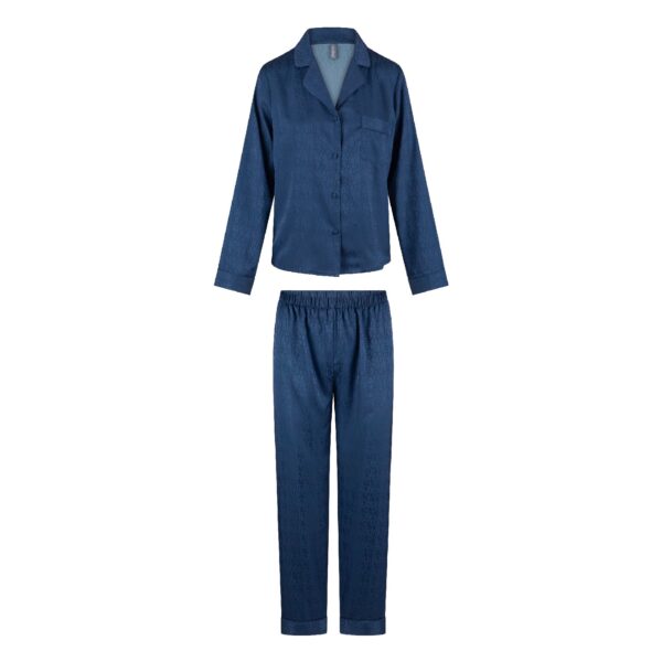 “Gift comfort. Gift luxury. Our Lounge Gift Set.” This pyjama gift set is a luxury pyjama set consisting of long trousers and a long-sleeved blouse made of a beautiful satin fabric. The blouse has button closures and a front breast pocket. "LD" is sewn onto the breast pocket. The trousers have an elastic waistband and straight legs.