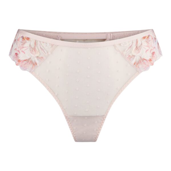 “Crème Pink: subtle, soft, and simply stunning!” The front of the thong consists of both embroidery and mesh, which is super comfortable. The back is completely mesh. The thong is semi-transparent.