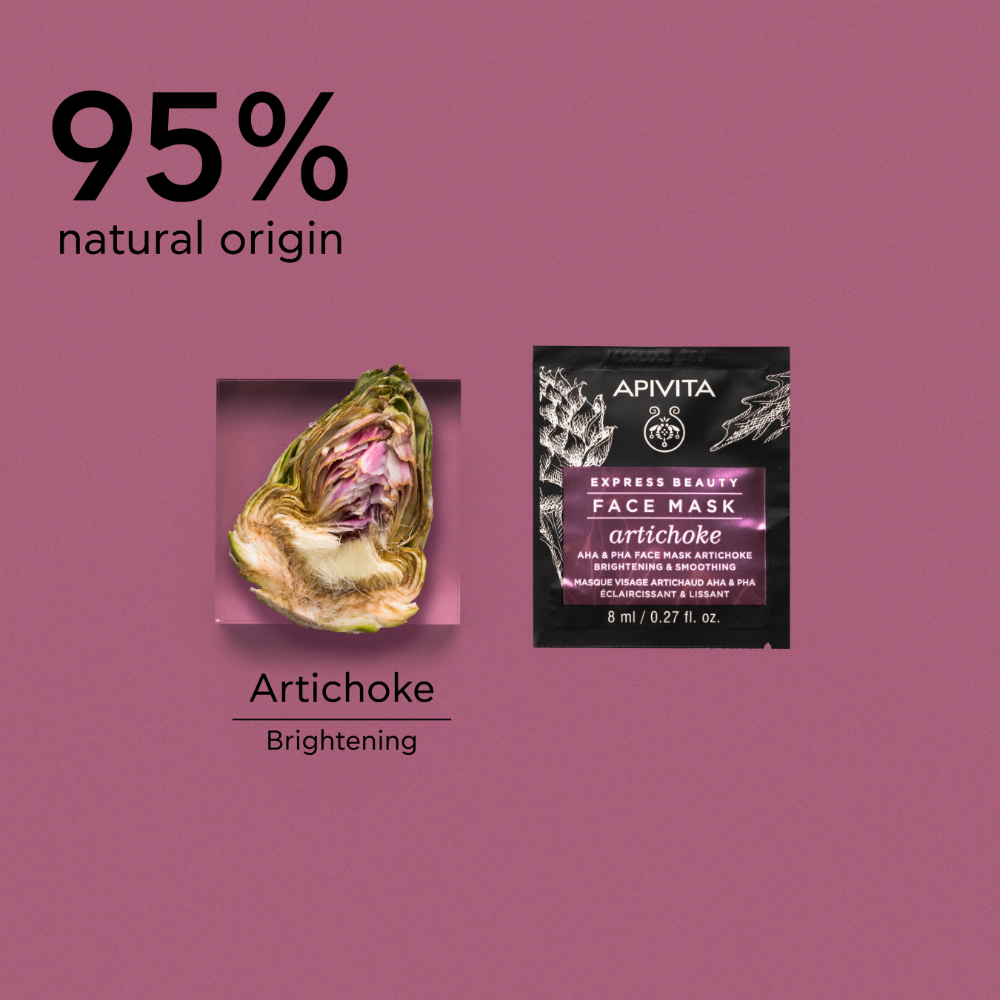 EXPRESS BEAUTY AHA & PHA face mask with artichoke, the delicious Mediterranean vegetable with the impressive purple flower that blooms in the early summer and brightens up the complexion, while reducing the size of the pores.