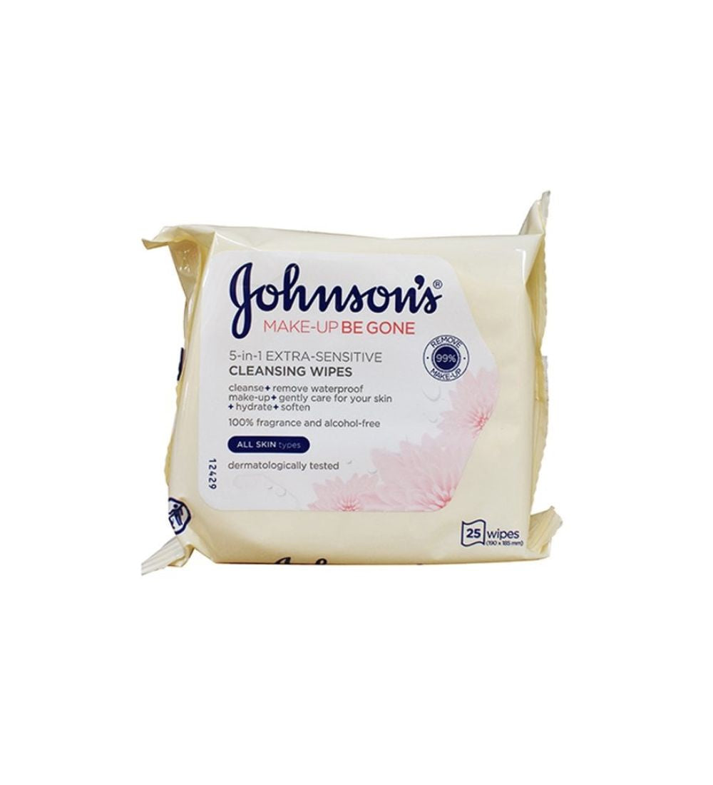 Johnson's 5-in-1 extra sensitive cleansing wipes remove up to 99% of waterproof make-up.