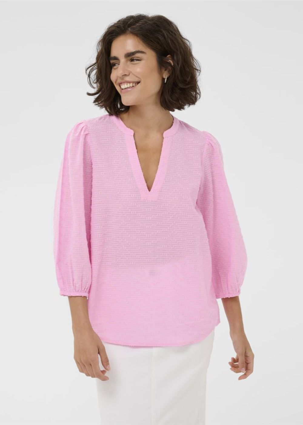 Designed in a regular fit, the flattering V-neck and billowing sleeves enhance its airy feel, making it perfect for both casual gatherings and sophisticated occasions. Created from 100% cotton with a textured finish.