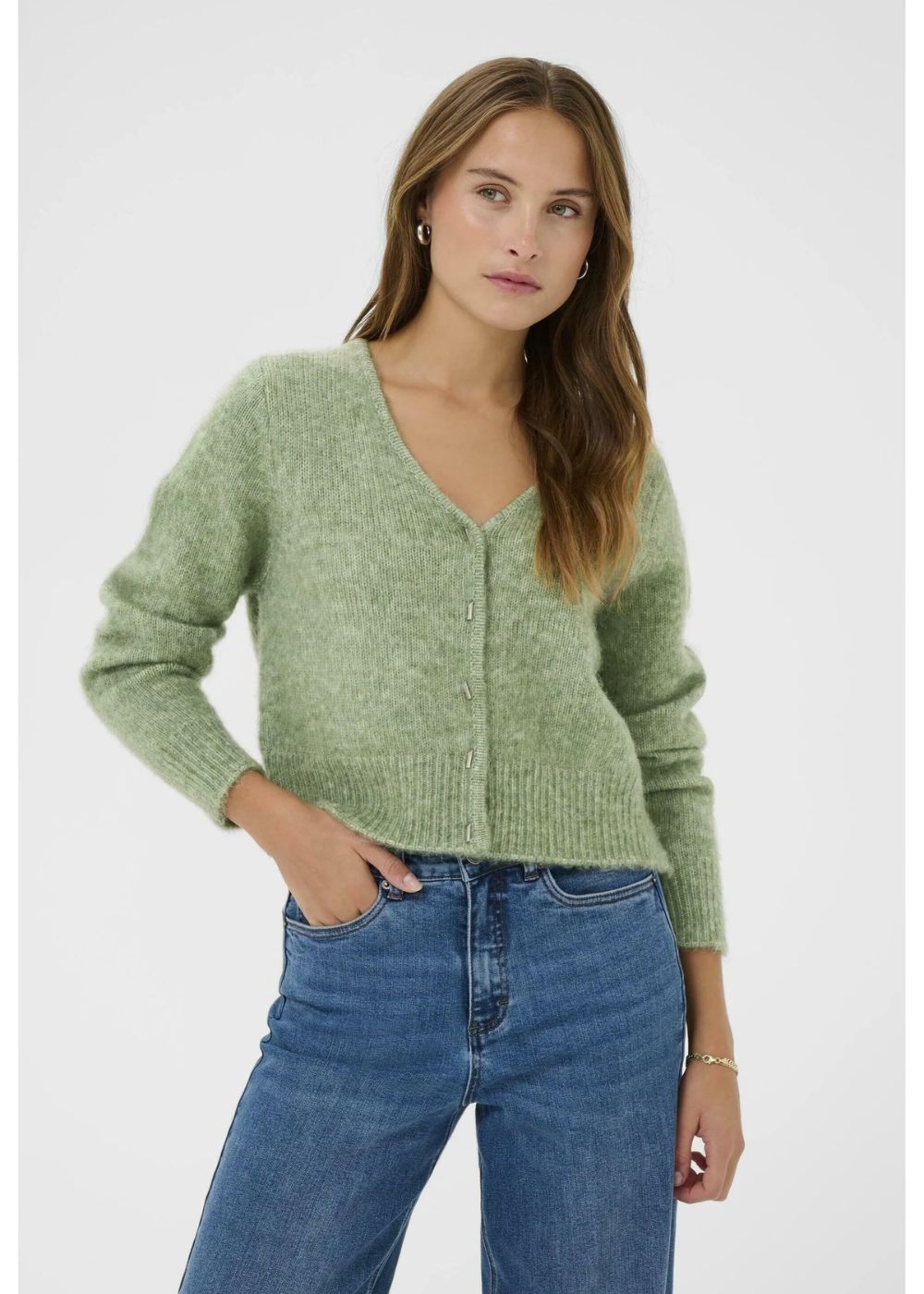 Effortlessly elevate your everyday wardrobe with the Kaffe KAmelania Cardigan in Sea Spray Melange. This relaxed fit layer features a flattering deep V-neckline and cropped sleeves. The soft, muted melange tone pairs seamlessly with virtually everything in your closet, making it the versatile piece you'll reach for season after season.