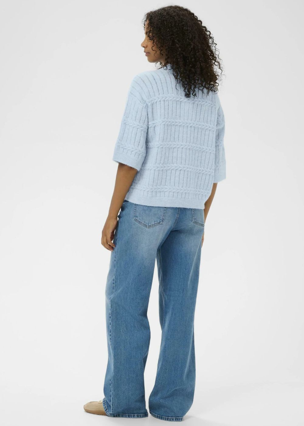 Textured knit sweater with a boxy silhouette. Features a crew neckline, elbow-length sleeves, and openwork vertical stripe pattern throughout for visual interest. Soft finish for a modern, effortless look.