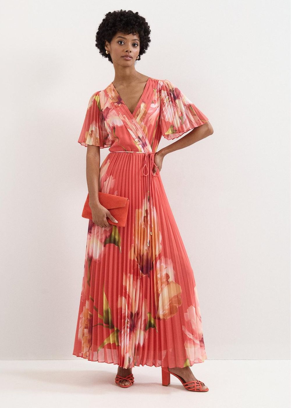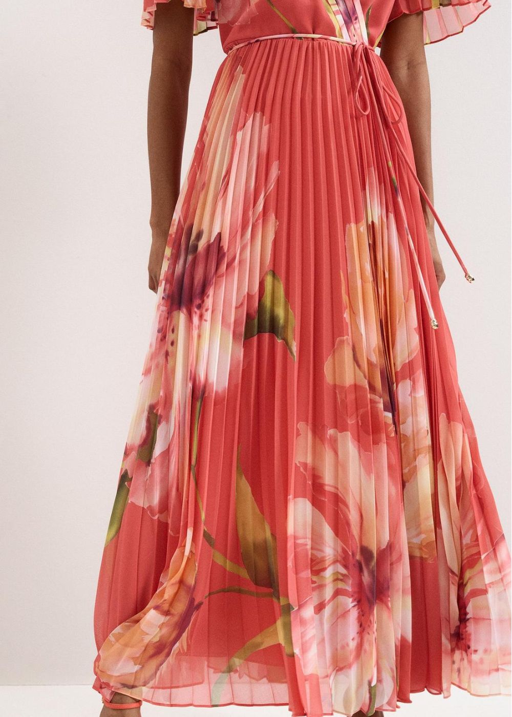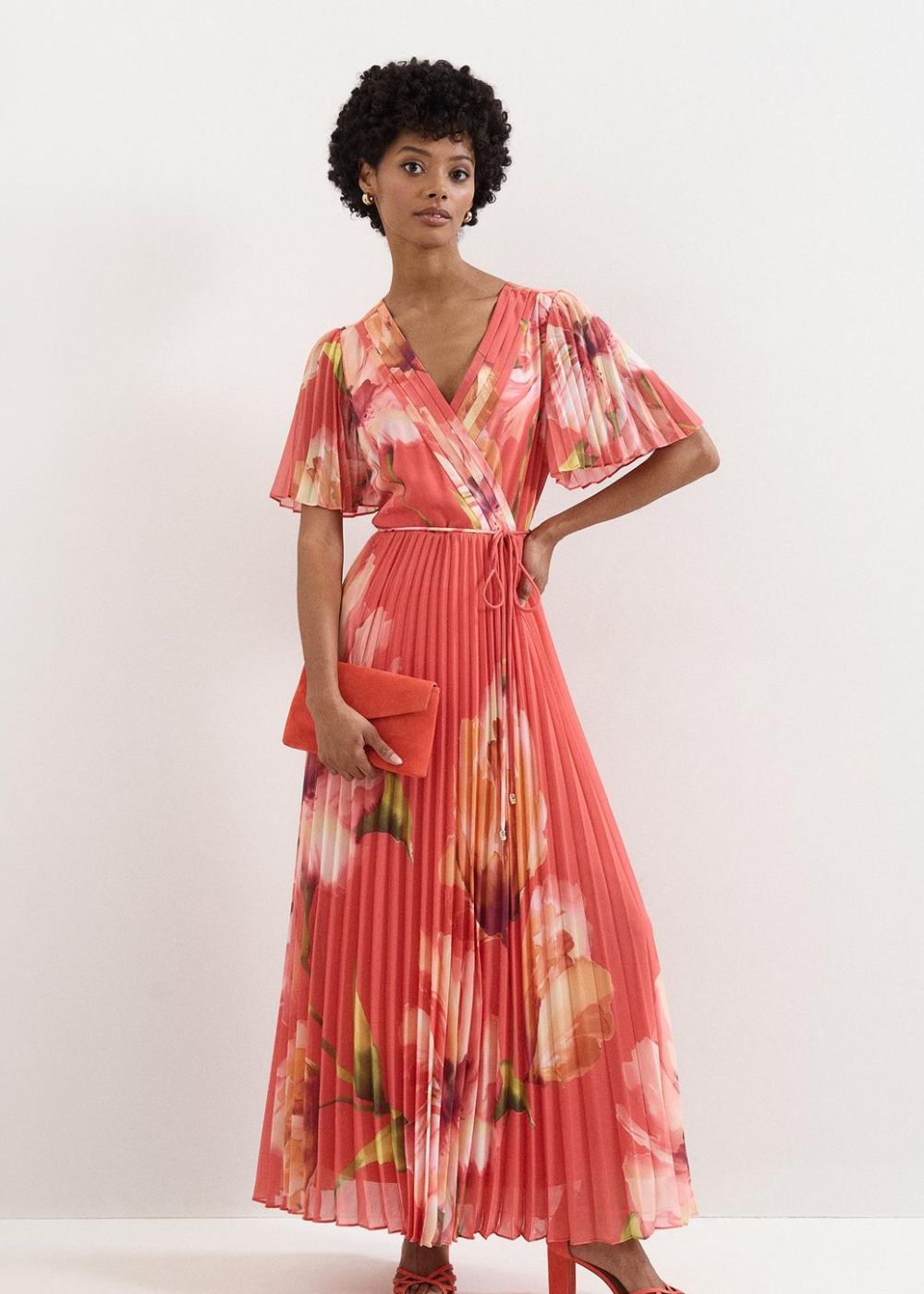 Our bestselling Abigail dress has arrived in a new print for the new season. Designed in a striking coral shade, this maxi dress features a statement floral design that will turn heads at every event. Featuring a modern V neckline, faux-wrap bodice and gorgeous pleating to the skirt and sleeves to add movement to the silhouette. Style with neutral accessories to let the dress do all the talking.